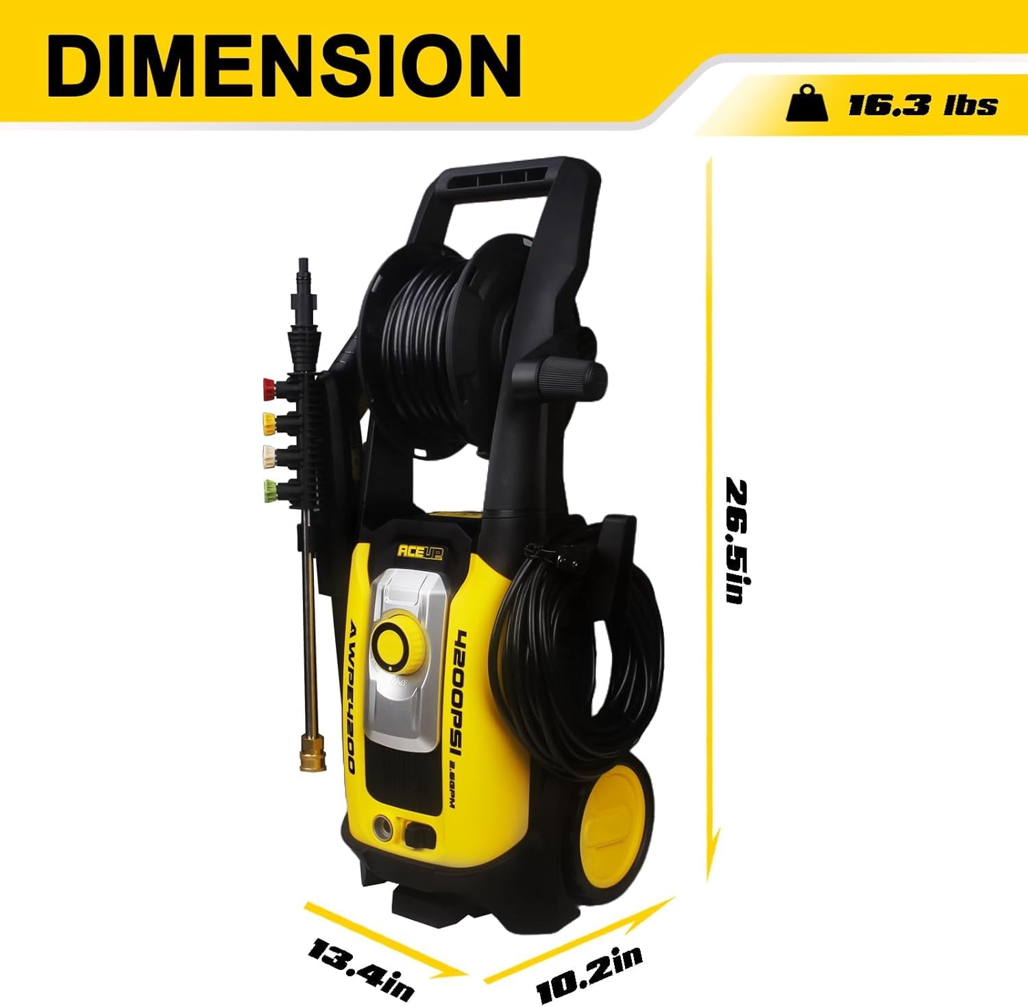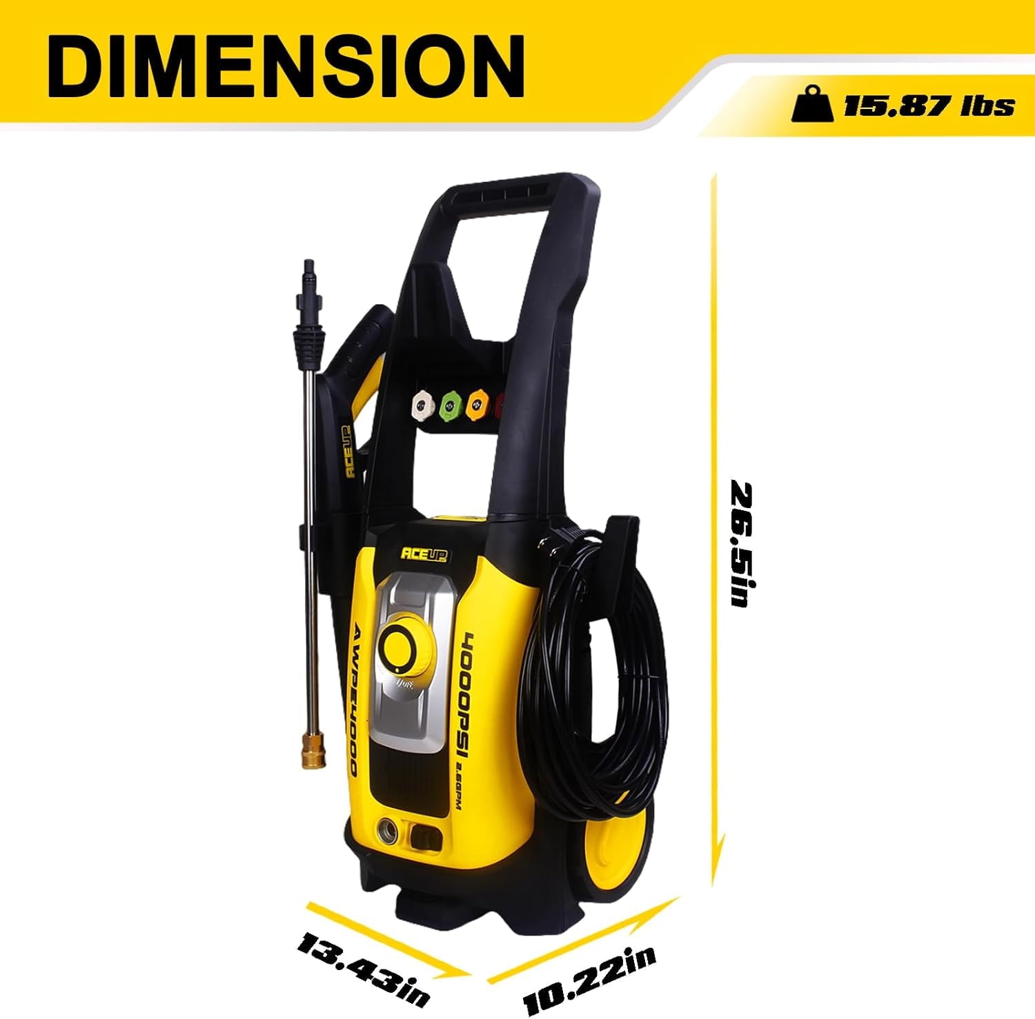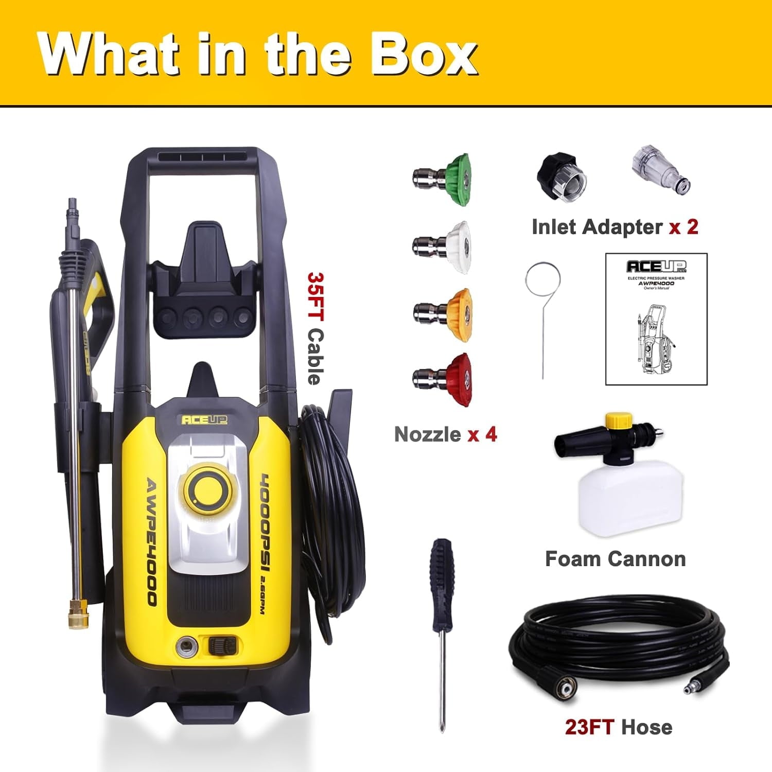 The Aceup Energy 4000 PSI Electric Pressure Washer is a powerful and versatile cleaning tool that can handle even the toughest jobs. With a maximum pressure of 4000 PSI and a water flow rate of up to 2.6 GPM, this pressure washer effectively removes old paint, oil, weeds, and other stubborn stains from cars, bicycles, fences, boats, and yards. Equipped with a 36-foot power cable, 23-foot high-pressure hose, and four quick-connect tips, this pressure washer is easy to set up and use. The Total Stop System (TSS) pump automatically shuts off when the trigger is not engaged, saving energy and prolonging the pump’s life, while the safety lock feature protects children from accidentally triggering the spray gun. Backed by a 1-year limited warranty, this pressure washer is a must-have tool for anyone seeking professional-grade cleaning results.