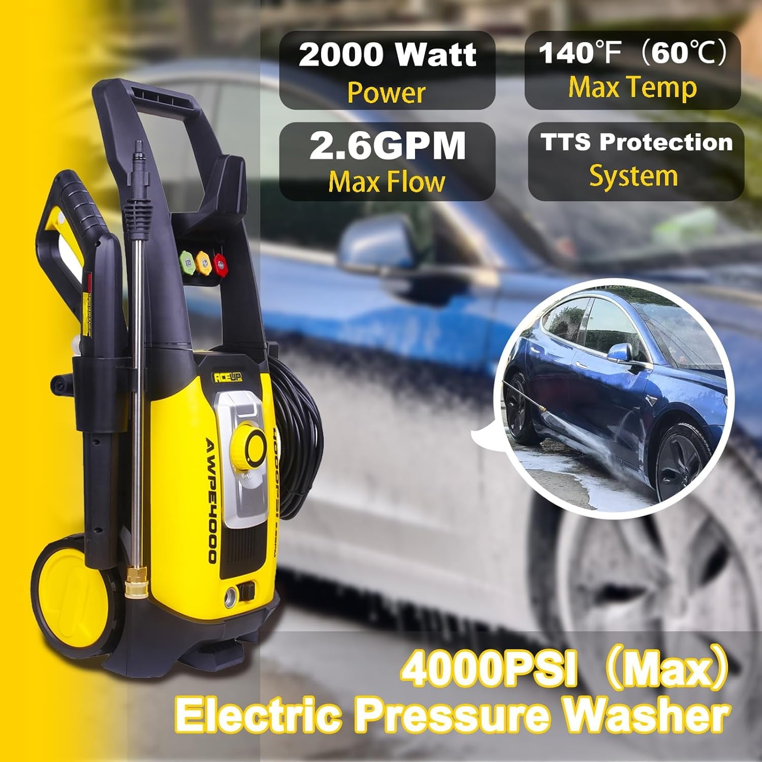 - Powerful 4000 PSI high pressure washer with a 2.6 GPM water flow rate, providing professional-grade cleaning performance for a variety of surfaces and applications.