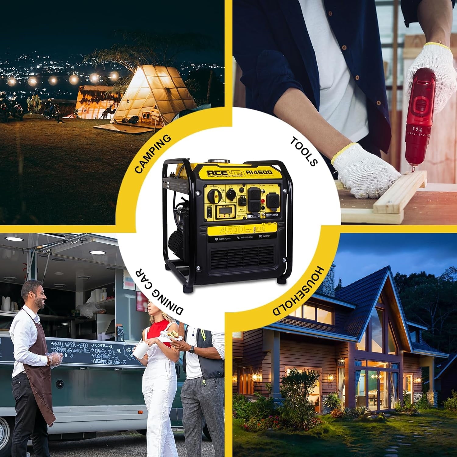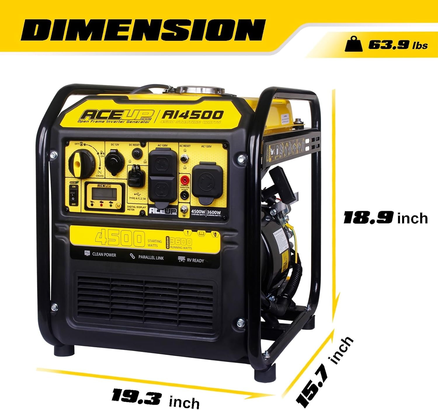 The Aceup Energy 4500 Watt Open Frame Inverter Generator is a reliable and versatile power source, delivering 4500 peak watts and 3600 running watts from its 223cc 4-stroke OHV engine. With up to 10 hours of runtime on a 2.65-gallon fuel tank, this EPA-compliant generator features an intelligent digital display for real-time monitoring of voltage, frequency, and power output. It offers multiple outlets, including a 30A RV port, providing clean power for sensitive electronics like phones and TVs. Backed by a 1-year limited warranty and free lifetime technical support, this generator is an ideal choice for outdoor activities, home backup, and various commercial applications.