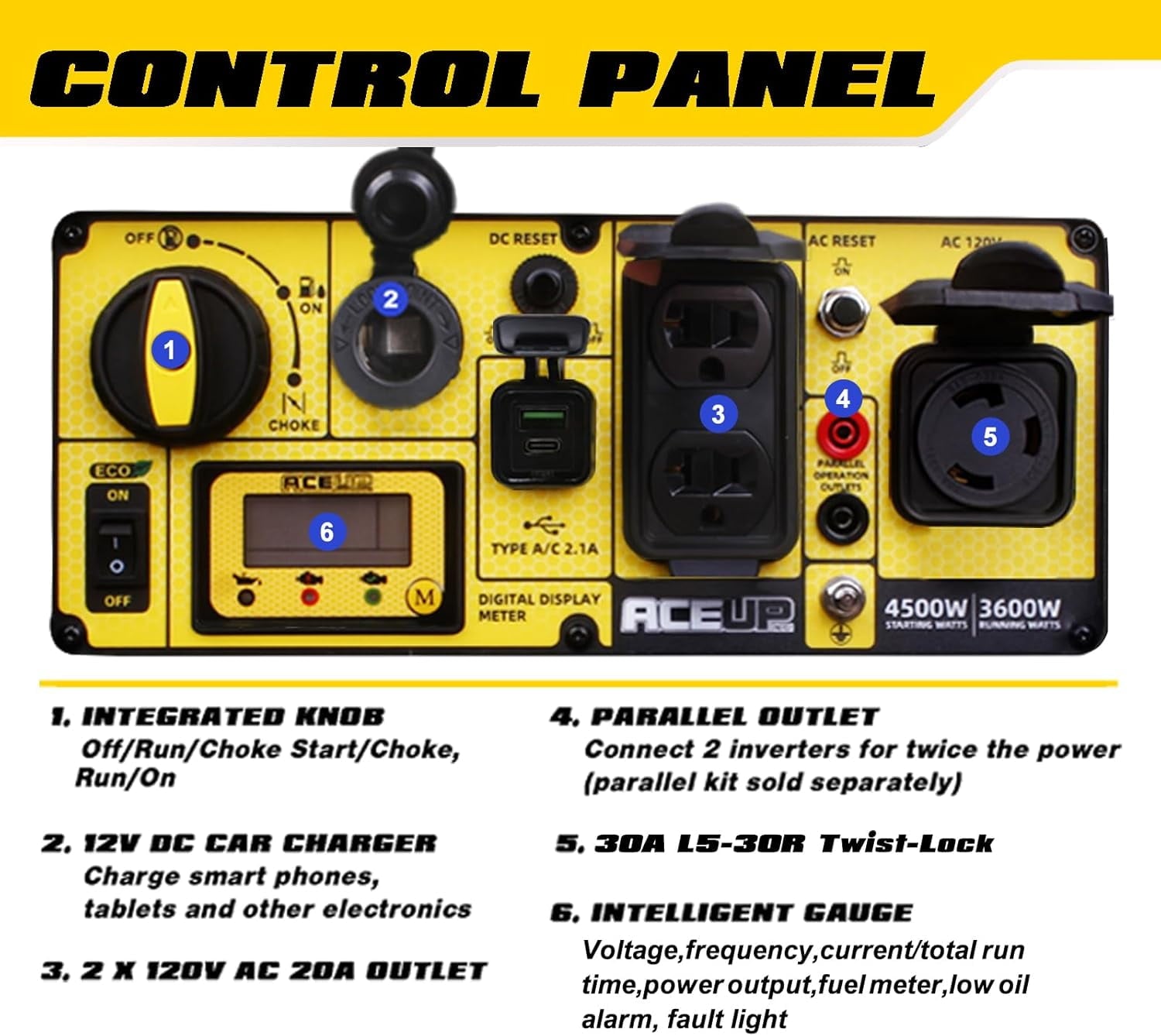 - Includes 120V AC two 20A outlets and one 30A Twist-Lock, one 12V DC 8.3A outlet, Type A/C ports; Parallel ready to connect 2 generators for twice the power (parallel kit sold separately)