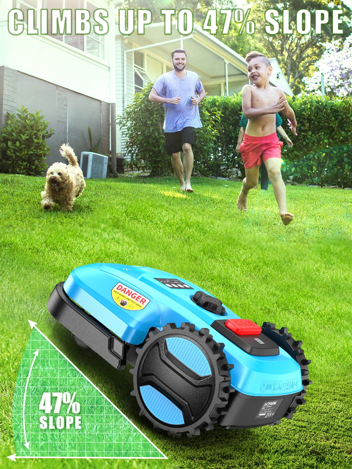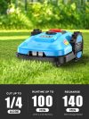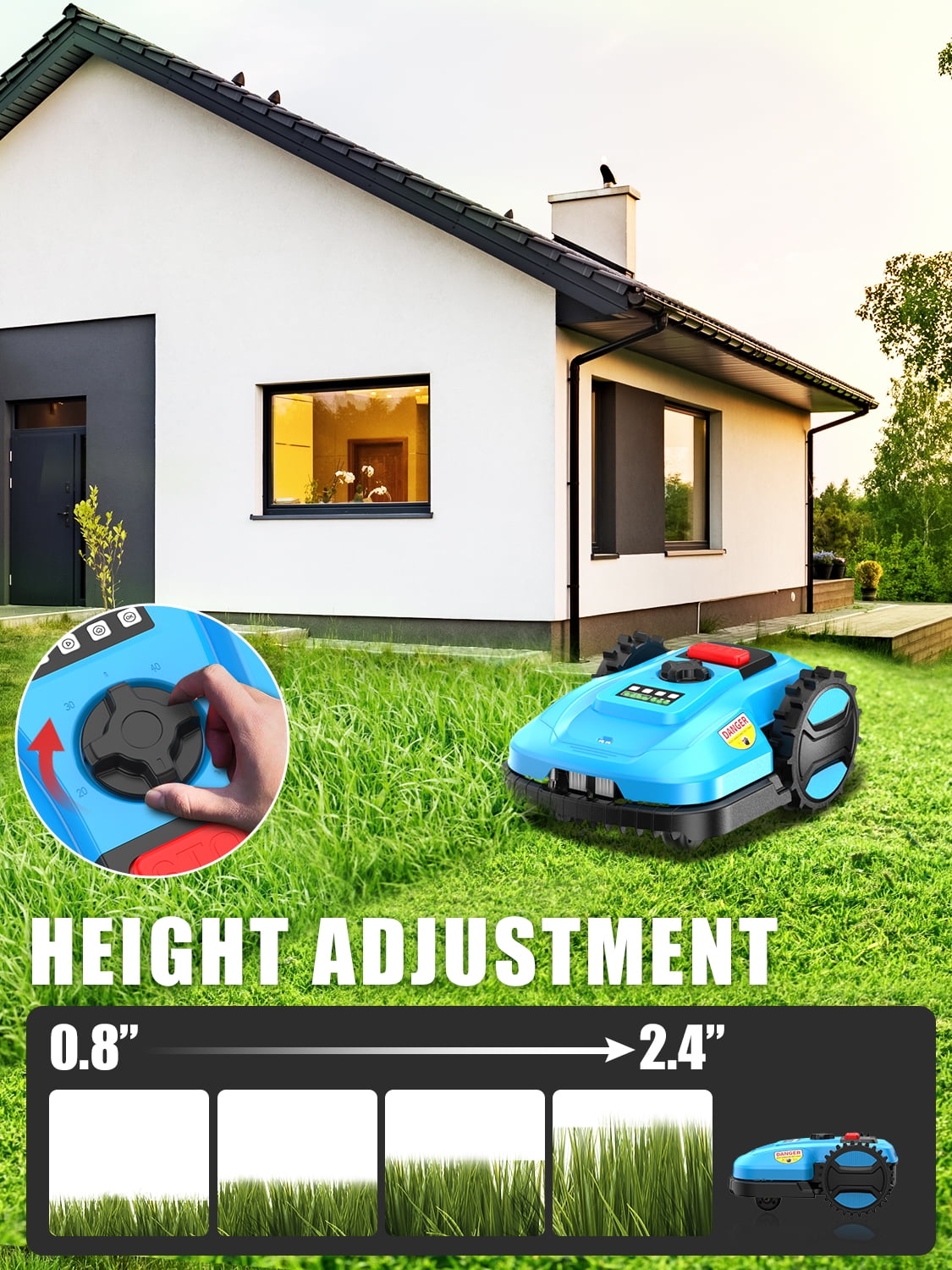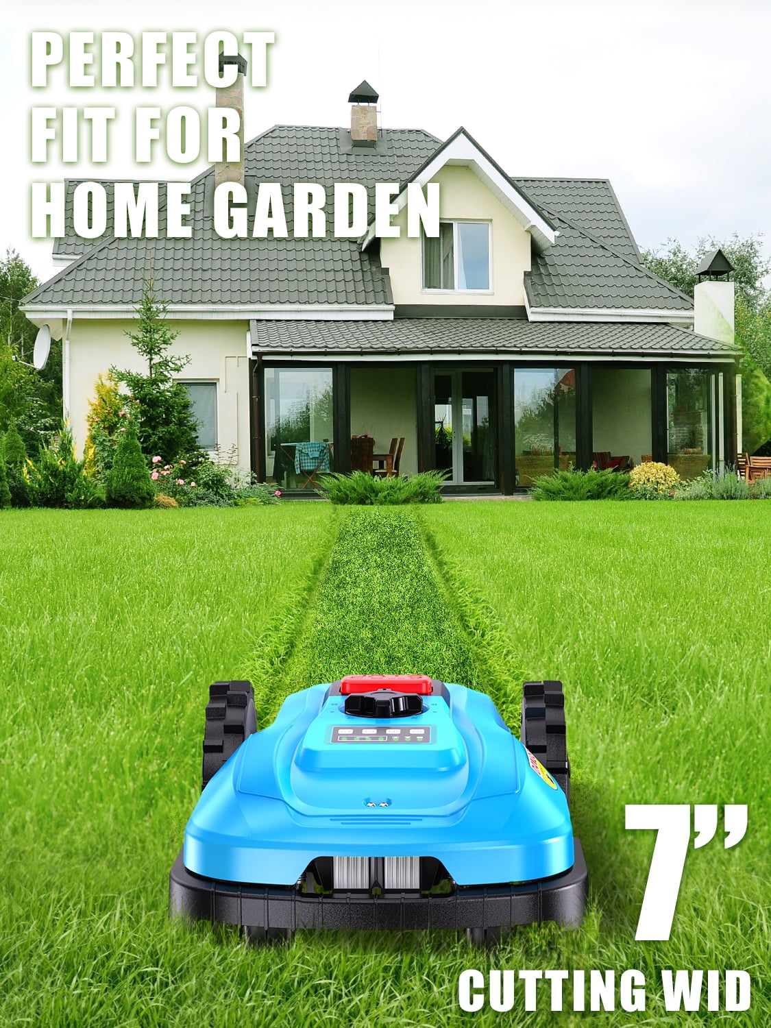 - AUTOMATIC ROBOT LAWN MOWER: This Robot lawn mower suitable for gardens 1/4 acres. It uses the same three-blade rotating disc cutting mechanism. It has a 7-inch cutting width and can be adjusted to provide cutting heights of between 0.80 and 2.4 inches, and it can handle lawns with up to a 47% slope. Robotic lawn mower automatically returns to its base station when it gets low on battery or senses rain.