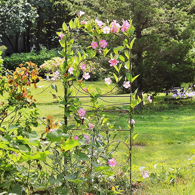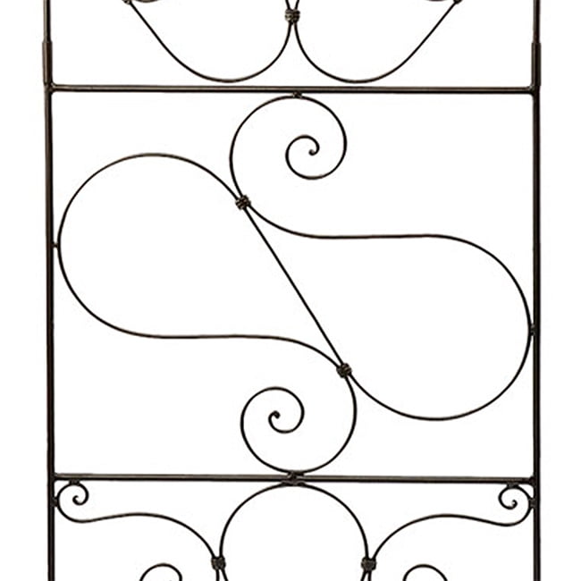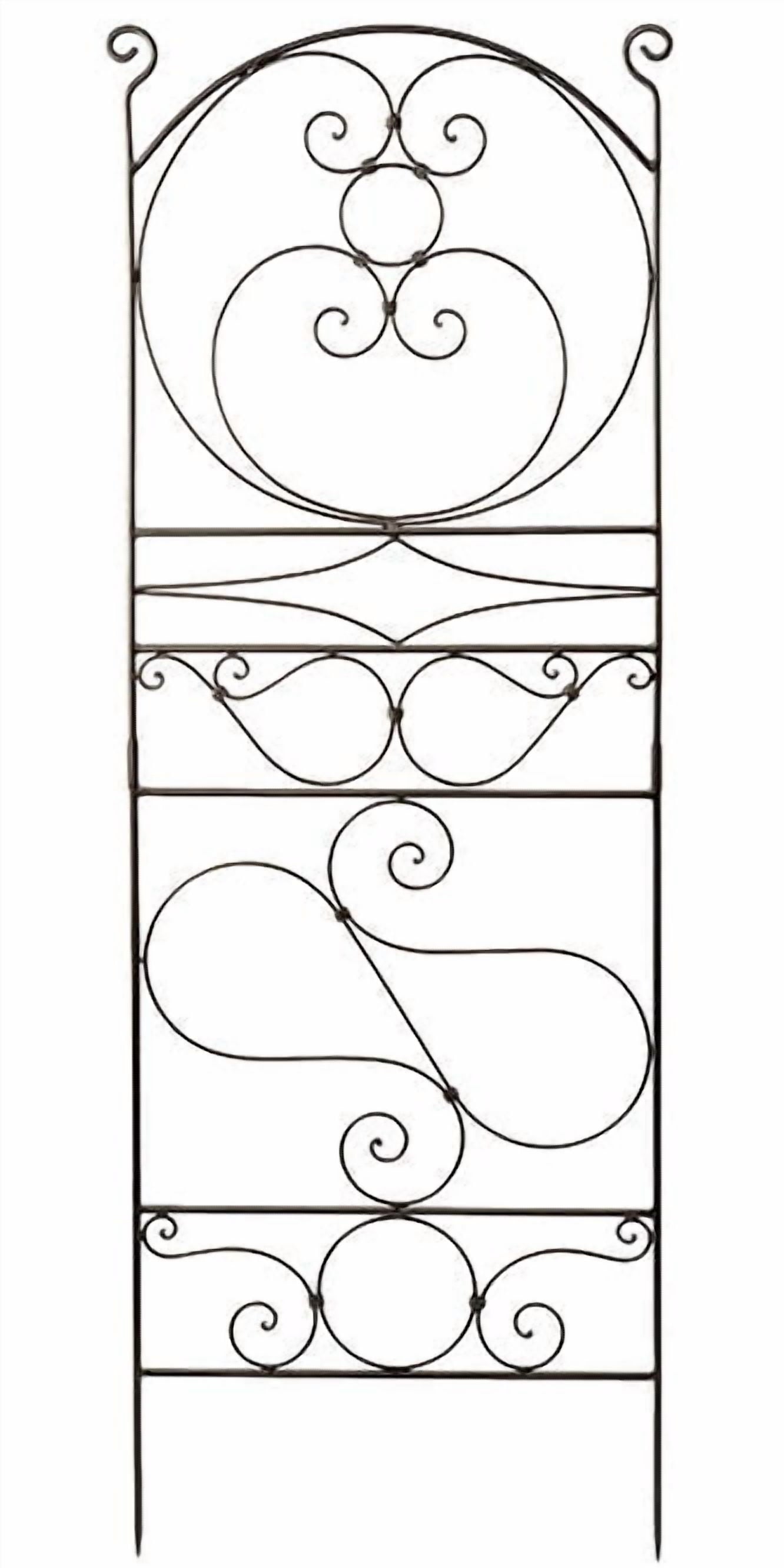 Add delicate curves and Italian-inspired style to your landscaping using this Achla Brown Ferro Firenze Trellis. Placing a trellis within your flowerbed provides climbing plants plenty of support to grow upward, and this generous piece also offers unique shape and style. Two outwardly curved scrolls create the top of each side rail, enhancing the round rods and scrolling interior accents. They also add height to the unit, while an arched top and rectangular body complete the piece. A dark brown, powder coated finish meshes with your foliage, and the two pointed legs insert easily into soil. Its striking height will quickly capture attention, and the sturdy, wrought iron construction lasts for many seasons. Bring a bit of Italian architecture into your landscaping with this Brown Ferro Firenze Trellis. Some assembly required.