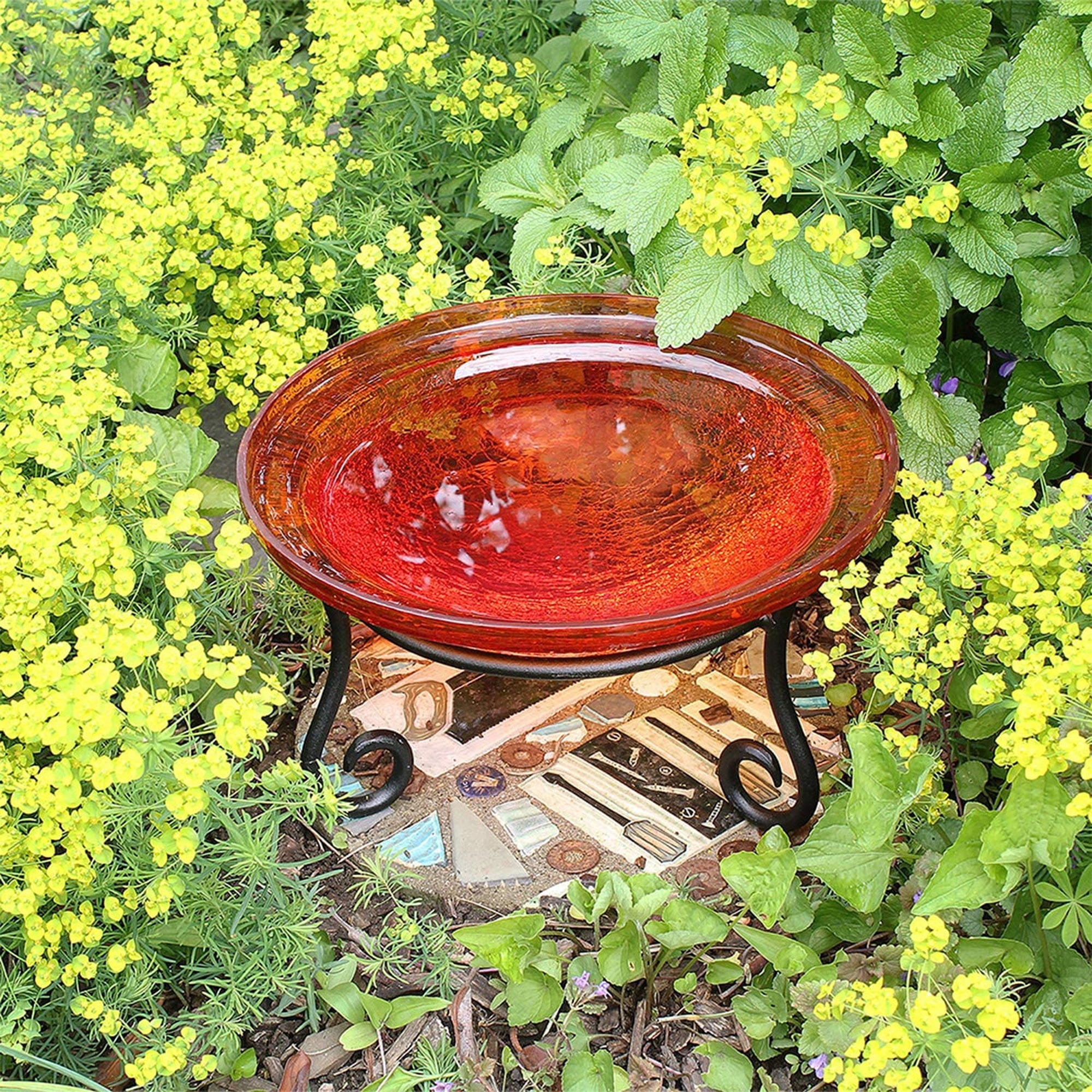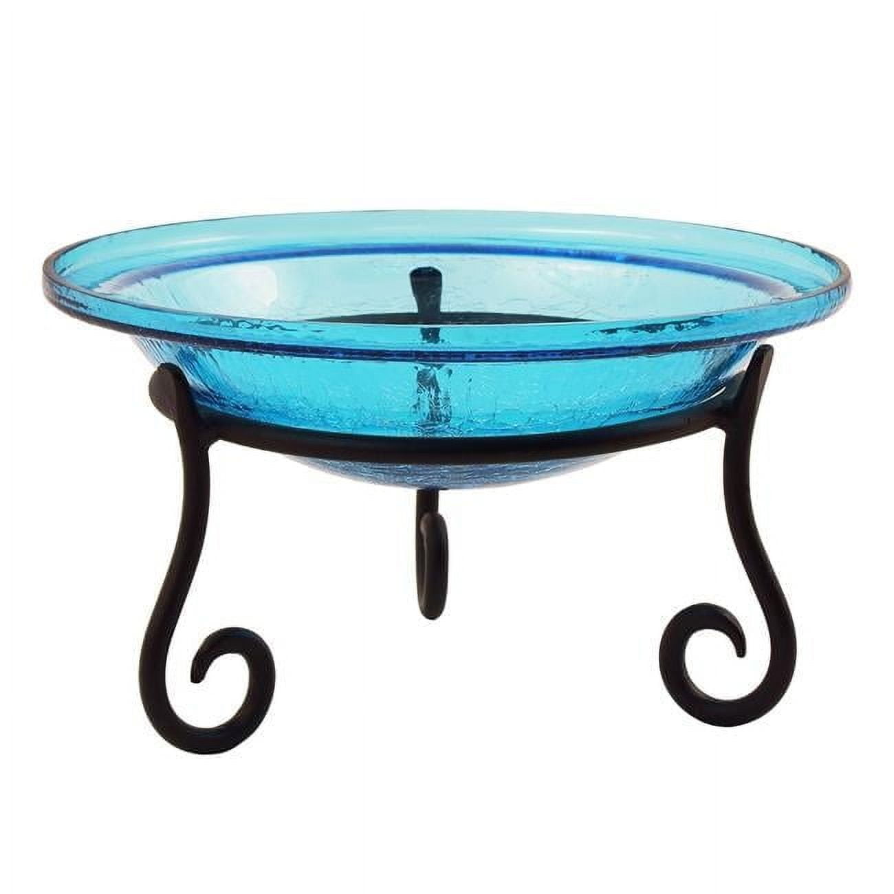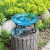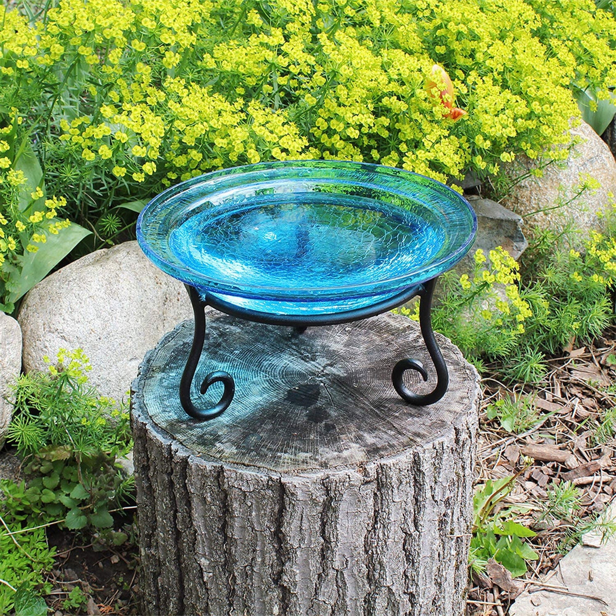- Vibrant crackled glass birdbath brings avian visitors, traditional garden design, and whimsy to any outdoor space