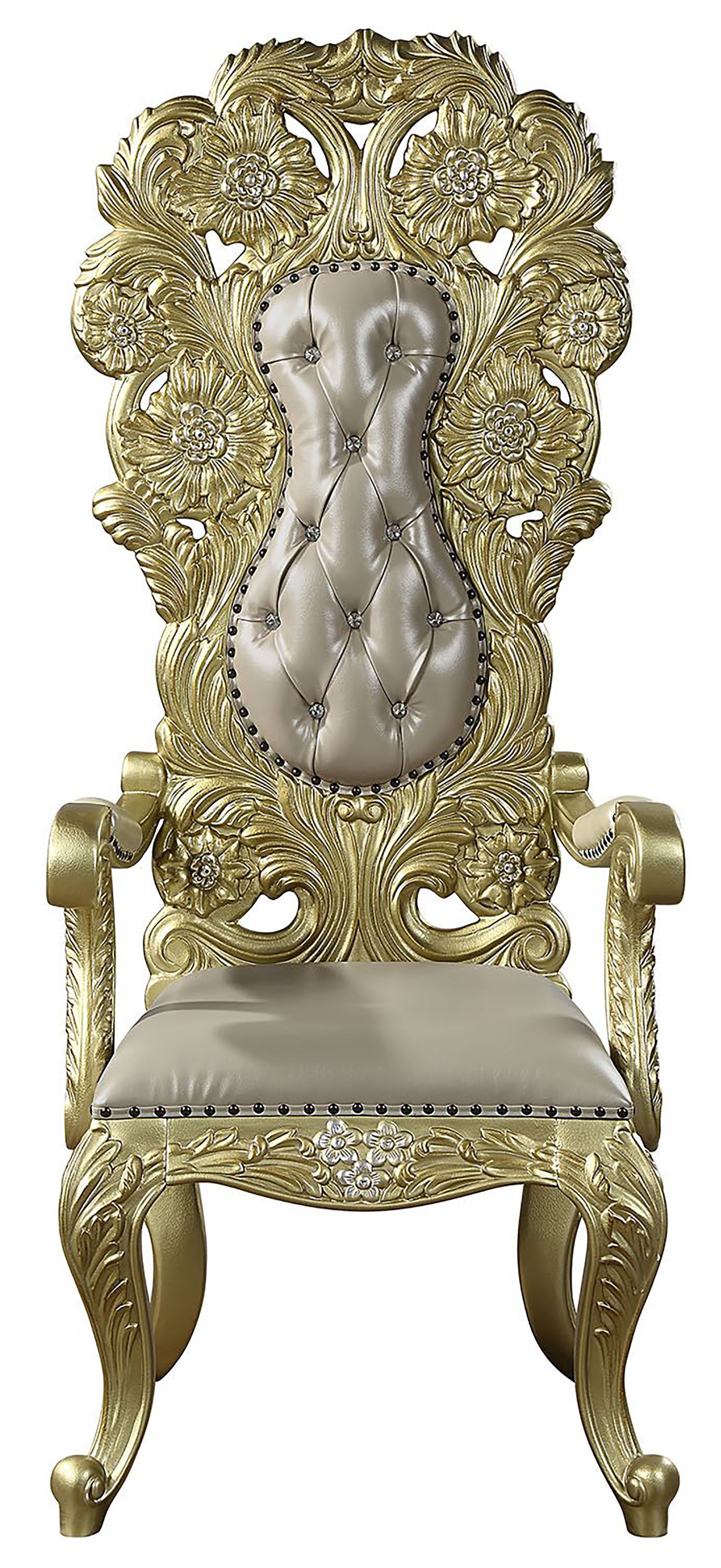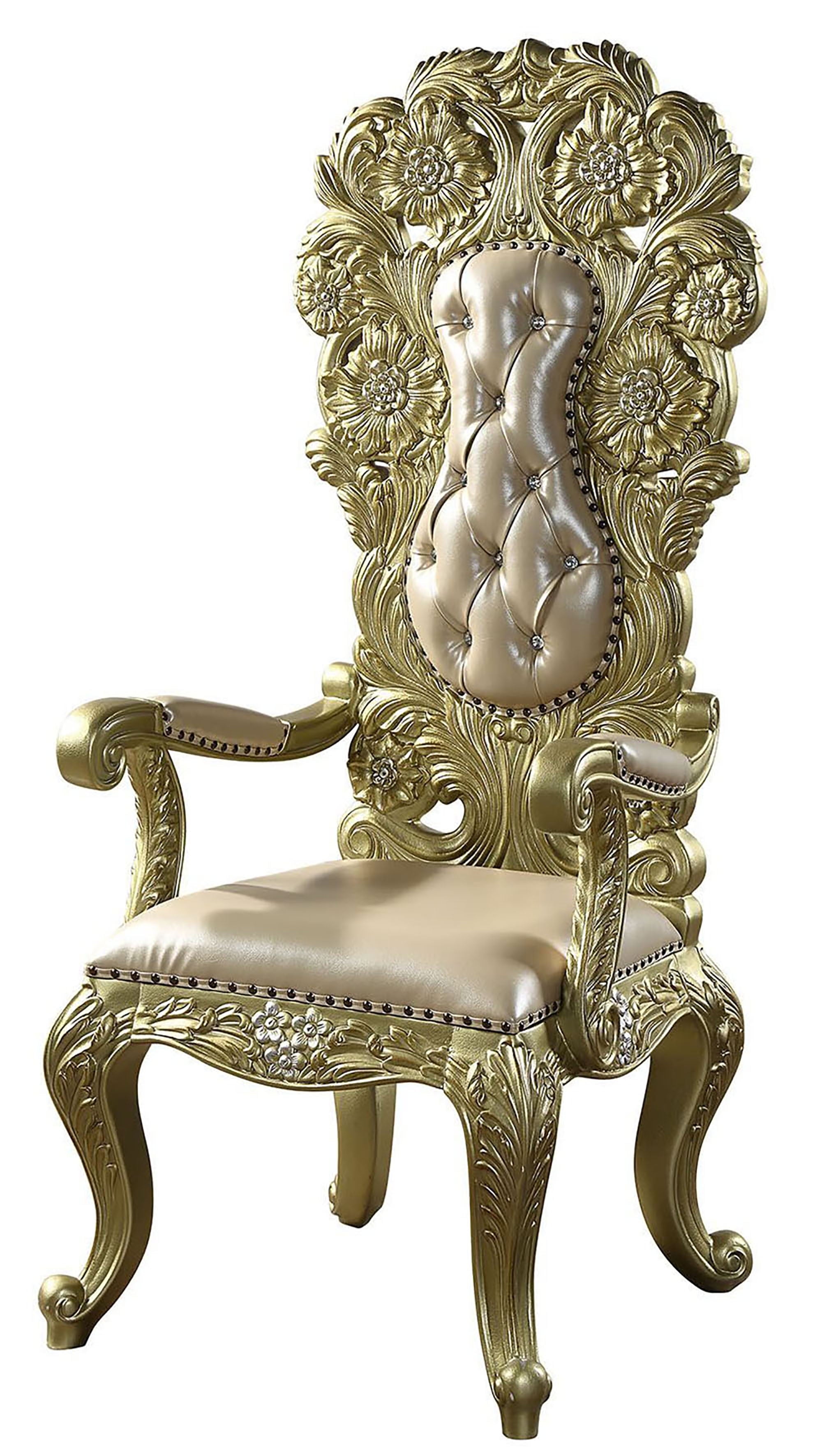 - Light gold synthetic leather and a gold finish bring opulence to this armchair