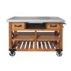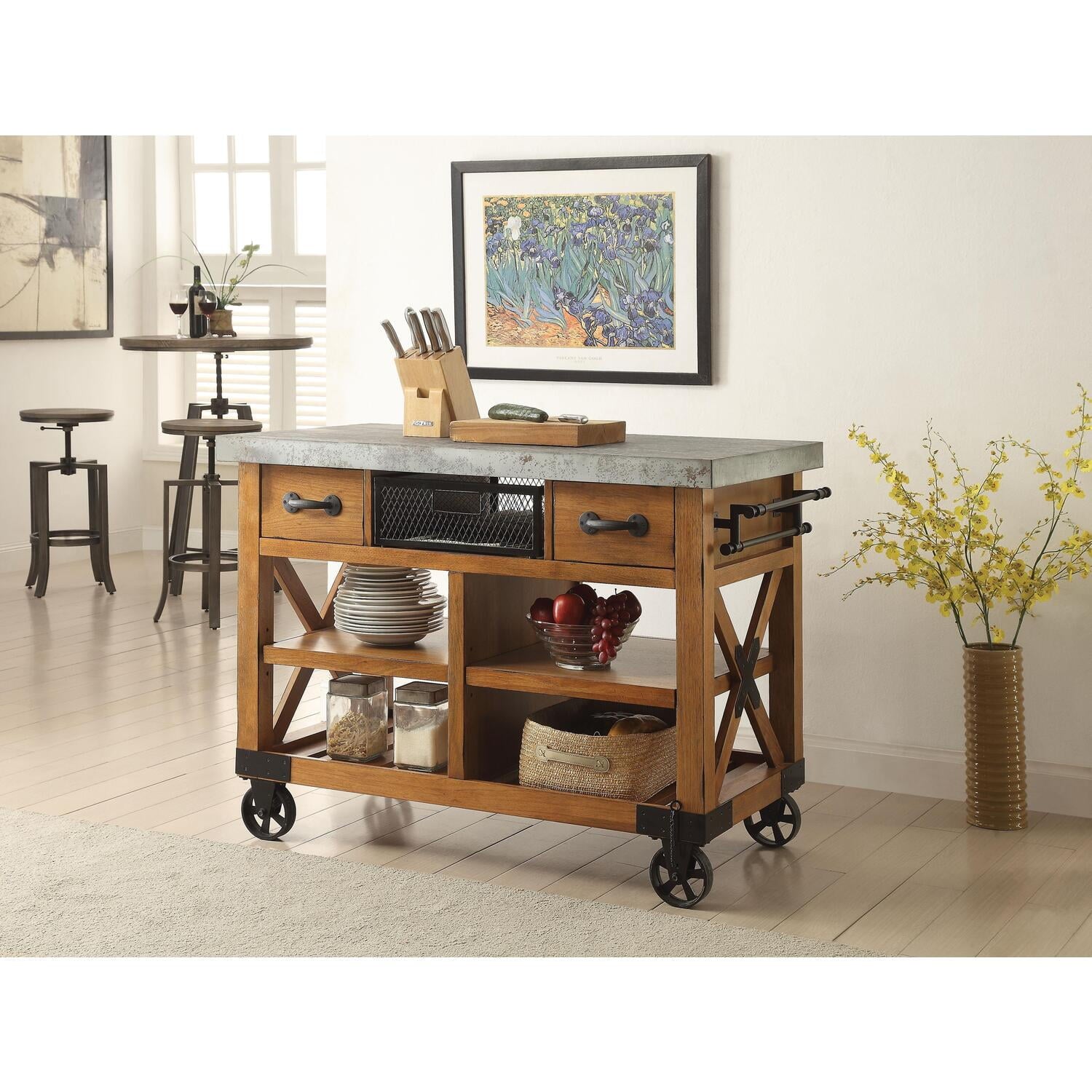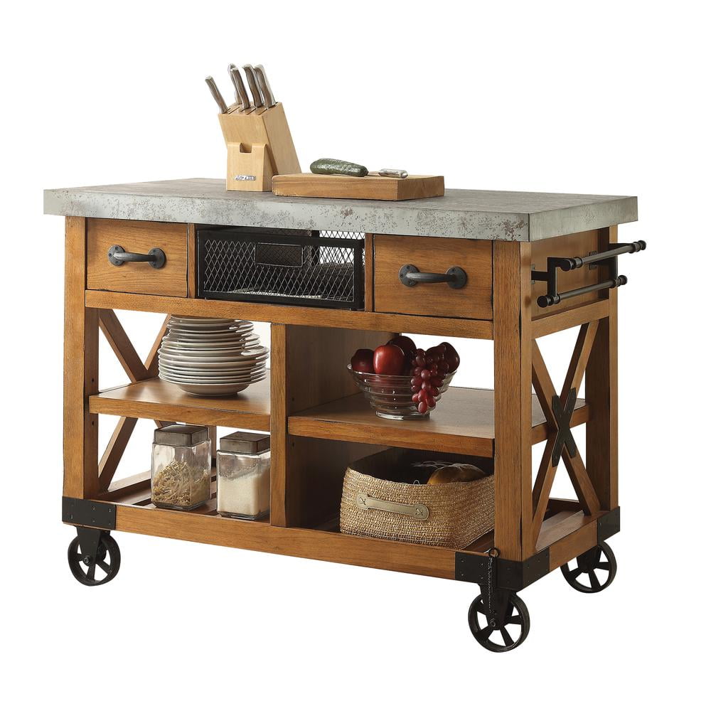 The Kailey kitchen cart with durable construction of wood and metal in a unique distress oak finish will become a stylish and function centerpiece of your home. The kitchen cart rests on casters, allowing you to move it easily. The storage space includes basket, drawers and open shelf. This kitchen cart will make a beautiful addition to your home.