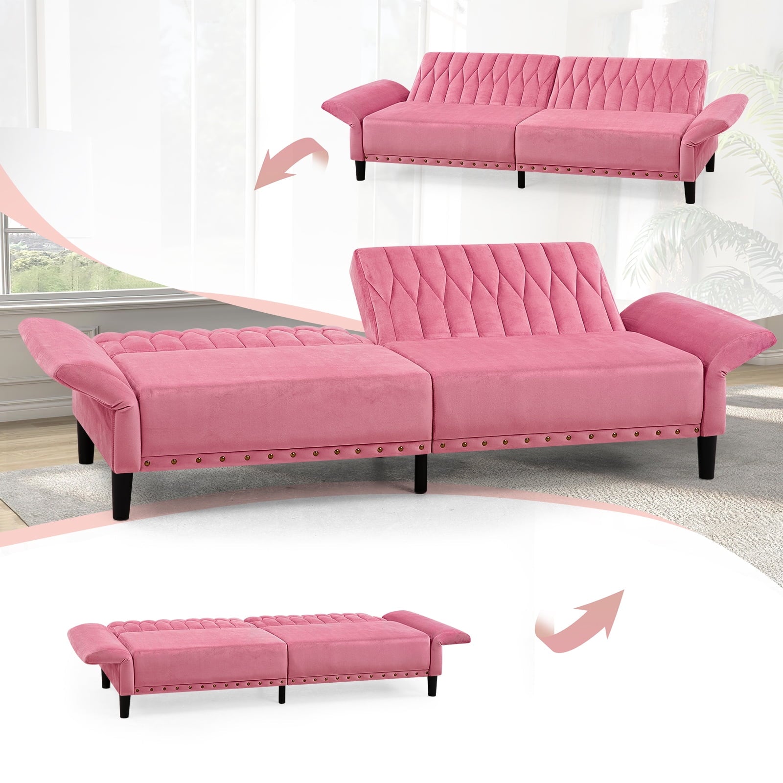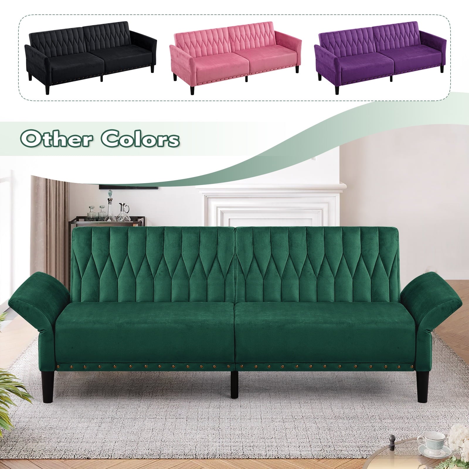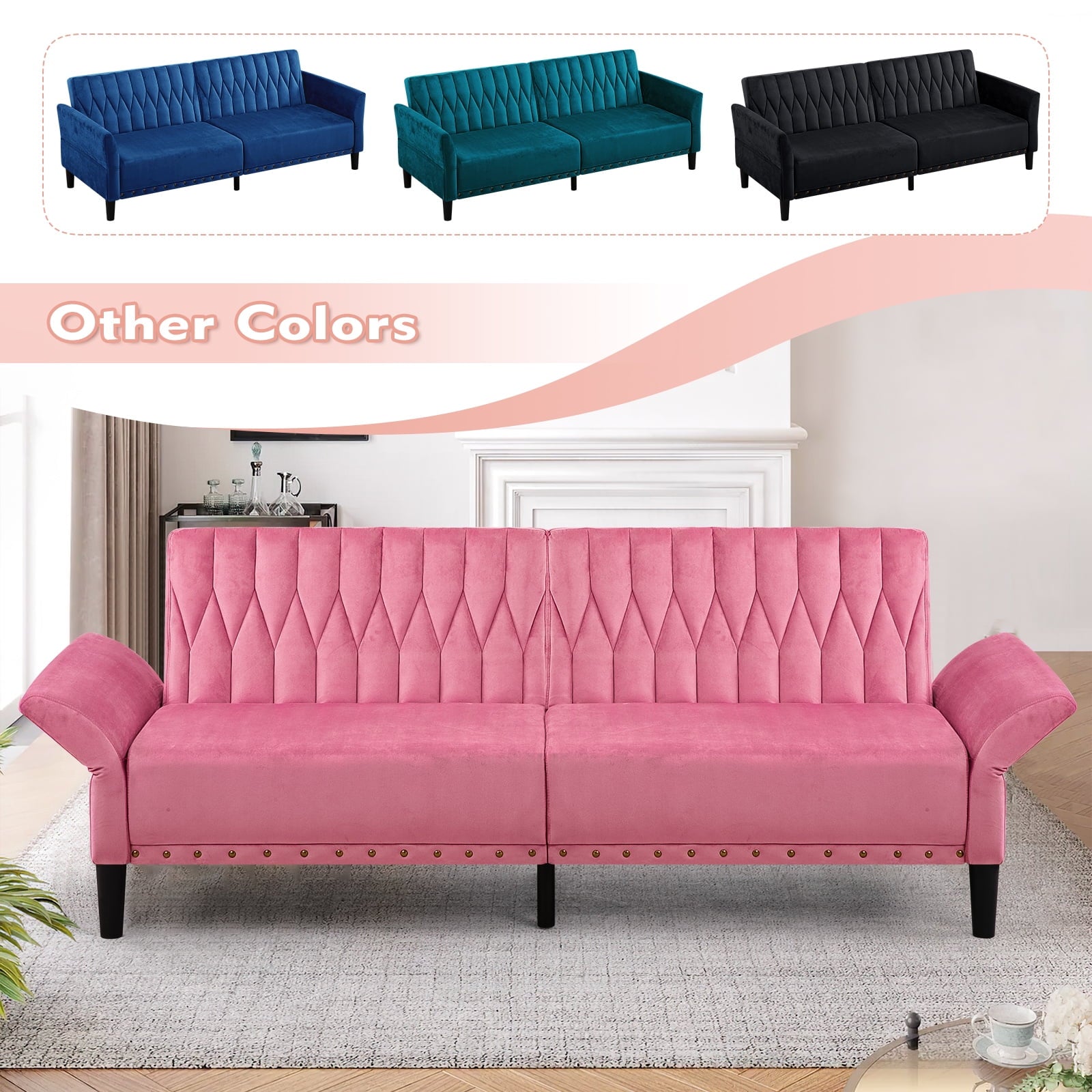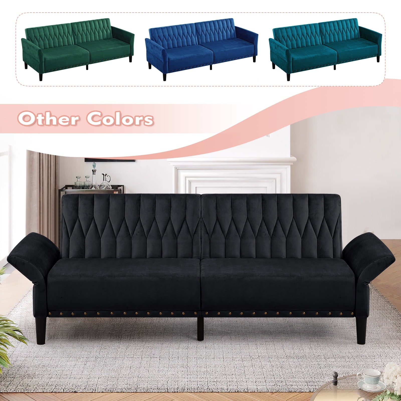 This velvet sofa bed has changeable armrests and backrest with various angles which can be converted into a tiwn-size bed for you need, providing extra space for your family or friends to rest. Designed with nailhead trim on the front of the sofa bed and special pattern on back cushion, the soft sofa bed is beautifull and fashion, suiatble for various places, such as living room, office, study room, etc . This soft sofa is made of premium velvet which is skin-friendly and breathable. High-resilience sponge in the seat cushion and backrest cushions make your body relax better