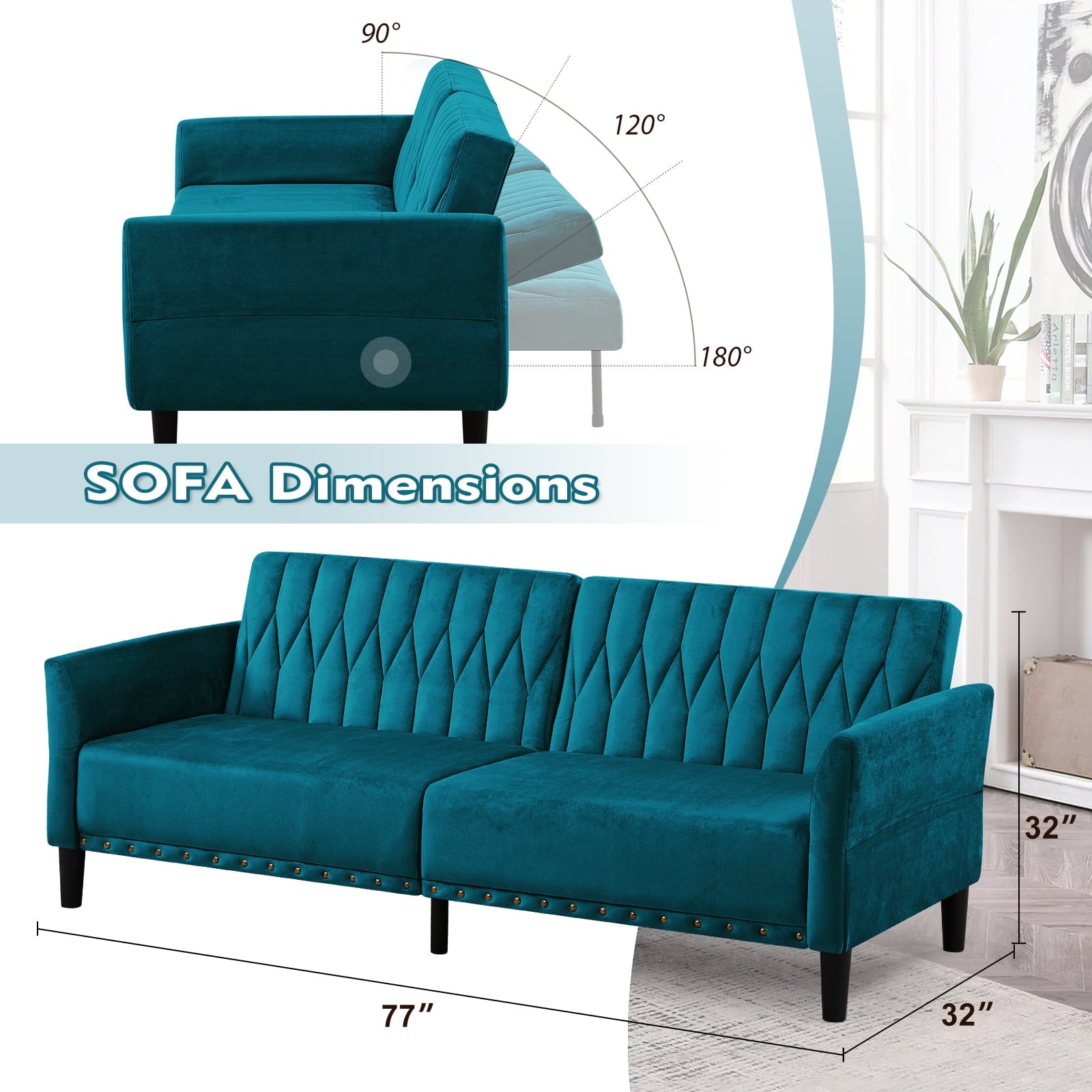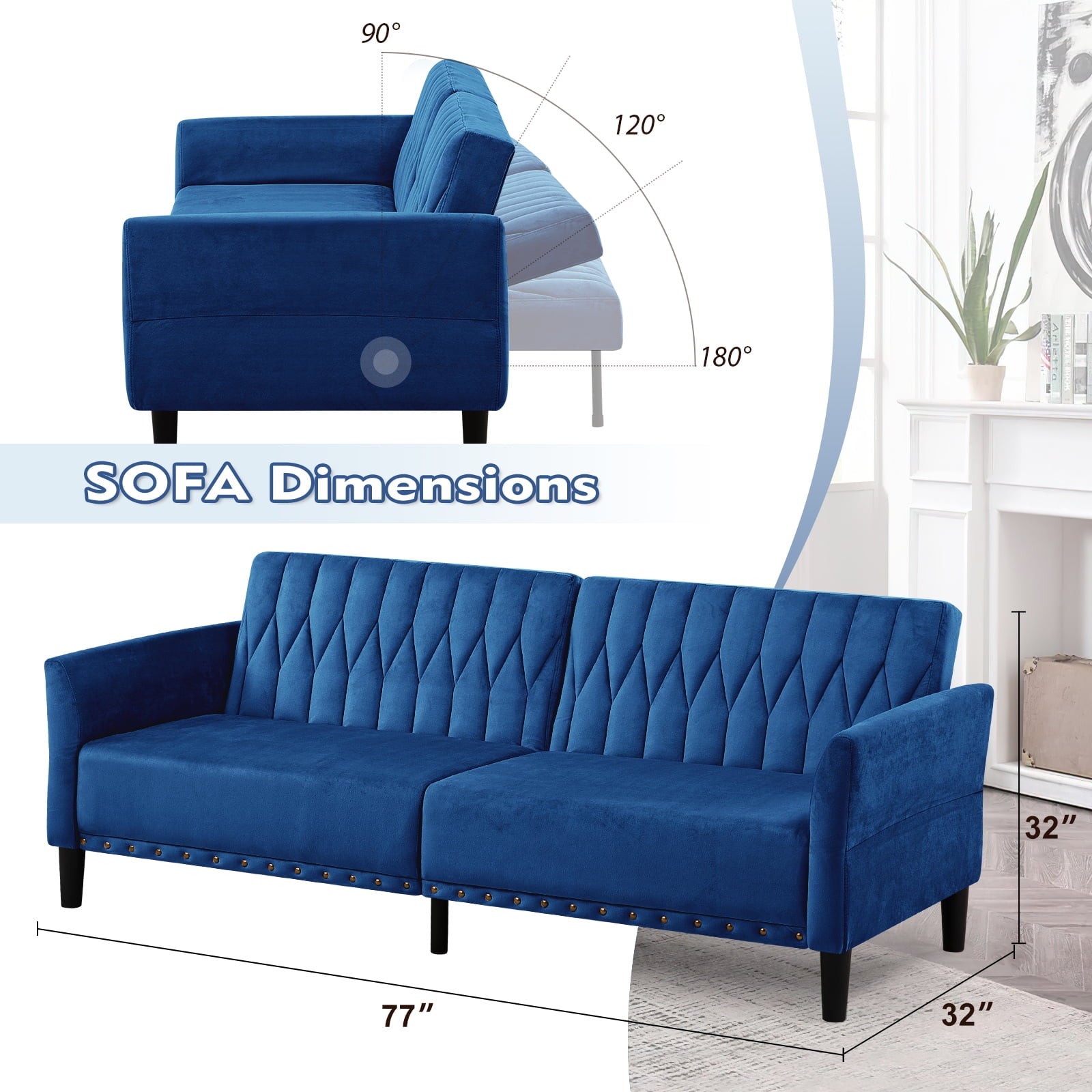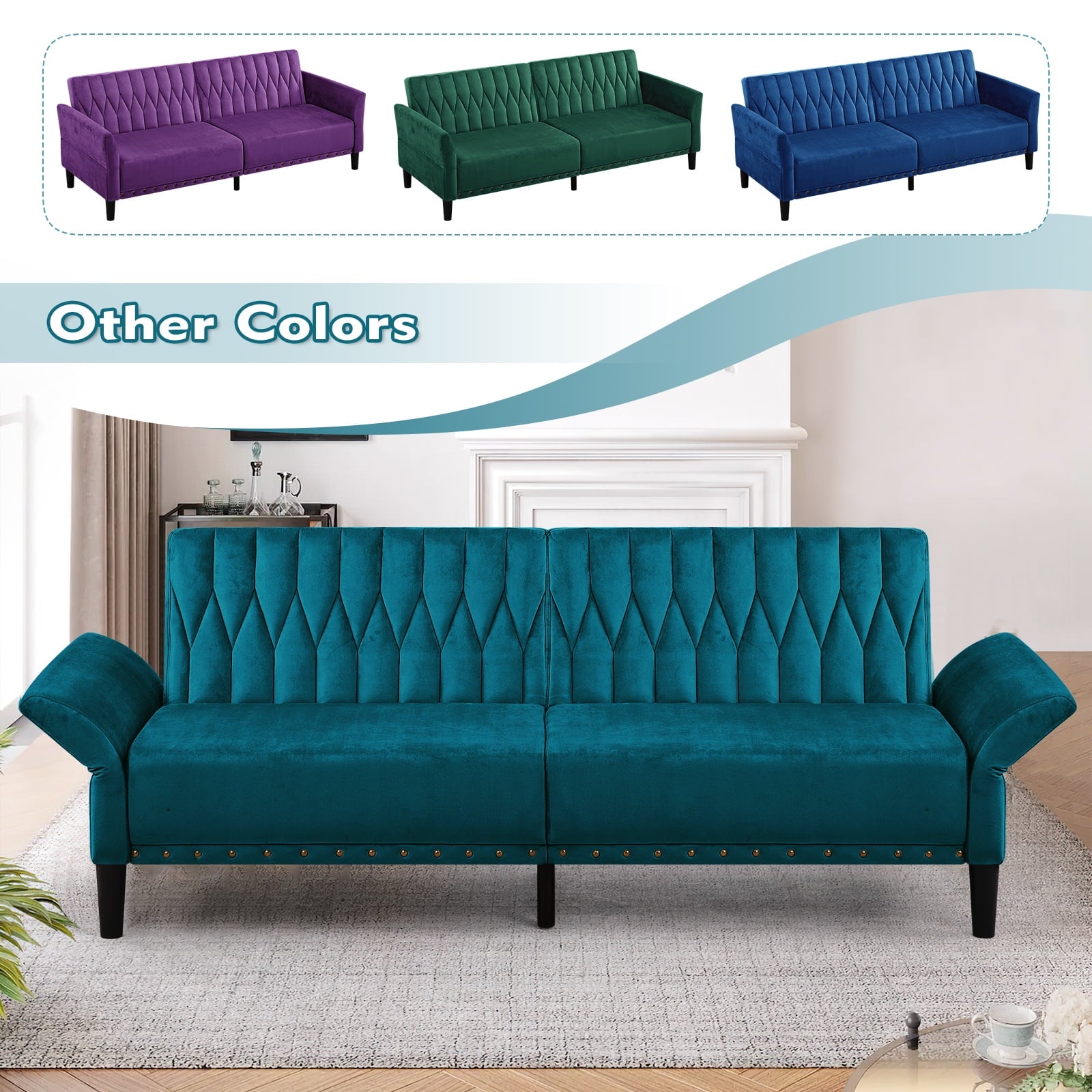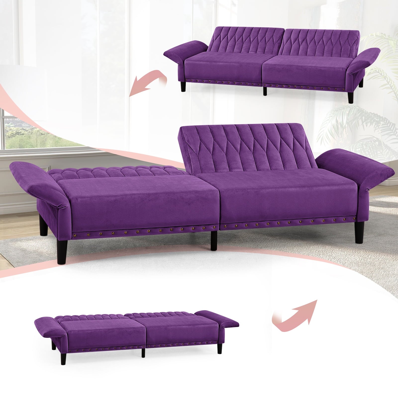 This velvet sofa bed has changeable armrests and backrest with various angles which can be converted into a tiwn-size bed for you need, providing extra space for your family or friends to rest. Designed with nailhead trim on the front of the sofa bed and special pattern on back cushion, the soft sofa bed is beautifull and fashion, suiatble for various places, such as living room, office, study room, etc . This soft sofa is made of premium velvet which is skin-friendly and breathable. High-resilience sponge in the seat cushion and backrest cushions make your body relax better