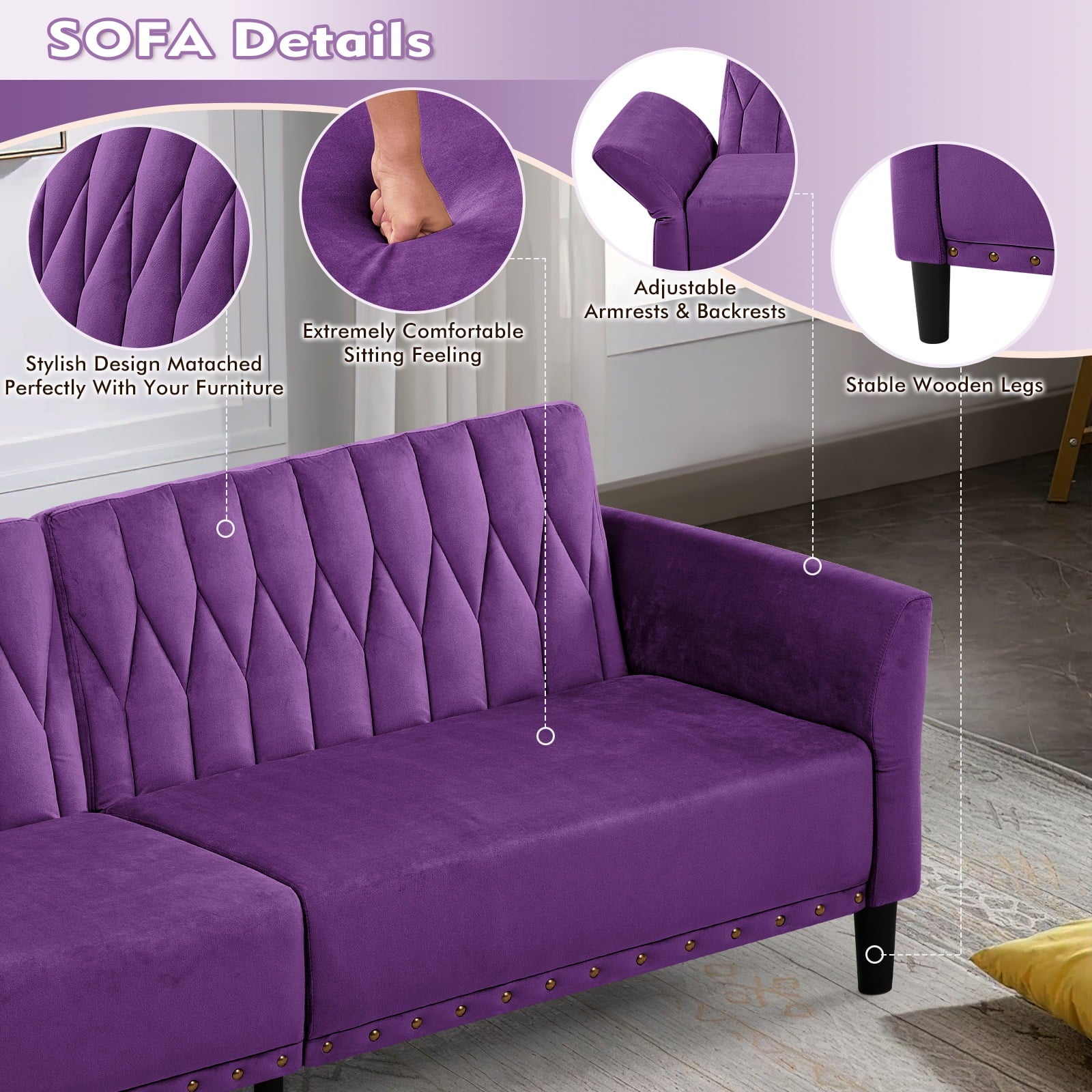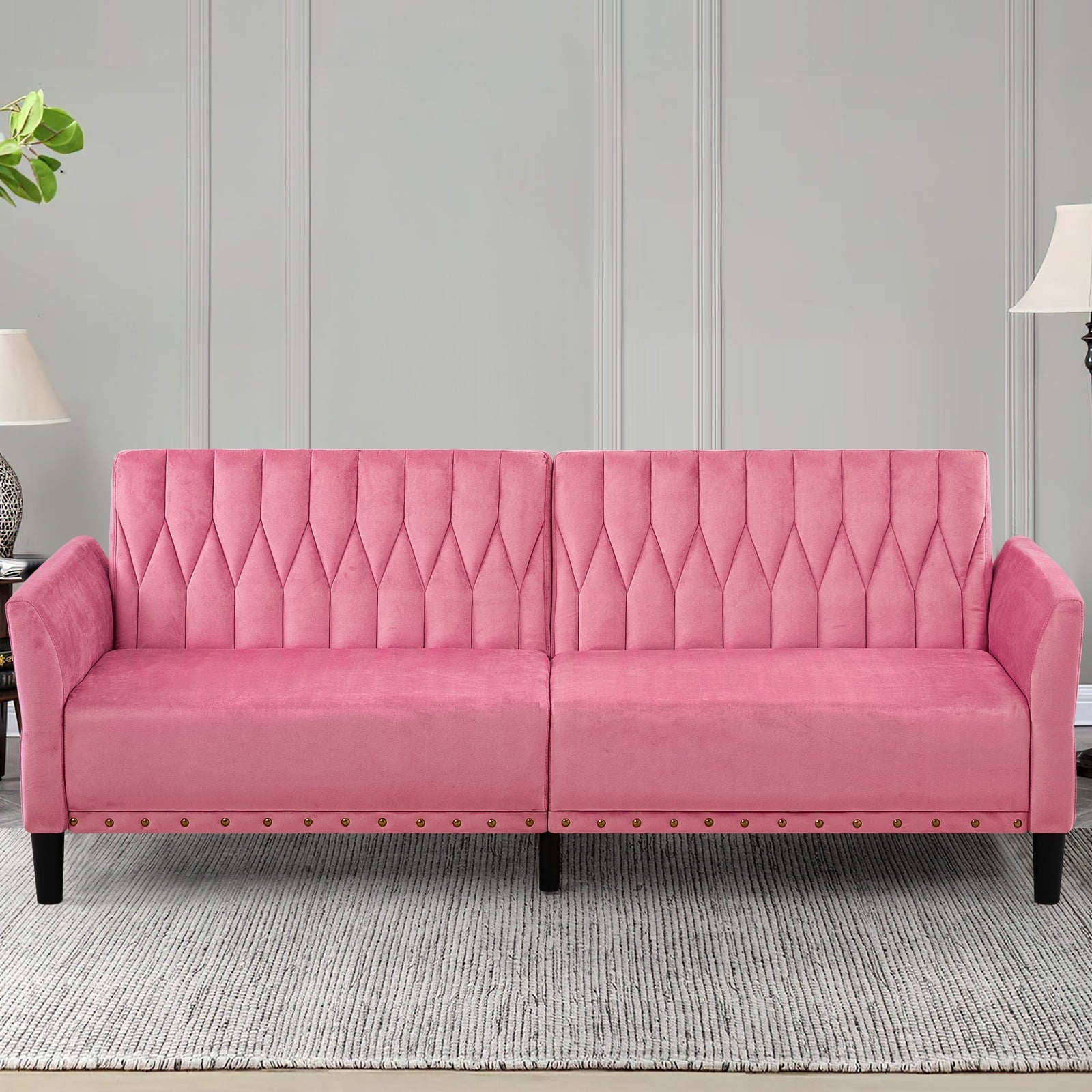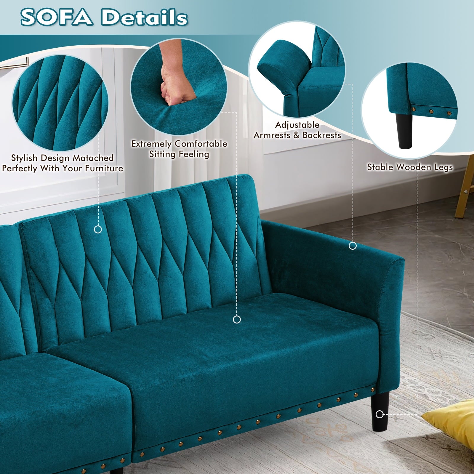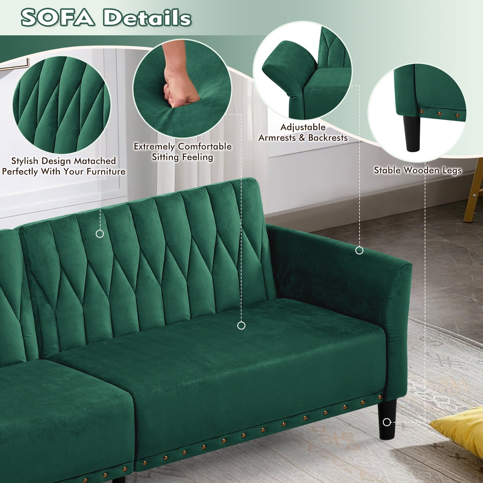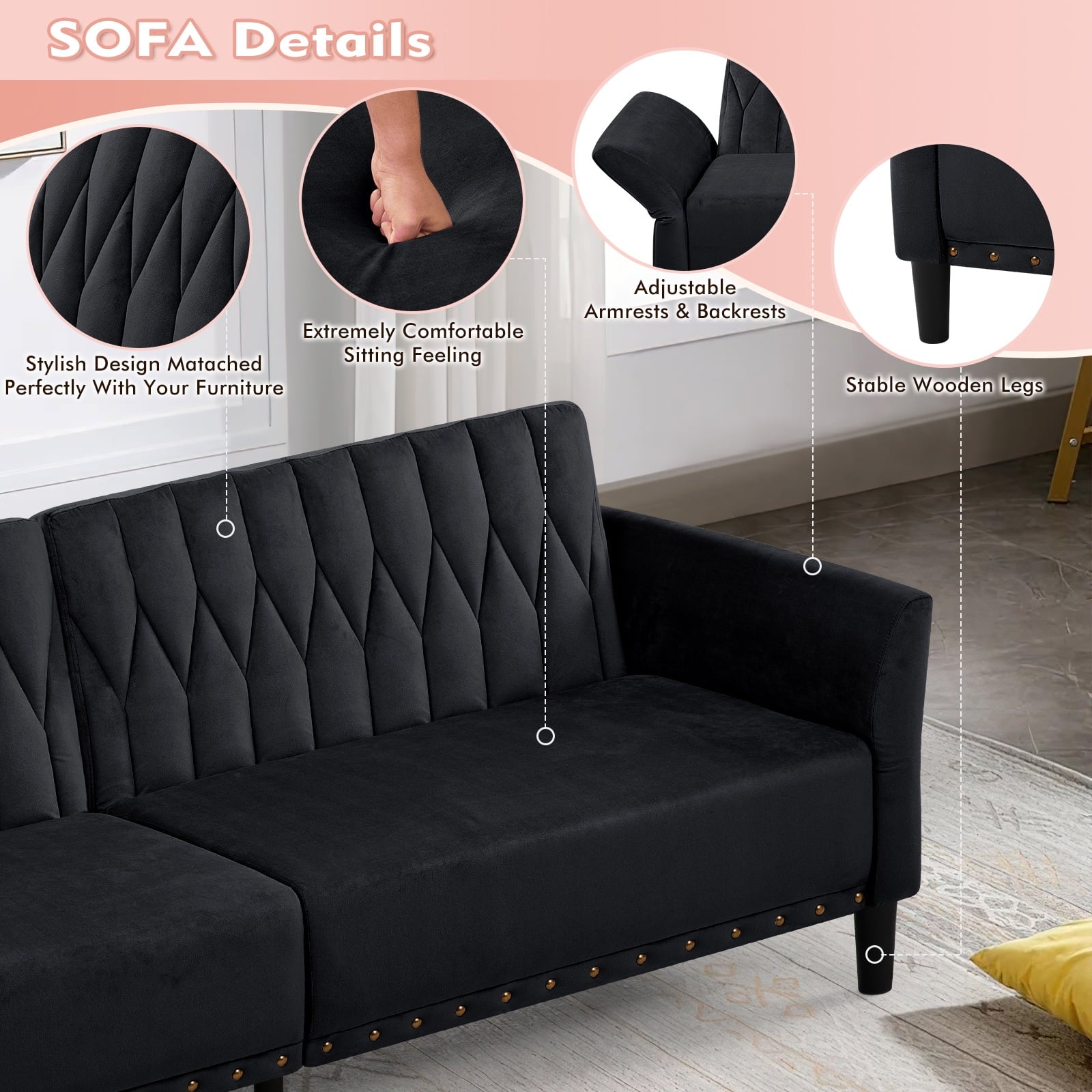 This velvet sofa bed has changeable armrests and backrest with various angles which can be converted into a tiwn-size bed for you need, providing extra space for your family or friends to rest. Designed with nailhead trim on the front of the sofa bed and special pattern on back cushion, the soft sofa bed is beautifull and fashion, suiatble for various places, such as living room, office, study room, etc . This soft sofa is made of premium velvet which is skin-friendly and breathable. High-resilience sponge in the seat cushion and backrest cushions make your body relax better