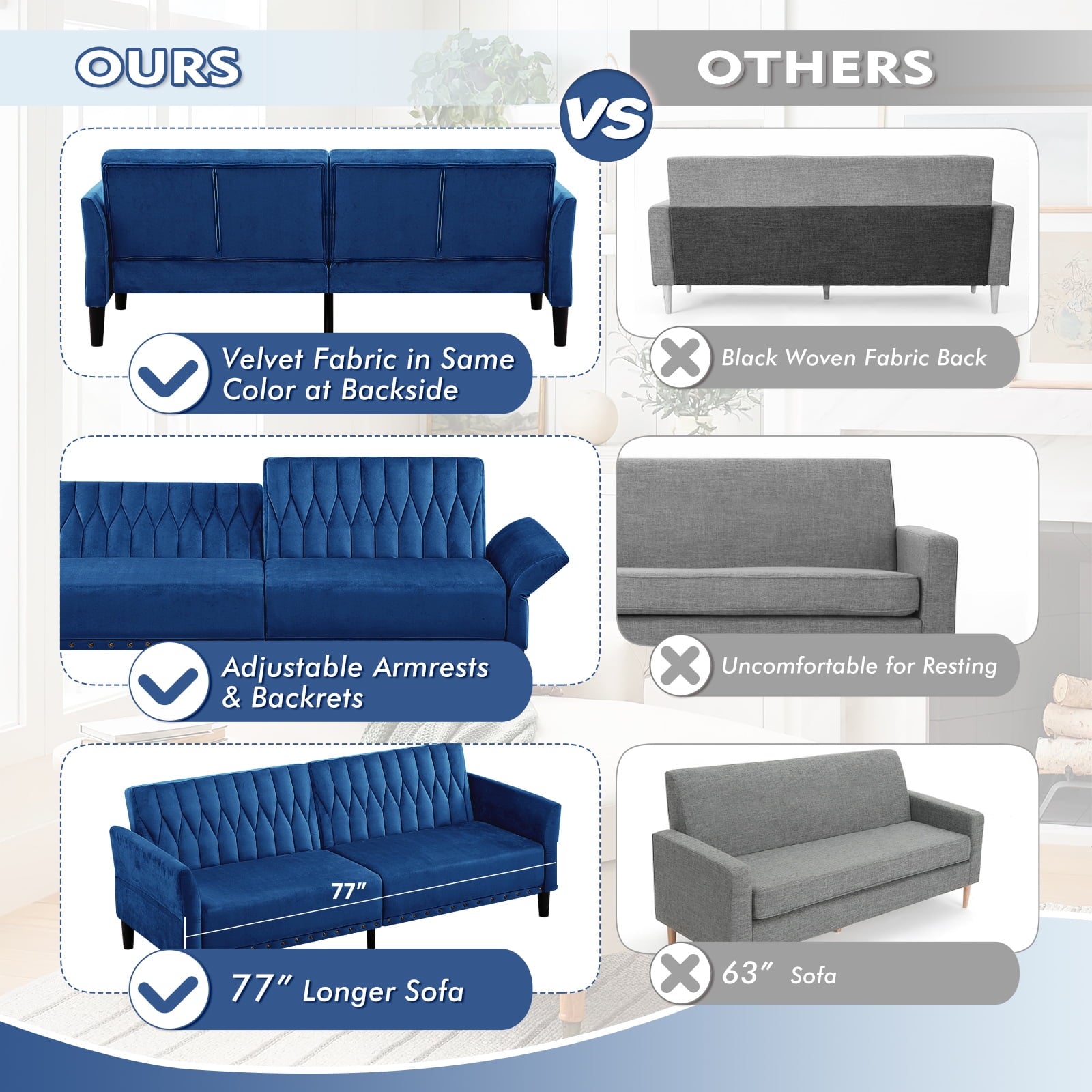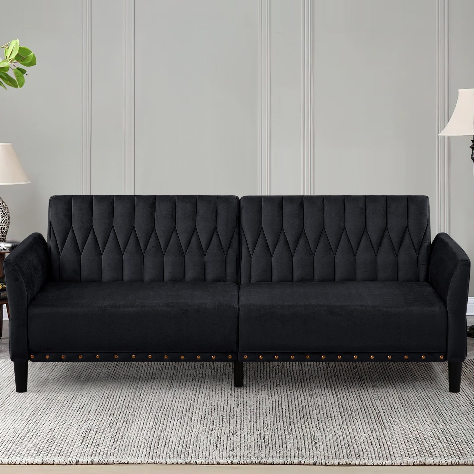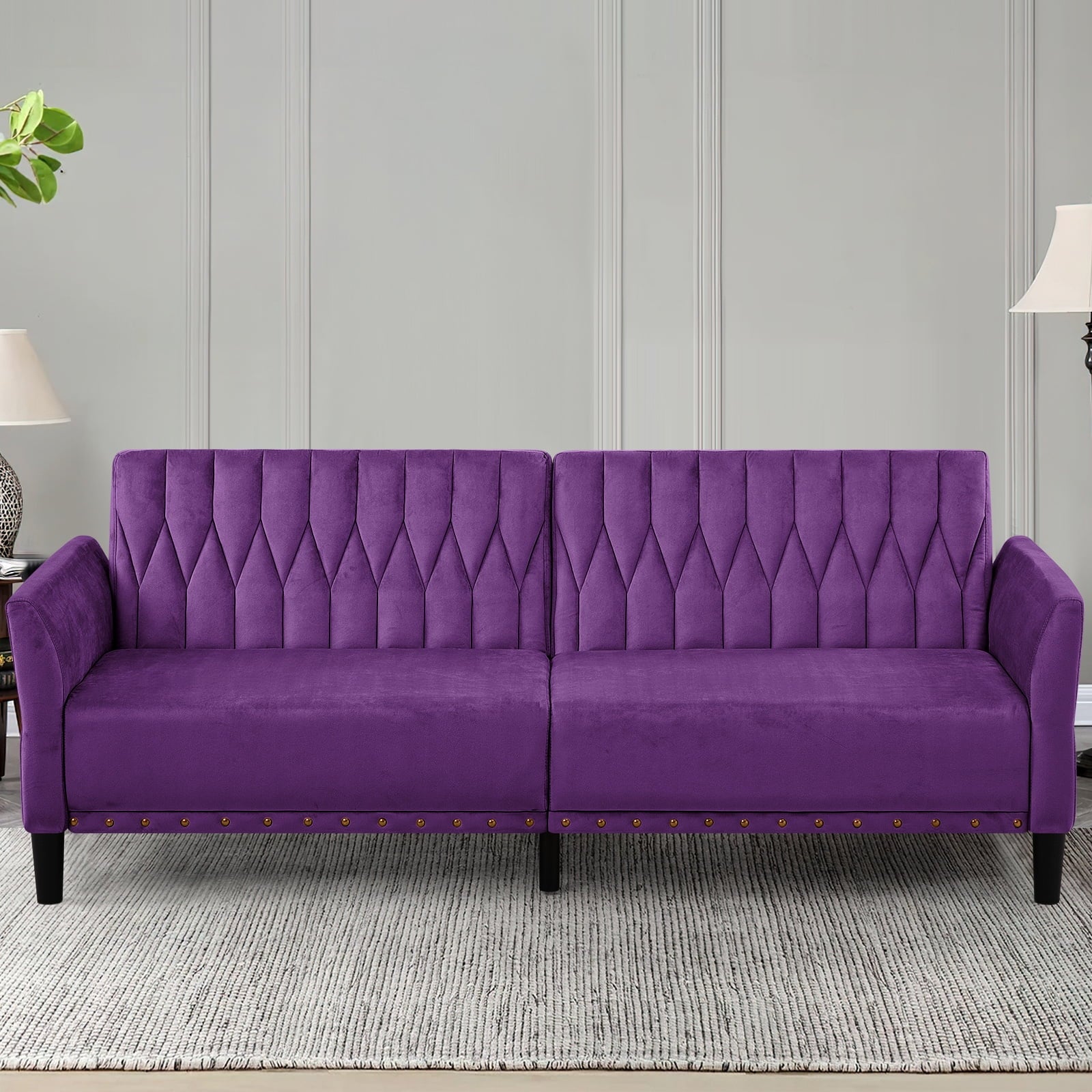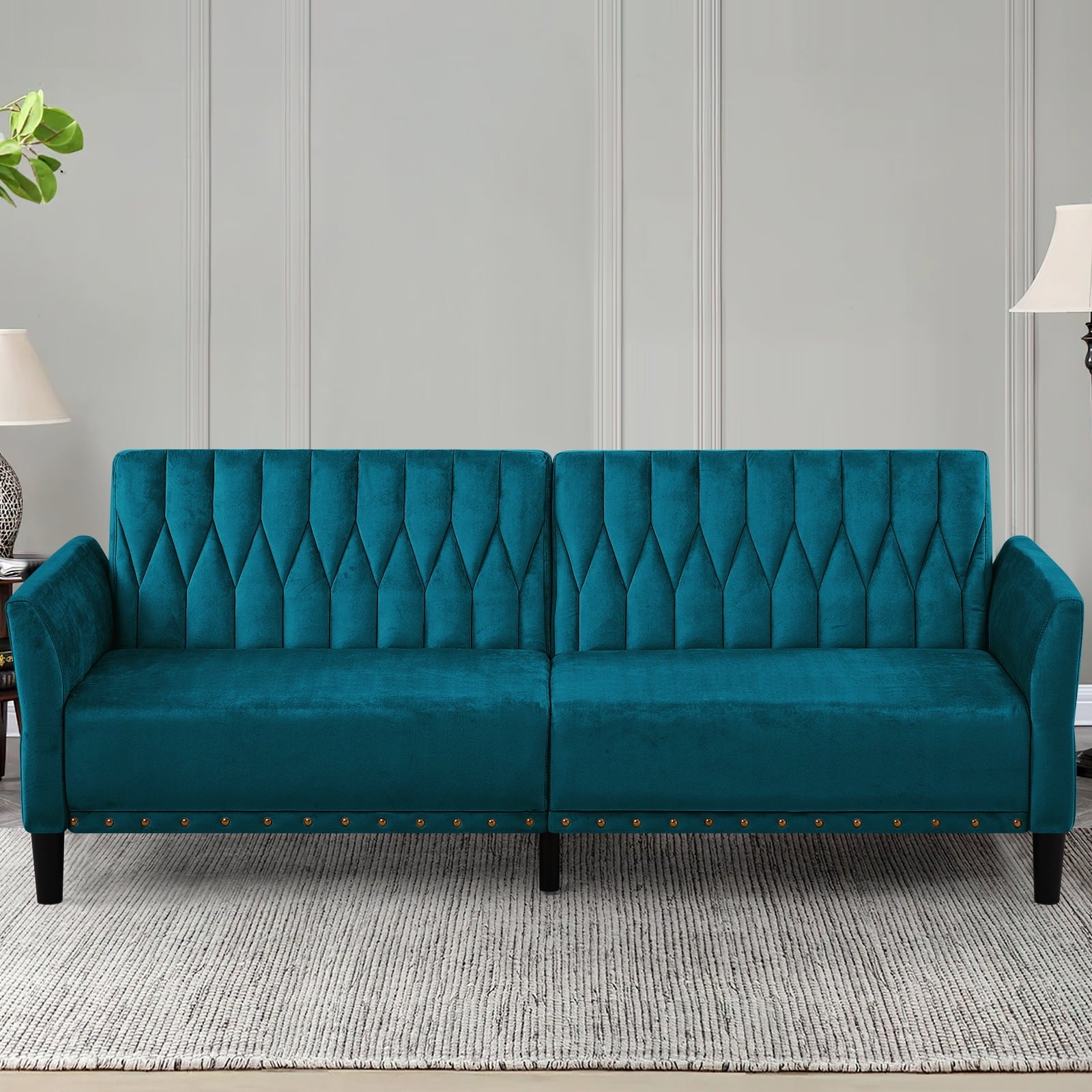 This velvet sofa bed has changeable armrests and backrest with various angles which can be converted into a tiwn-size bed for you need, providing extra space for your family or friends to rest. Designed with nailhead trim on the front of the sofa bed and special pattern on back cushion, the soft sofa bed is beautifull and fashion, suiatble for various places, such as living room, office, study room, etc . This soft sofa is made of premium velvet which is skin-friendly and breathable. High-resilience sponge in the seat cushion and backrest cushions make your body relax better