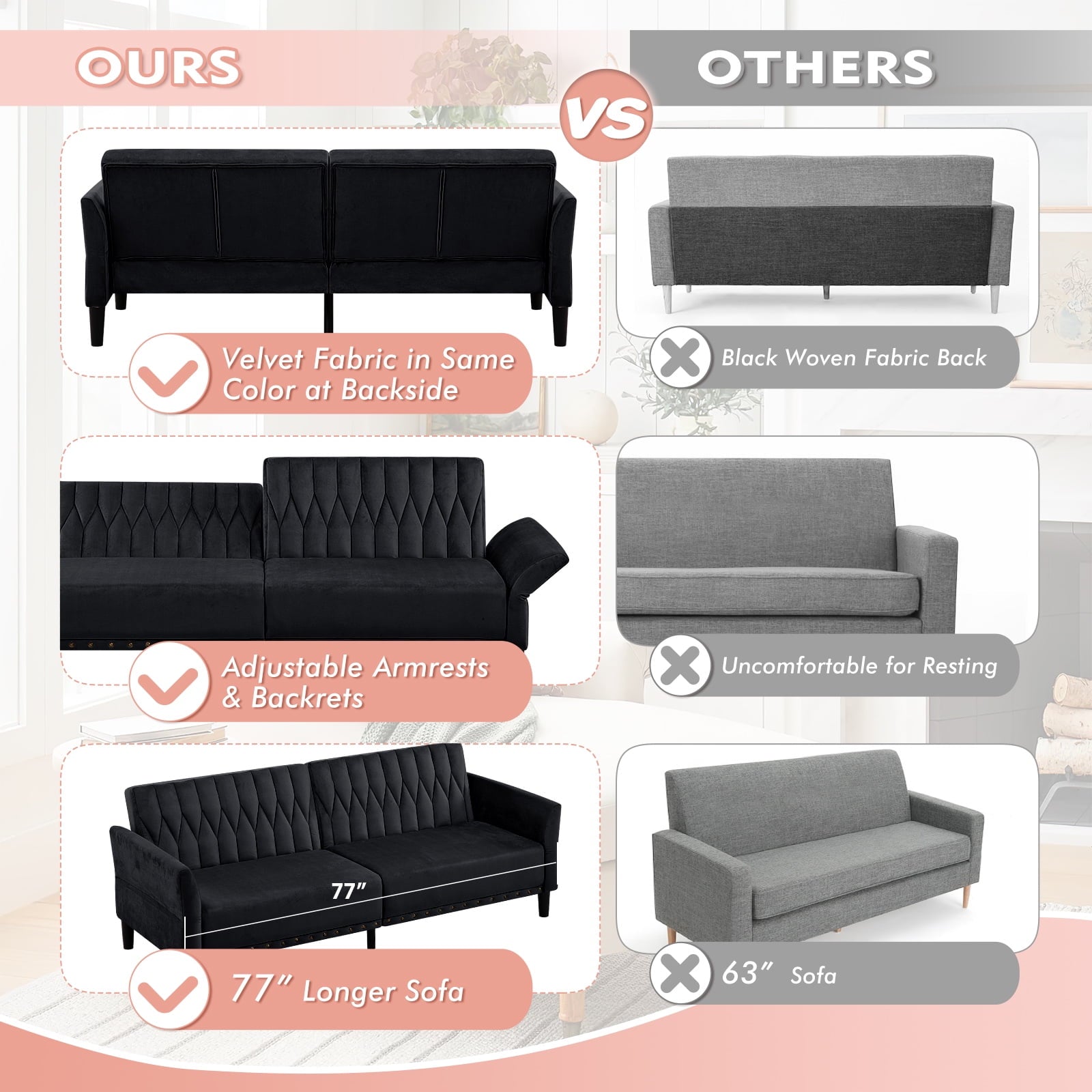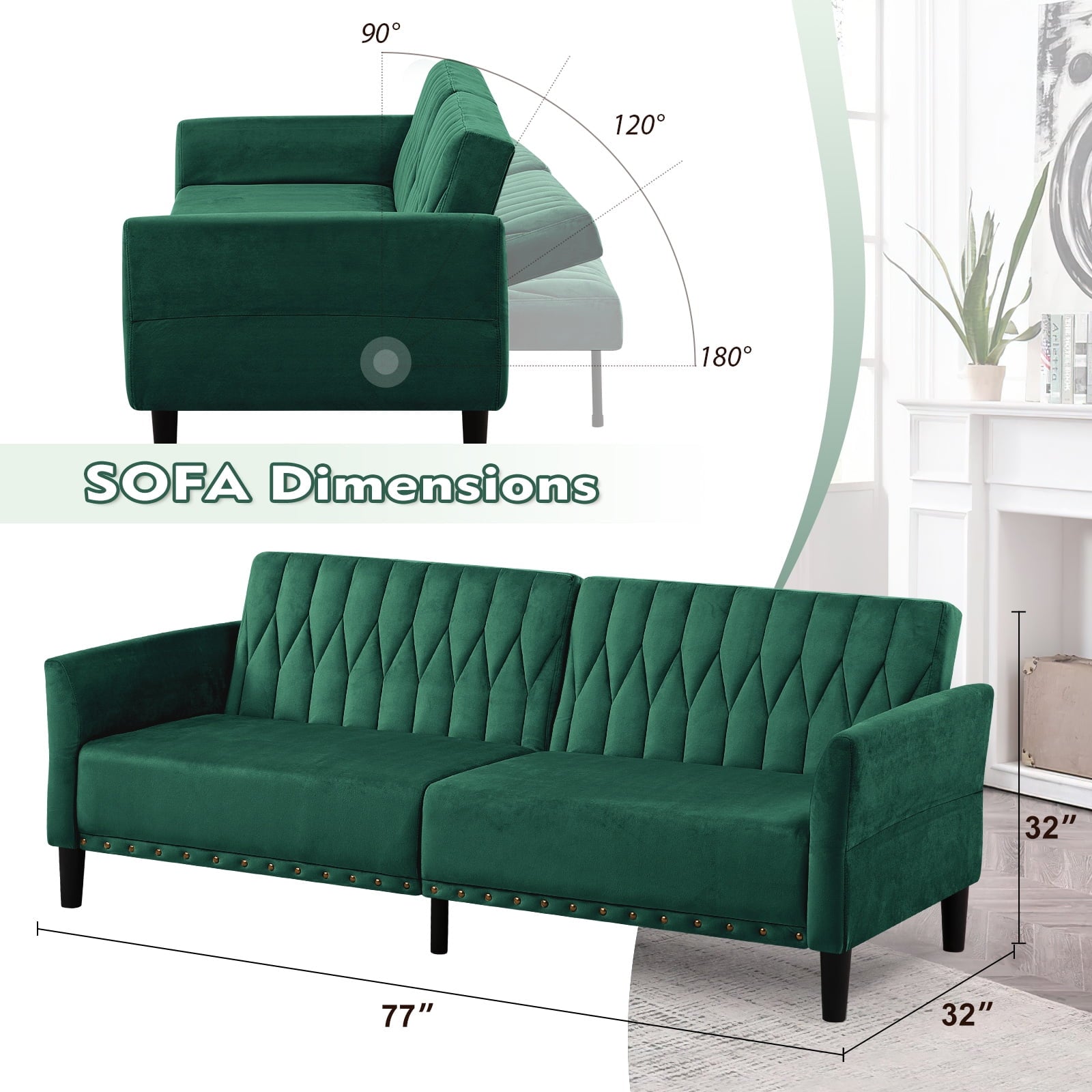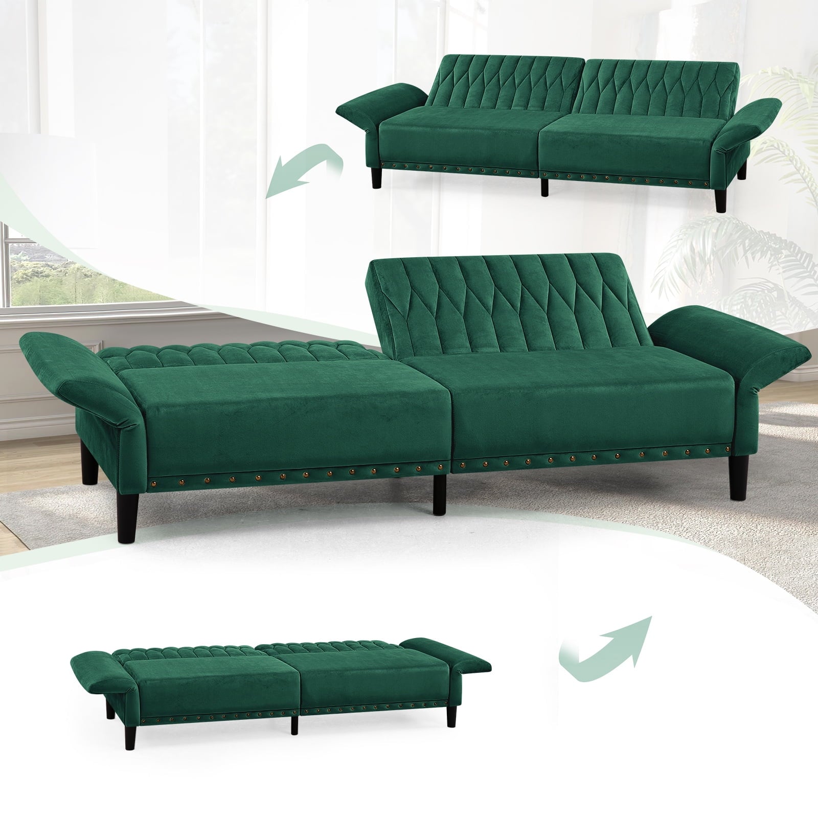 • CHANGEABLE BACKRESTS & ARMRESTS: This velvet sofa bed has changeable armrests and backrest with various angles which can be converted into a tiwn-size bed for you need, providing extra space for your family or friends to rest