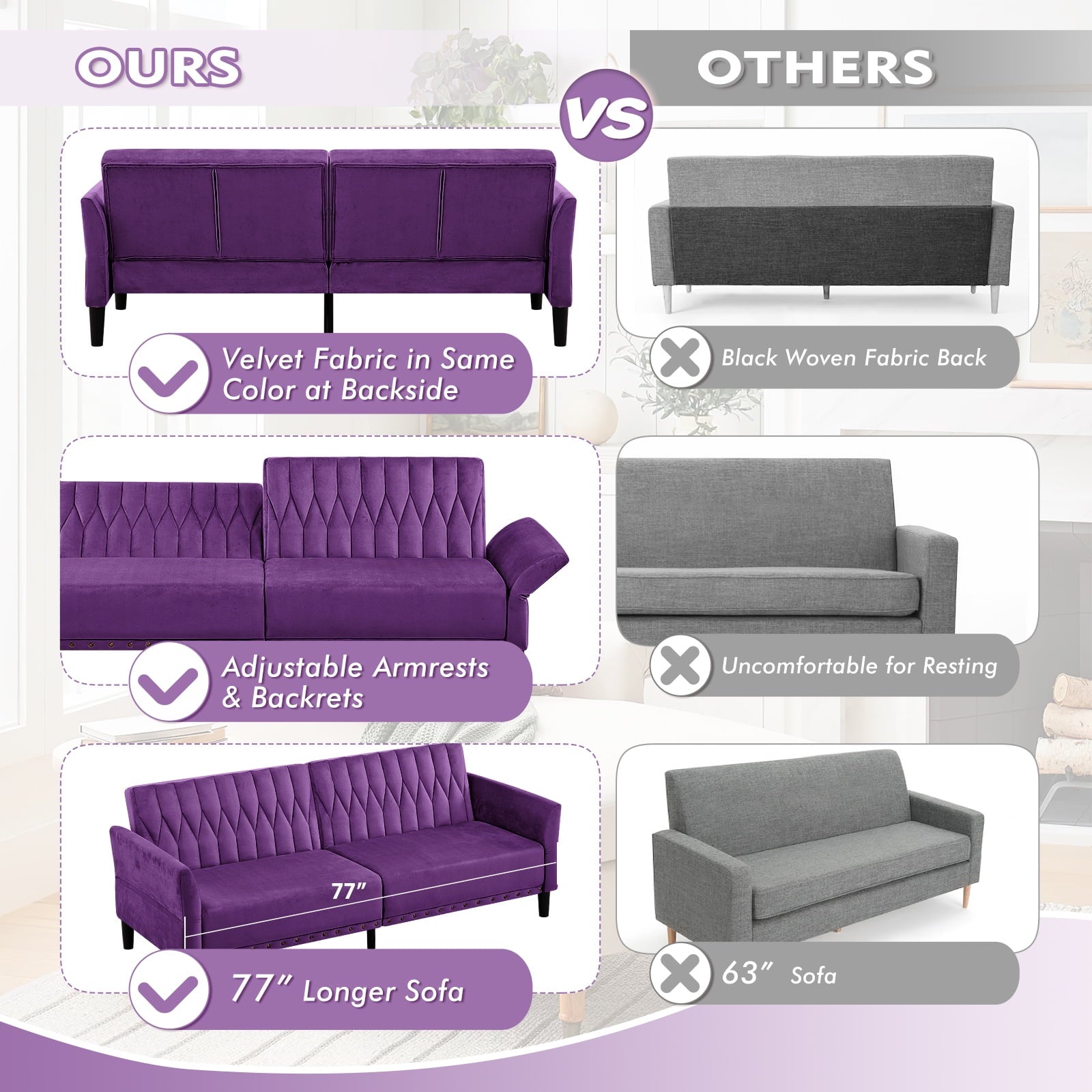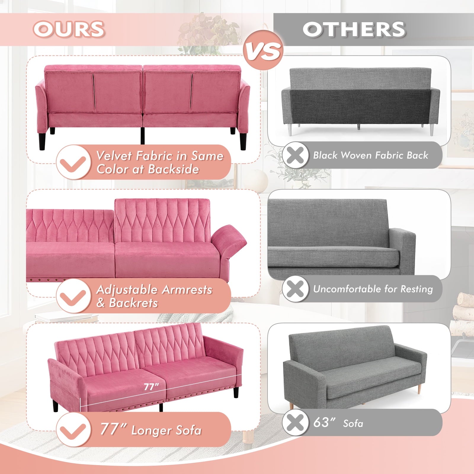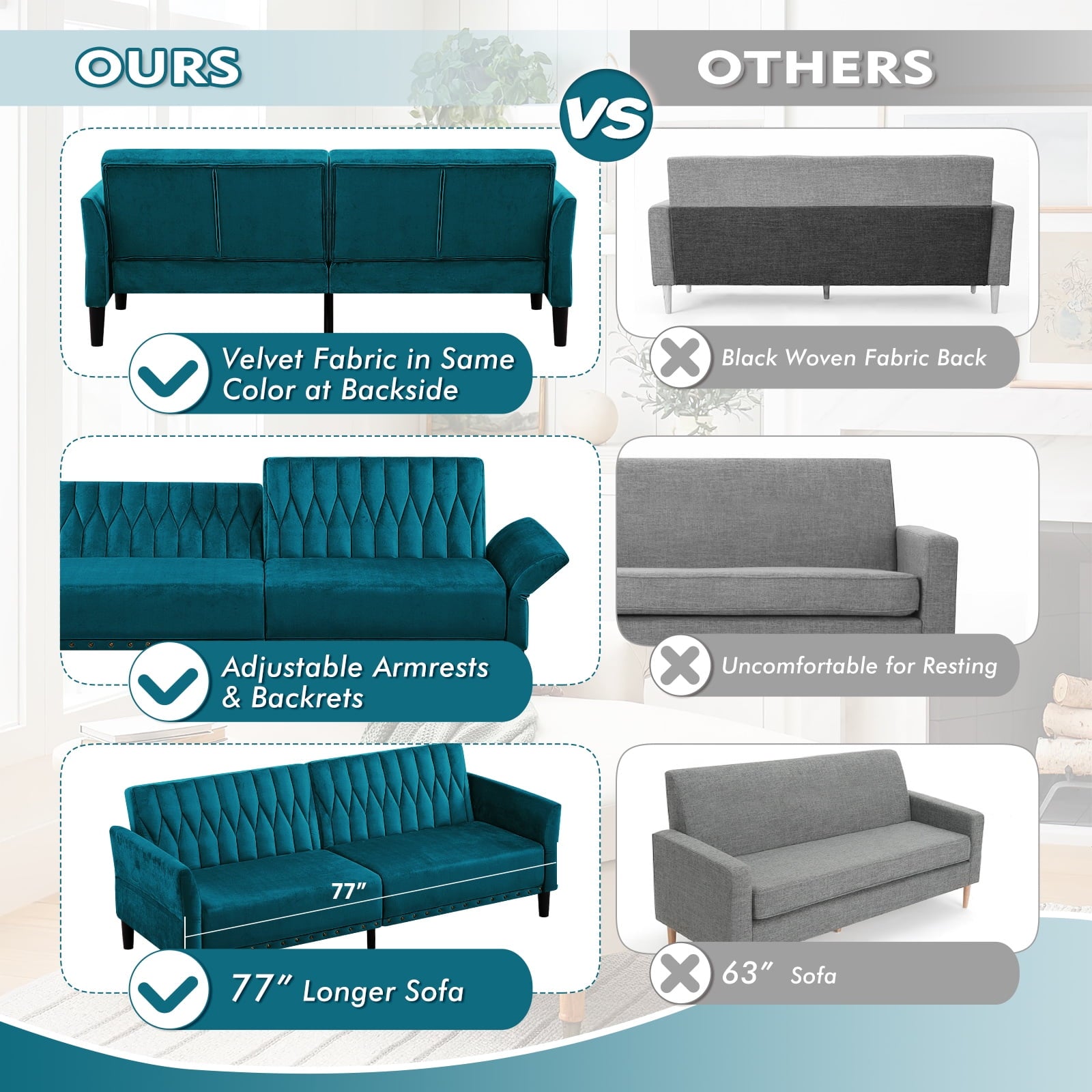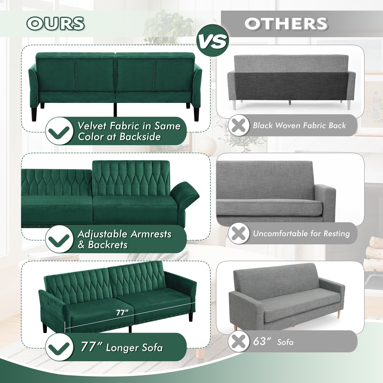 • CHANGEABLE BACKRESTS & ARMRESTS: This velvet sofa bed has changeable armrests and backrest with various angles which can be converted into a tiwn-size bed for you need, providing extra space for your family or friends to rest