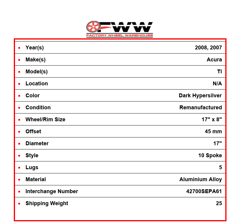 This Factory OEM ACURA Aluminium Alloy 10 SPOKE wheel comes stock on 2008, 2007 ACURA TL. The OEM part number(s) for the rim are 42700SEPA61, . This is a 5 lug wheel with a 17 inch diameter, width of 8 inch and an offset of 45 mm. The finish on the wheel is DARK HYPERSILVER.