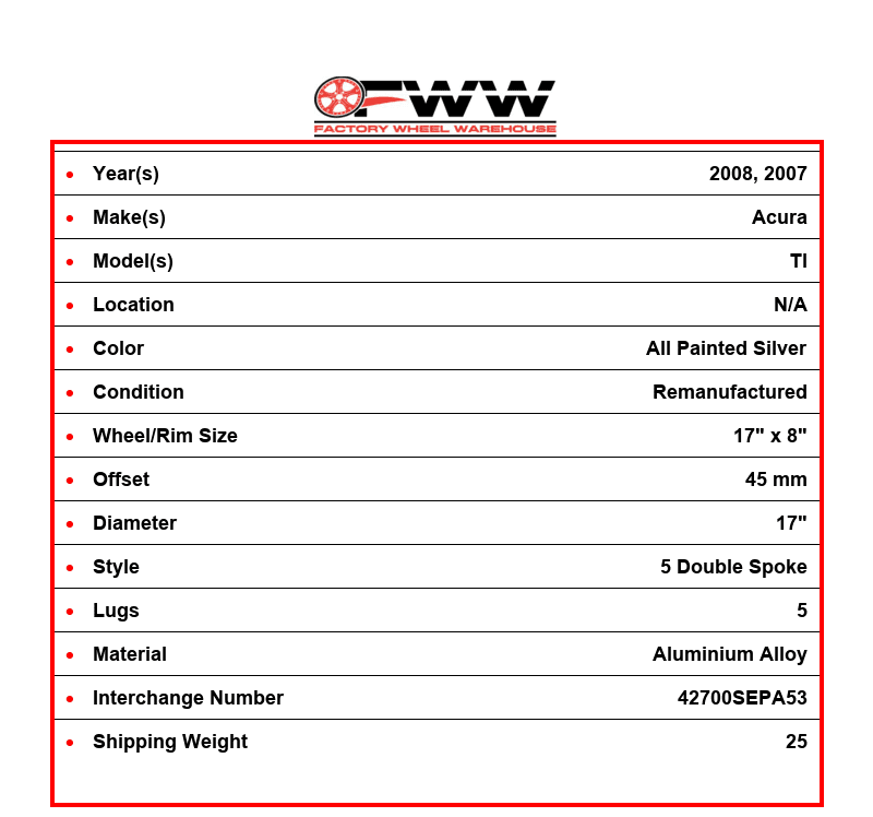 This Factory OEM ACURA Aluminium Alloy 5 DOUBLE SPOKE wheel comes stock on 2008, 2007 ACURA TL. The OEM part number(s) for the rim are 42700SEPA52, 560-71762. This is a 5 lug wheel with a 17 inch diameter, width of 8 inch and an offset of 45 mm. The finish on the wheel is ALL PAINTED SILVER.