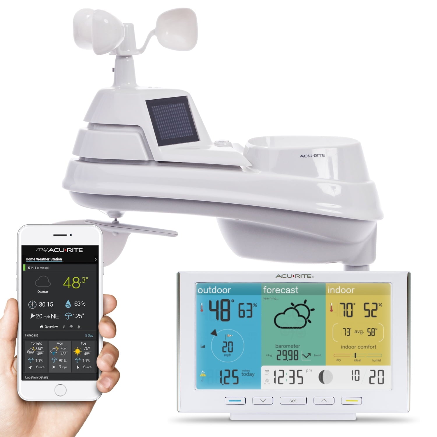 The remote weather station uses solar power to regulate internal temperature for more accurate temperature measurements, which can be sent — along with the other weather data — from up to 330 feet (100 meters) away (and through walls) using a 433 MHz wireless signal. The best-in-class weather display will look great in your personal weather center or rec room next to your sports ticker with its straightforward readability from almost any angle. With this professional home weather station, Wi-Fi connectivity allows you to set custom alerts that can be received and viewed on your My AcuRite app. These alerts make this the perfect weather station to keep tabs on your summer home or use as an RV weather station at the campsite. This weather underground weather station also allows you to share your weather data online with the weather underground community. The indoor weather station is AC-powered and also takes three (3) AAA batteries (not included) for optional backup in case of a power outage. The wireless outdoor sensor requires four (4) AA batteries (not included, lithium recommended for optimal performance). A perfect gift idea for Christmas, Father’s Day, or birthdays, this weather station comes with a one-year limited warranty.
