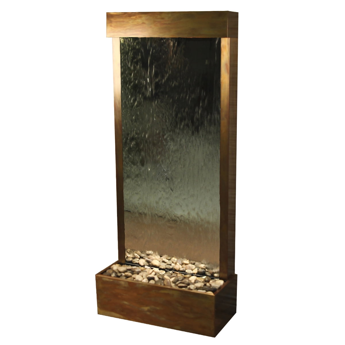 Adagio Harmony River Fountain – Flush Mount – Rustic Copper – Choose OptionsA comforting and tranquil environment is the natural result of combining soft halogen lighting over the gentle movement and sound of water in motion. These stunning water features are handcrafted and custom-. The Harmony River Collection features a single face available in clear or blue glass. The Hood and Tray are available in Antique Bronze, Blackened Copper, Rustic Copper, or Stainless Steel in a flush or center mount. The heavy duty tray liners are double tested to ensure a water tight seal. The adjustable splash guard (pebble beach tray) prevents splashing, hides the pump from view, and displays our pebble beach made up of natural polished river rock. Create a stunning impact with this single faced free-standing feature in your home, office, entry, or boardroom.