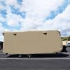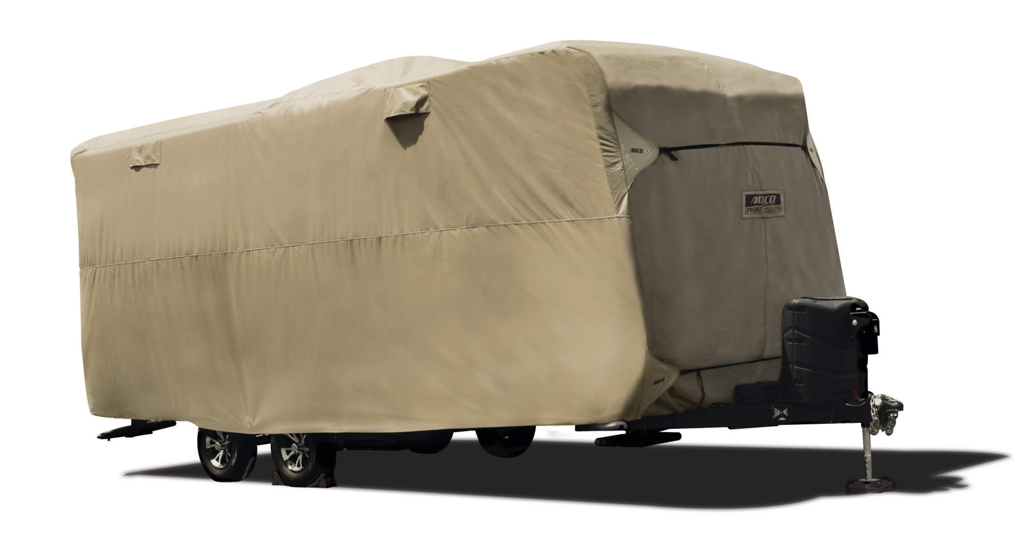 Our Storage Lot Travel Trailer Covers are perfect for keeping your Travel Trailers road ready when stored for long periods in storage lots. We specially engineered the fabric with 4 layers of Polypropylene protection to provide superior UV protection, durability, and breathability. Not only were these Storage Lot Travel Trailer Covers built tough, but functional also. We have a unique CAM Buckle system and Slip-Seam strapping system in place that helps secure straps in place, create a snug fit, prevent slippage, and cinches cover tight on all 4 bottom corners to help keep the wind out. Note: To determine correct size, measure your Travel Trailer from the longest two points to determine proper fit, including bumpers, spare tire, and ladder – but excluding the hitch. ADCO Covers are designed to fit all common vehicle heights, however, we recommend double-checking by taking the measurement of the vehicle sidewall height, excluding ground clearance. Cover is designed to accommodate rooftop accessories so no need to account for A/C’s, vents, etc… when checking on height.
