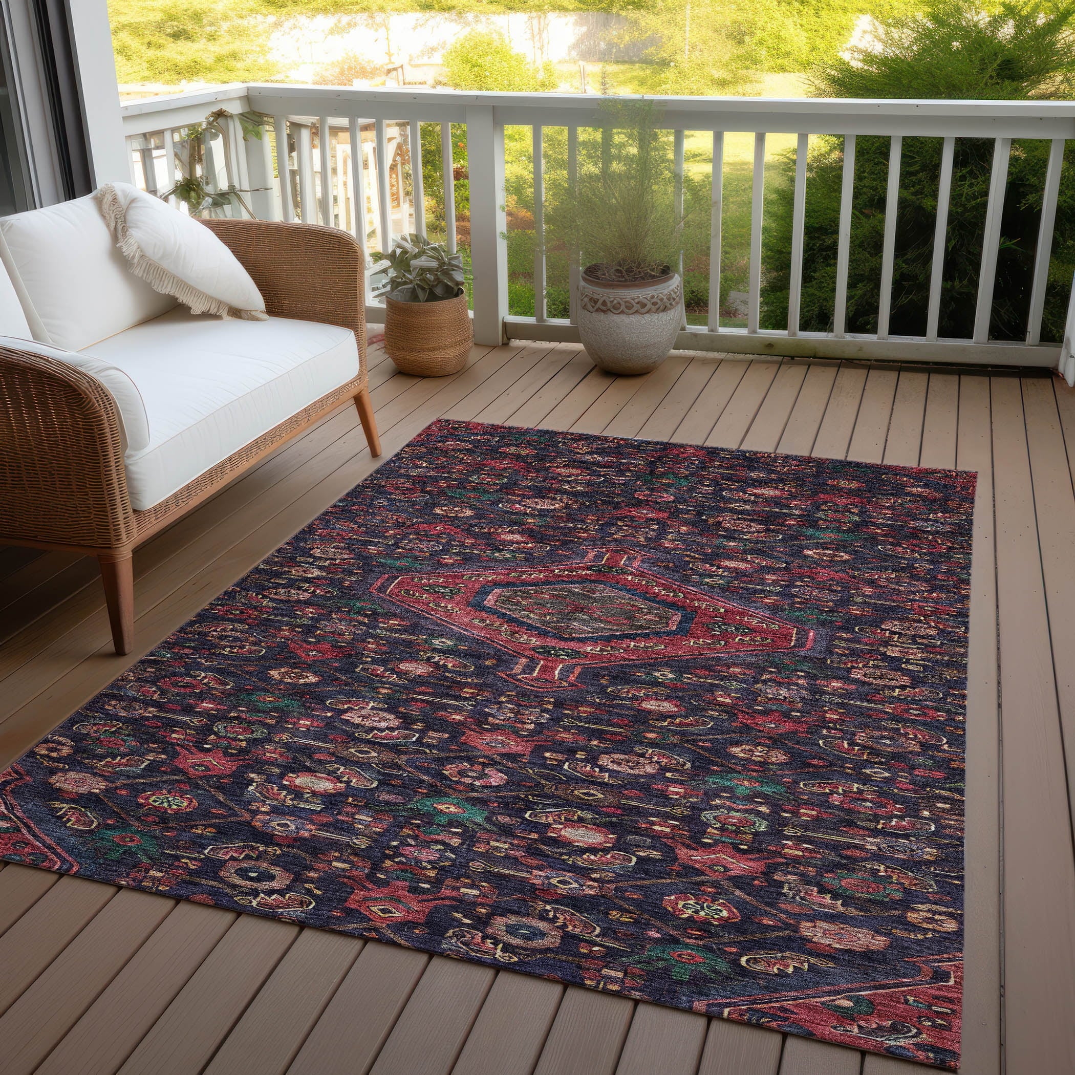 - UV Stabilized For Indoor or Outdoor Use. All rugs exposed to long periods of intense and direct sunlight can experience loss of color over time. Our rugs perform best in covered outdoor areas and uncovered areas with lower hours of direct sunlight.