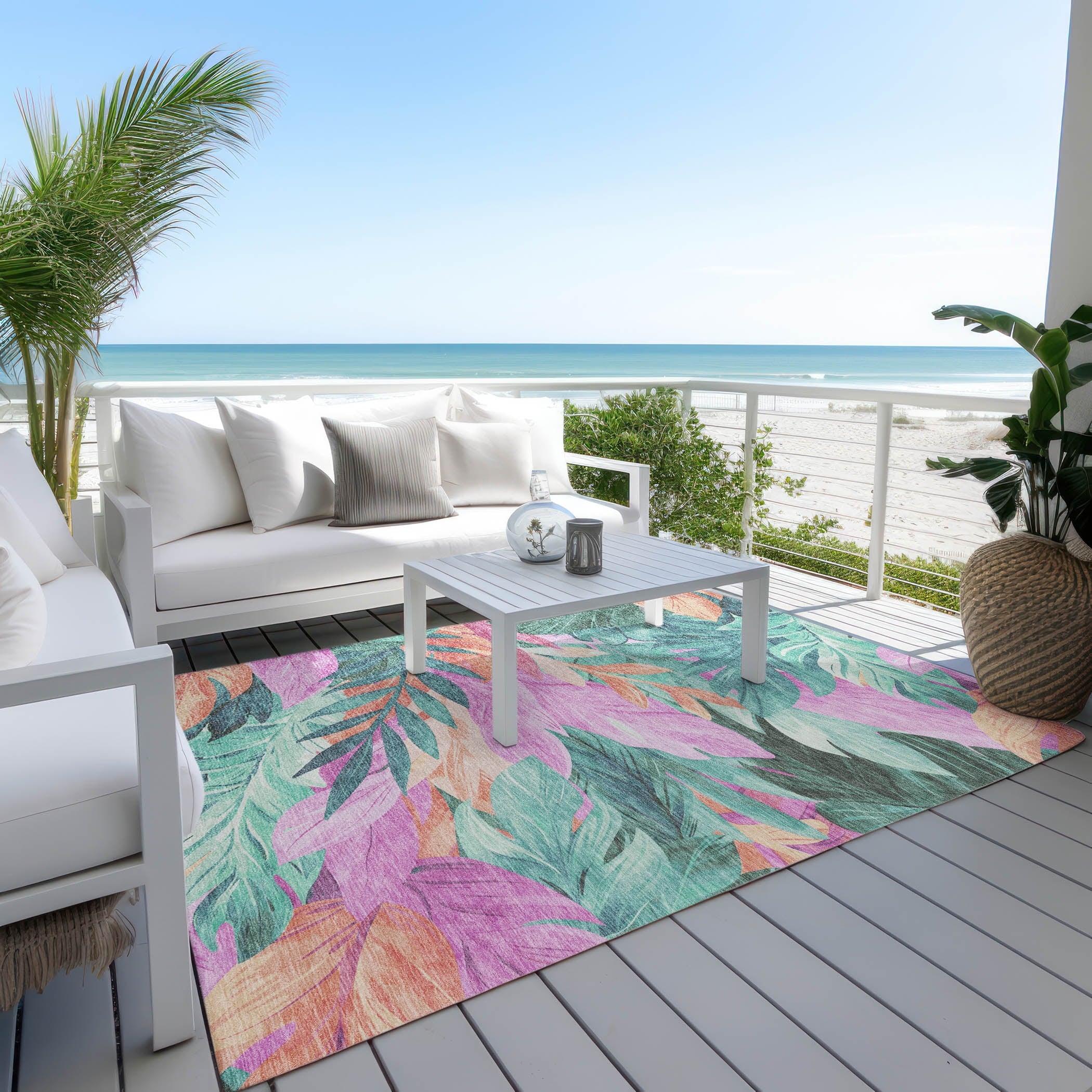 Transform your space with the tropical charm of overlapping leaves in this transitional rug. The stunning floral pattern brings a refreshing and exotic feel to your decor. UV stabilized for versatile use, it features an ultra-thin construction. This machine-washable rug is perfect for family and pet-friendly homes, ensuring easy maintenance.