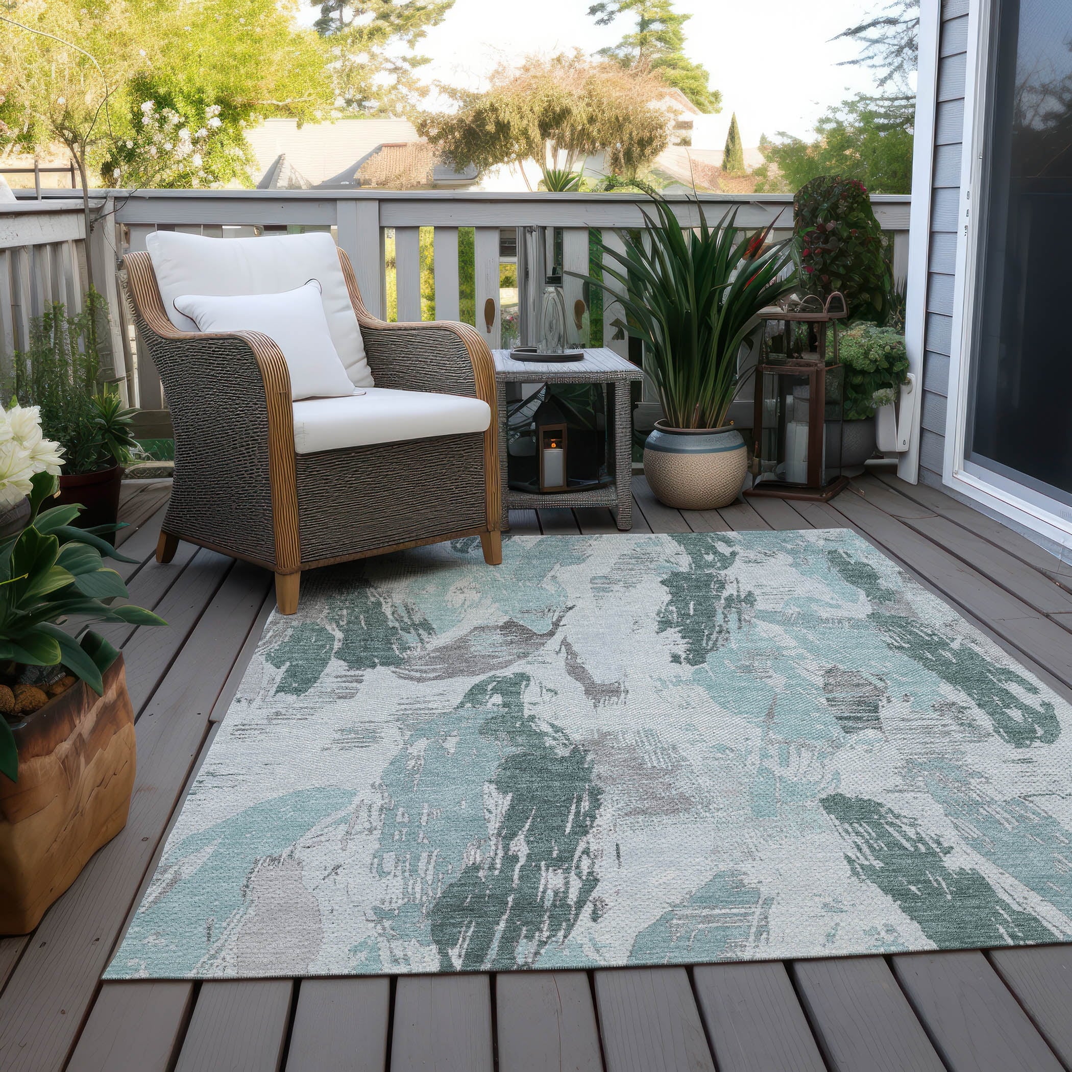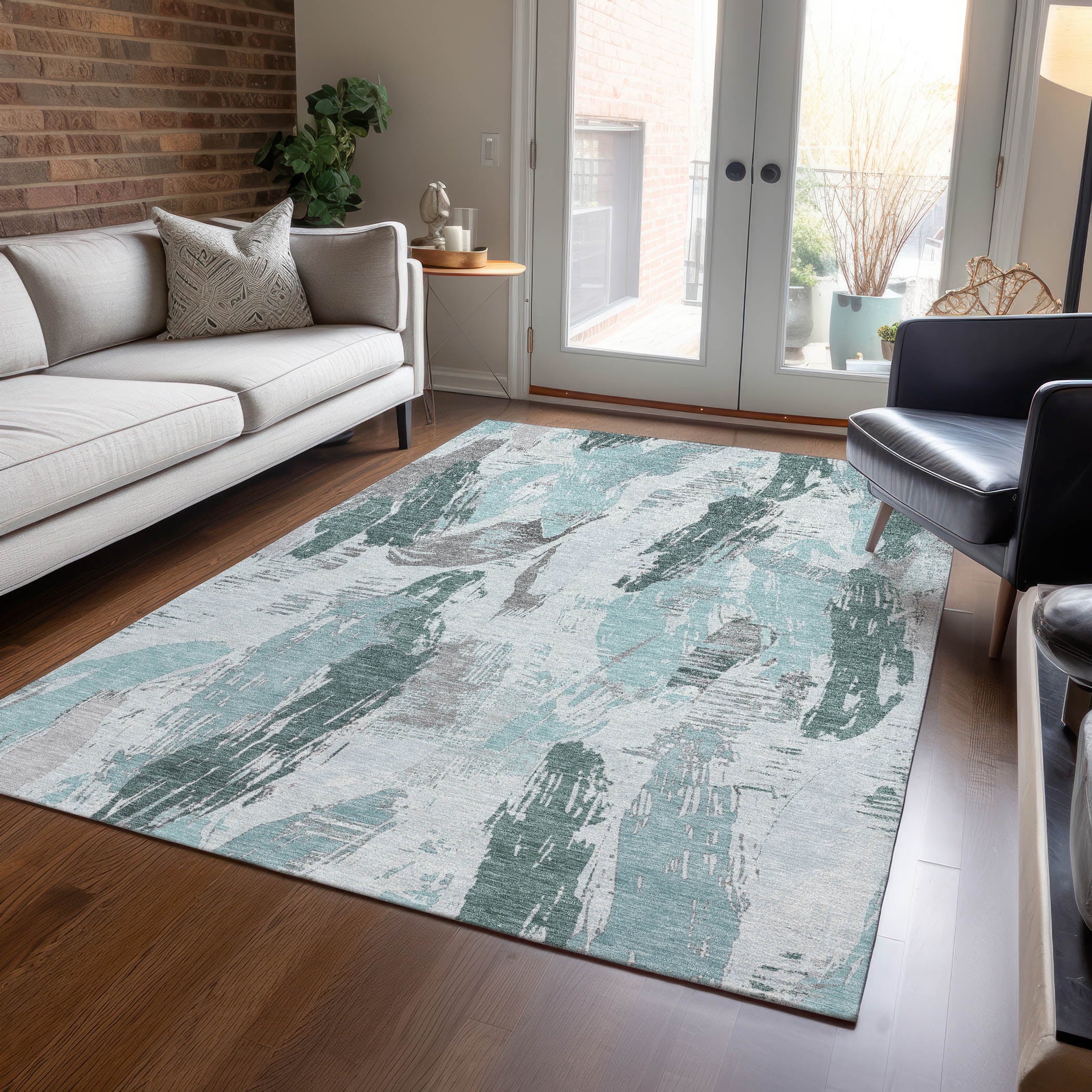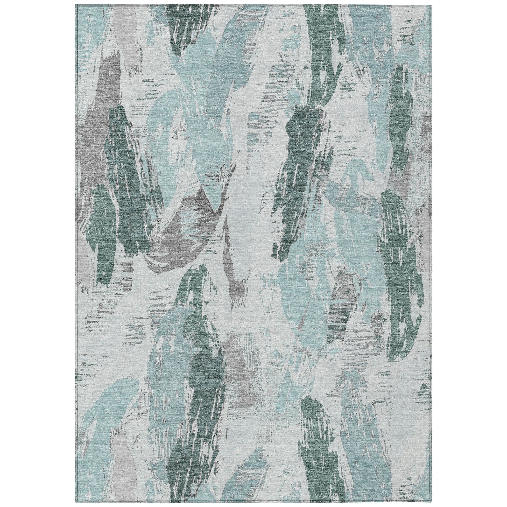Elevate your decor with the sophisticated charm of brush-like strokes of paint with an eclectic vibe in this transitional rug. The modern pattern adds a touch of artistic elegance to any room. UV stabilized for indoor or outdoor use, it features an ultra-thin construction. This machine-washable rug is family and pet-friendly, ensuring durability and easy maintenance.