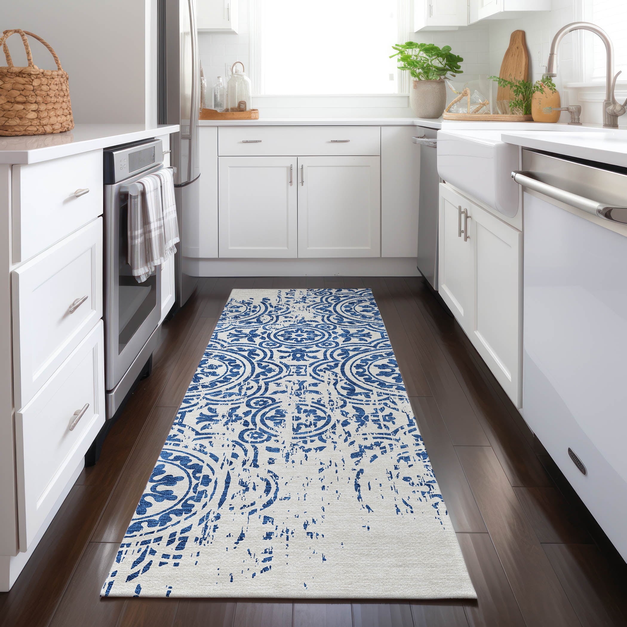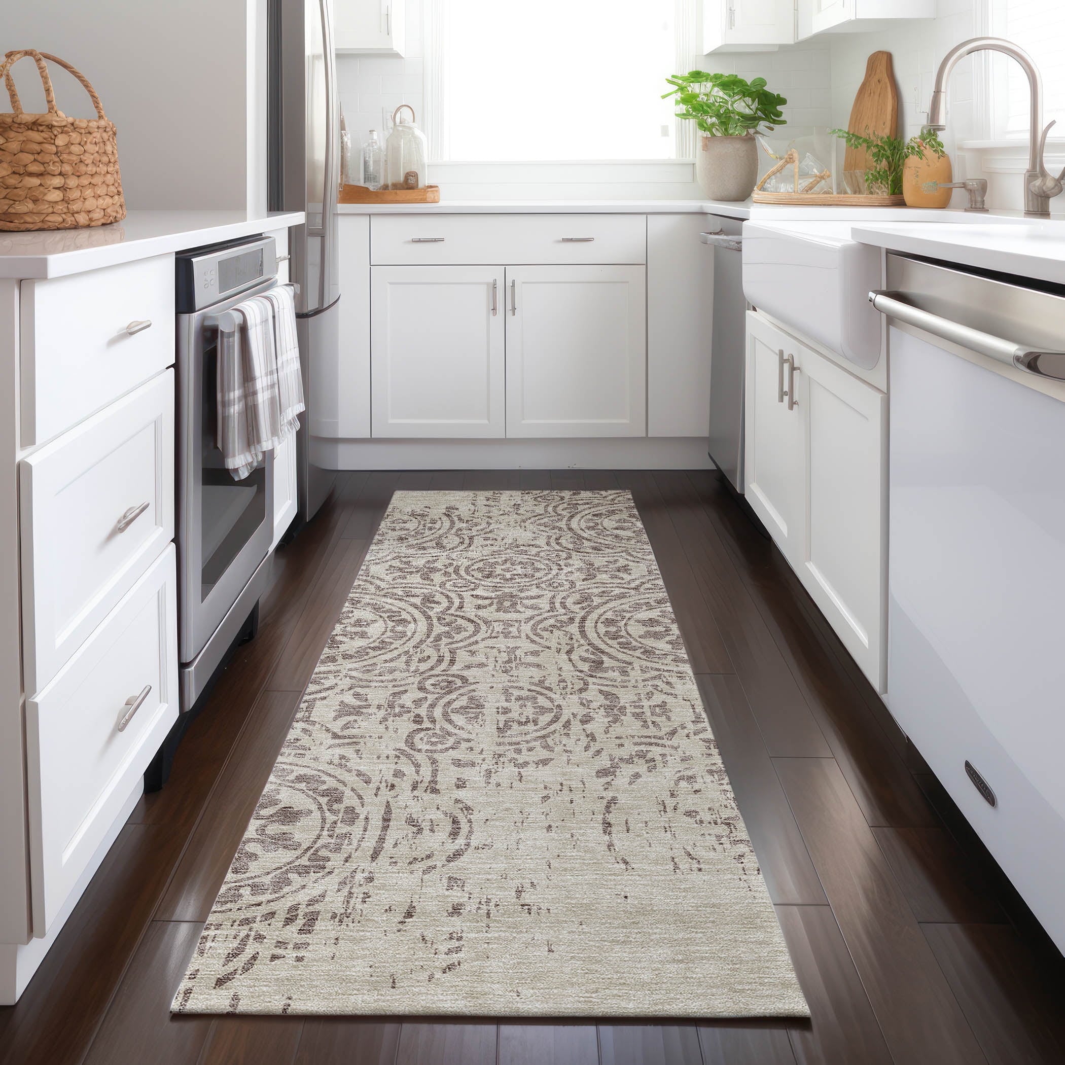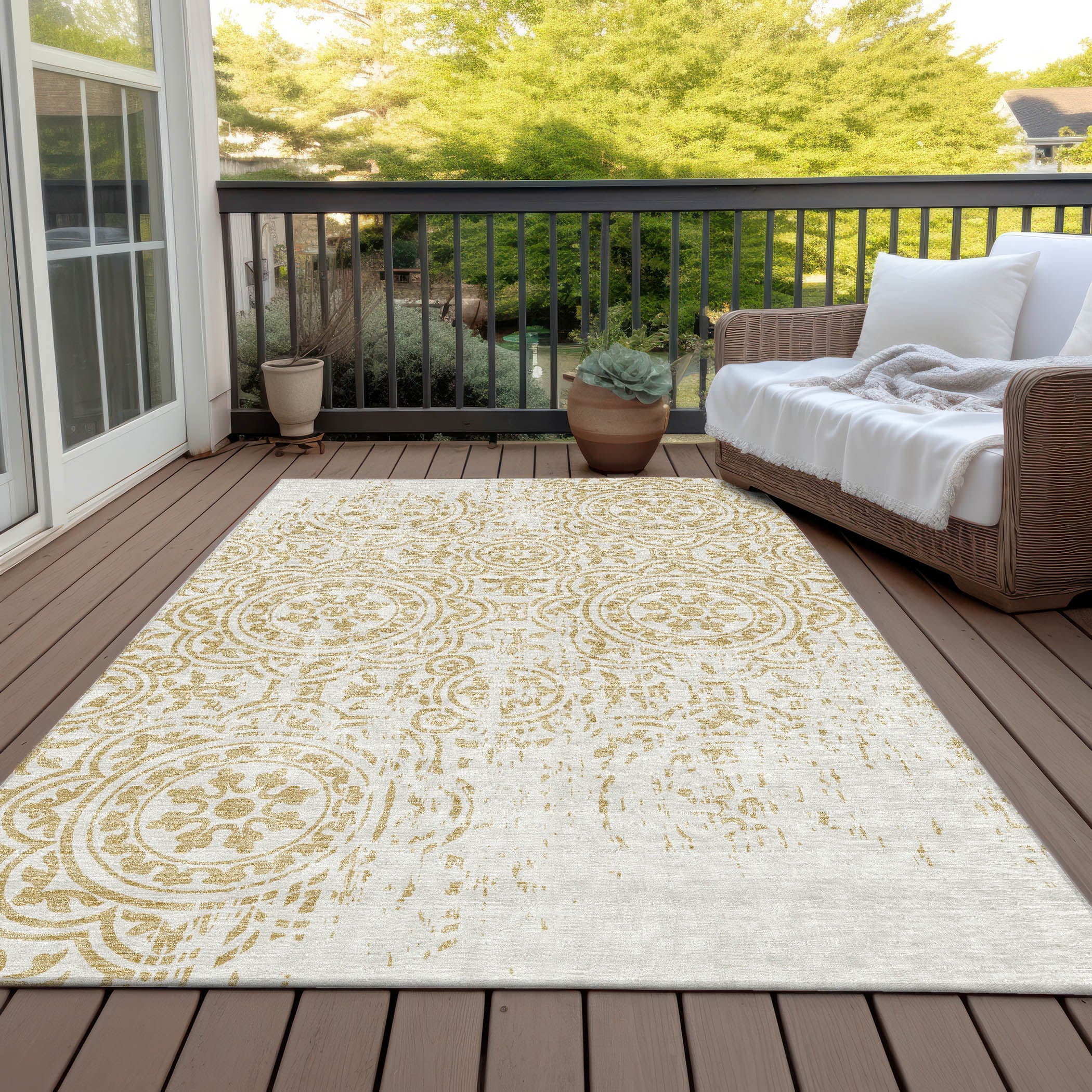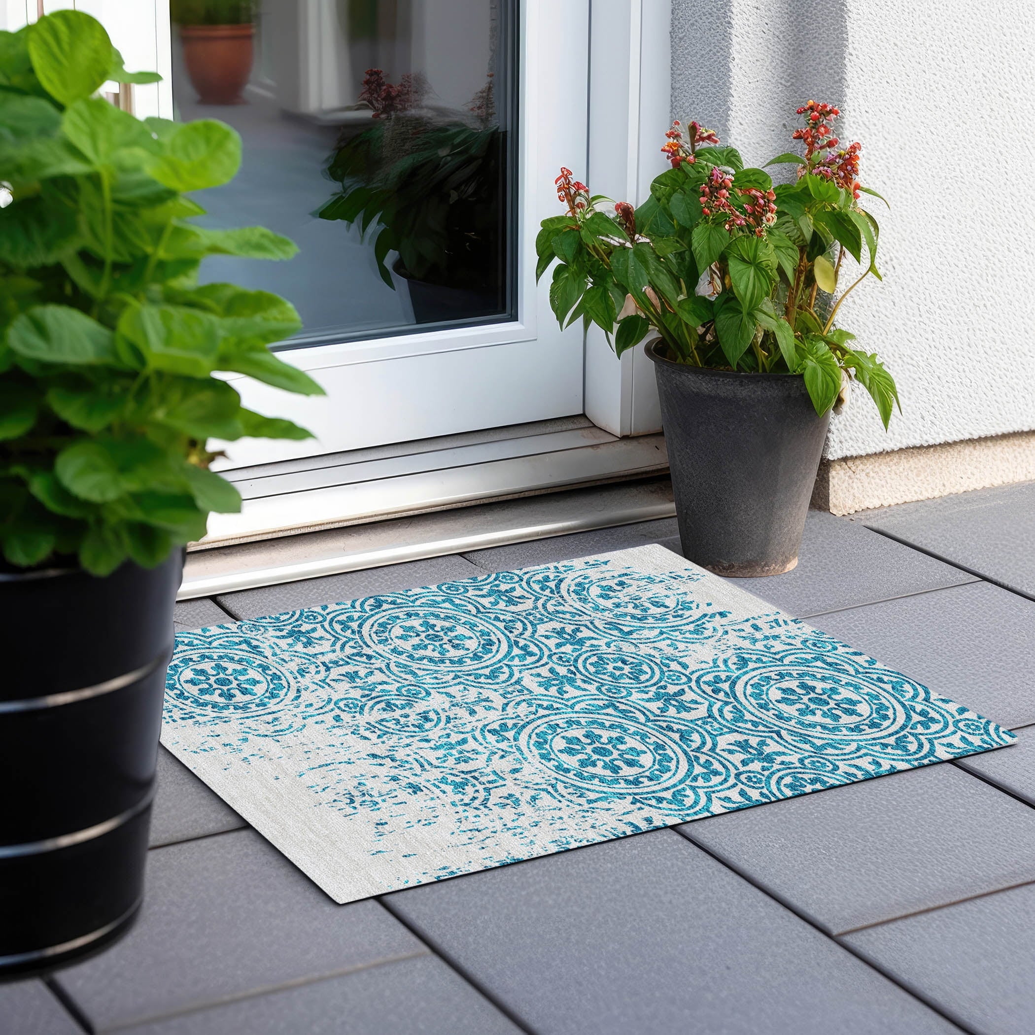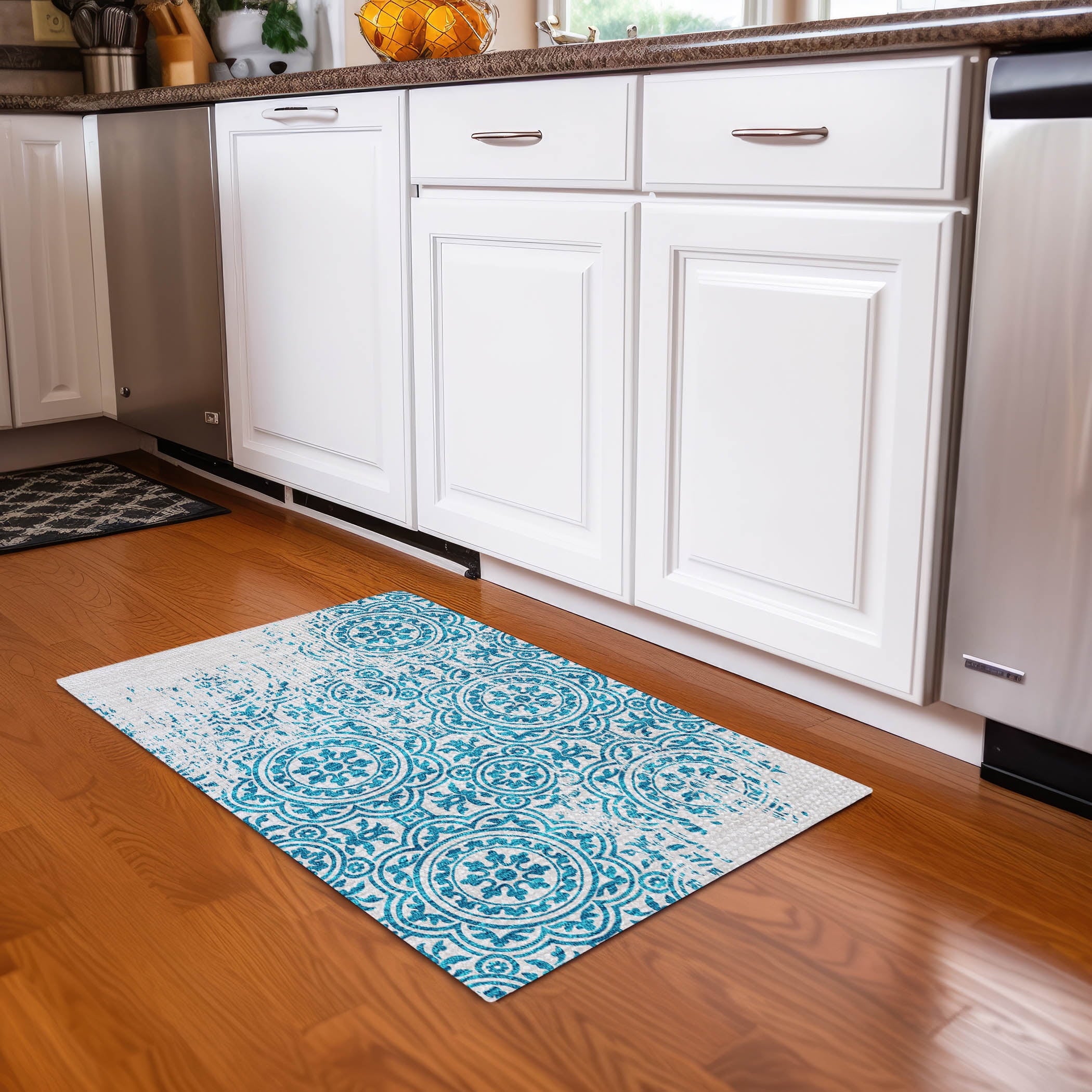 Let the intricate design of our transitional rug captivate you, featuring large-scale medallions set against open, airy corners. This rug’s delightful pattern infuses any space with a blend of classic and contemporary charm. Enhanced for both indoor and outdoor use, its ultra-thin construction makes it a versatile choice, while its machine-washable nature and compatibility with pets and family life add to its allure.