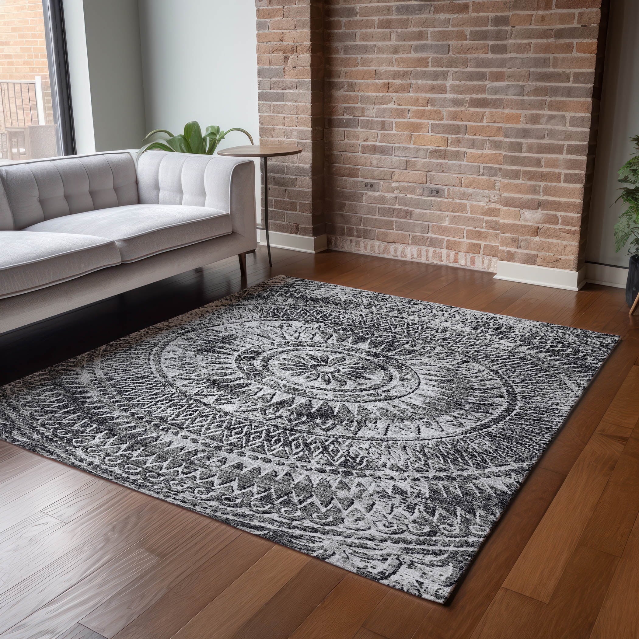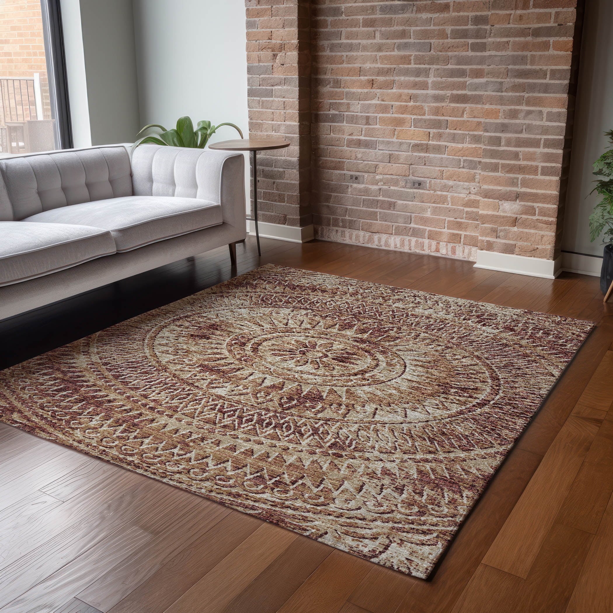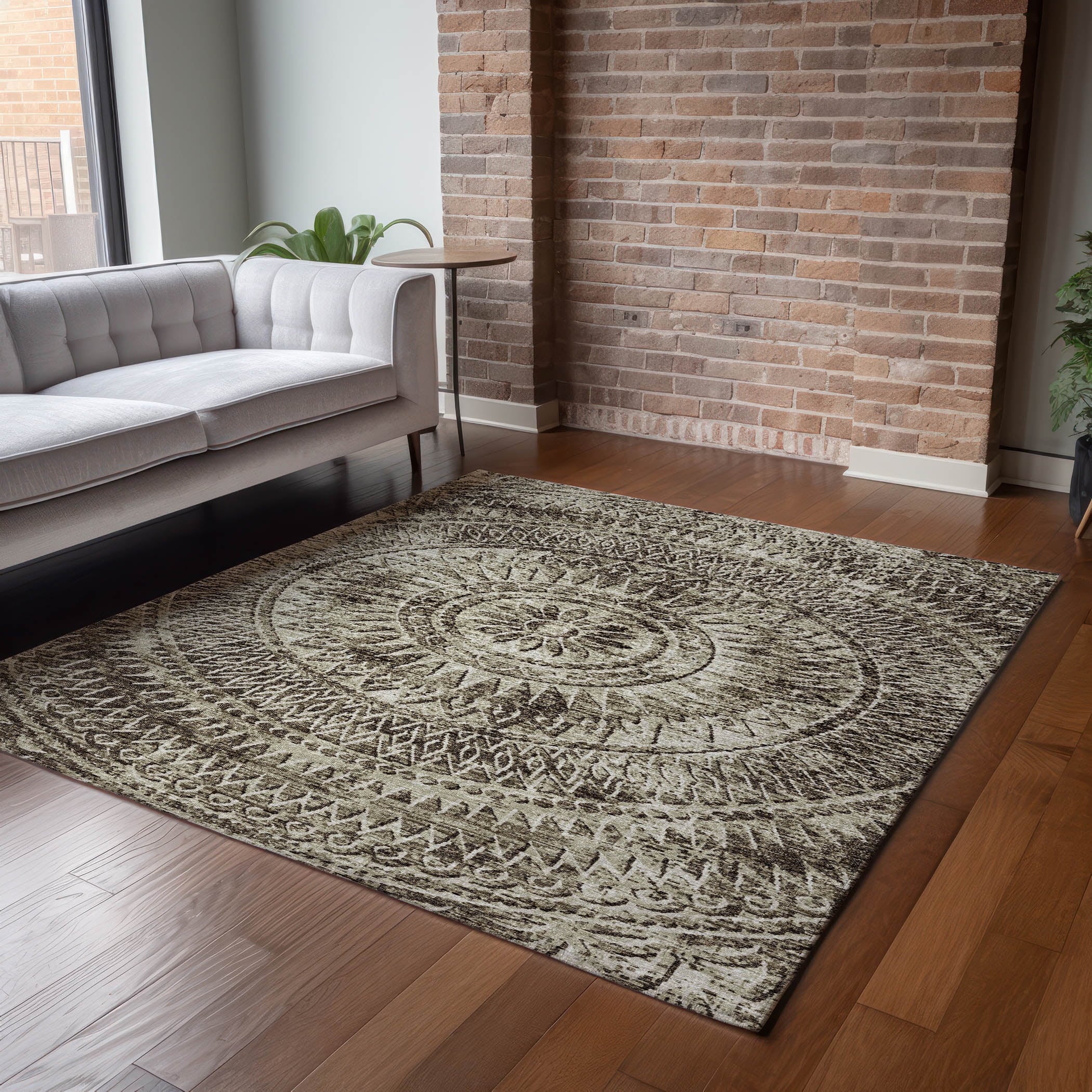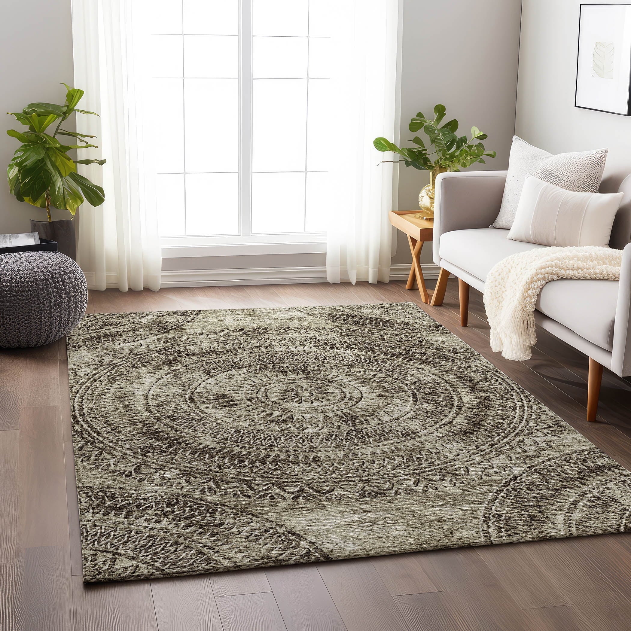 Introduce a touch of refined elegance to your floors with this rug, showcasing a distressed medallion center and harmonious semi-circular details in the corners, reflecting a transitional style. Perfect for indoor and covered outdoor areas, it offers a soft, thick, and plush microfiber pile. Its premium machine washable feature ensures the rug remains a practical addition to any dynamic home.