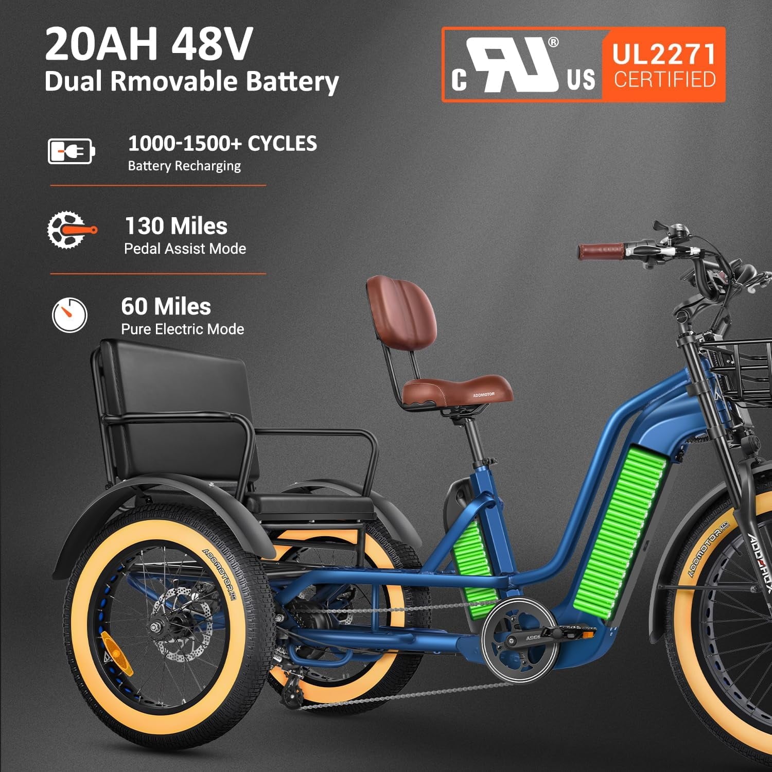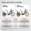 - 960Wh Dual Battery System: The GREATTAN L electric trike is available with both single battery and dual battery options. The single battery option features a 48V*20Ah built-in battery, covering up to 65 miles. The dual battery option is equipped with an additional rear battery, extending the range up to 130 miles. Choose the option that suits your needs and enjoy longer, faster, and more efficient rides.