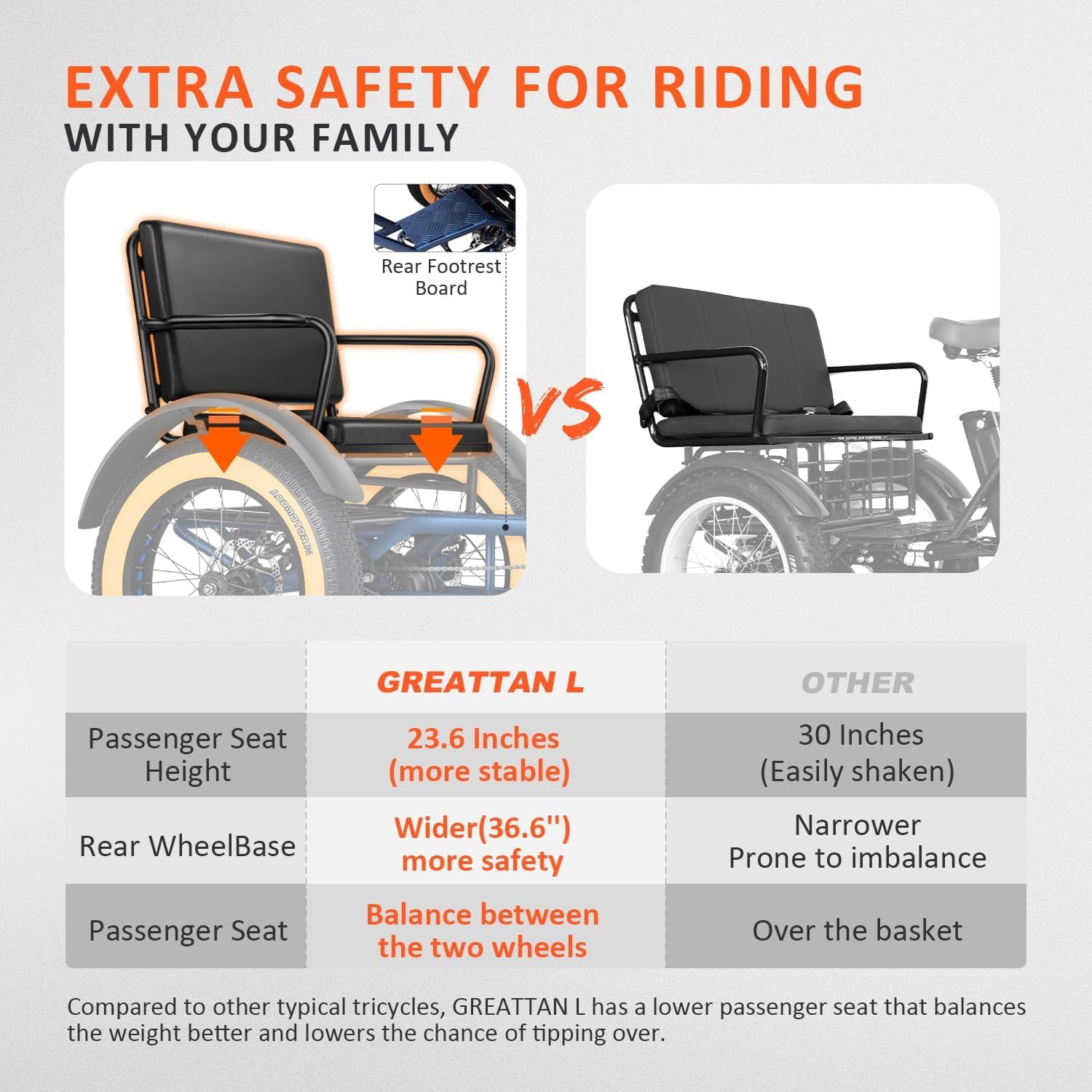 - Extra Security for Riding with Your Family: This electric trike with a passenger seat, which you could take your kids, dogs or the others together to have a wonderful outdoor recreation. Besides, compared to other typical tricycles, GREATTAN L has a lower passenger seat that balances the weight better and lowers the chance of tipping over.