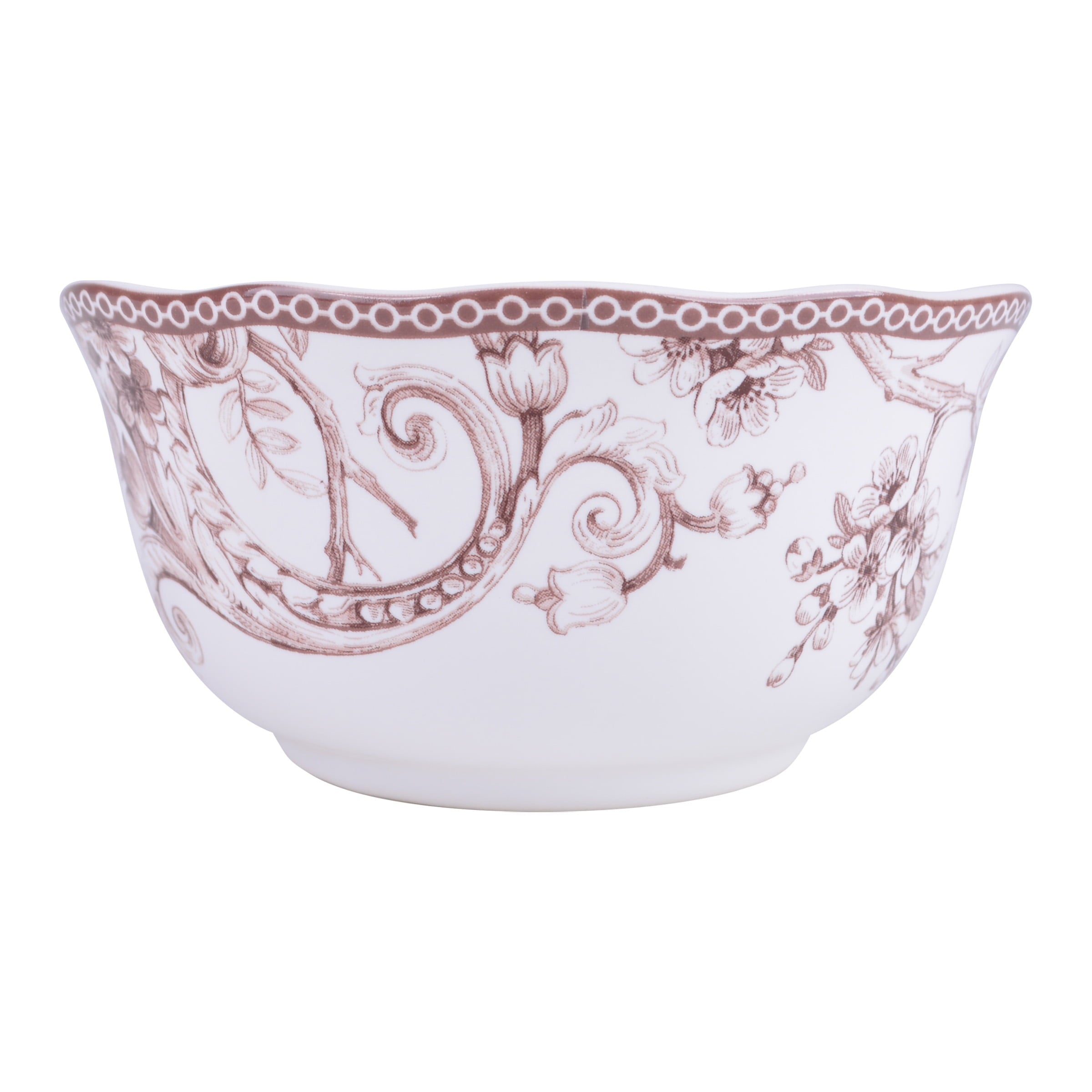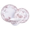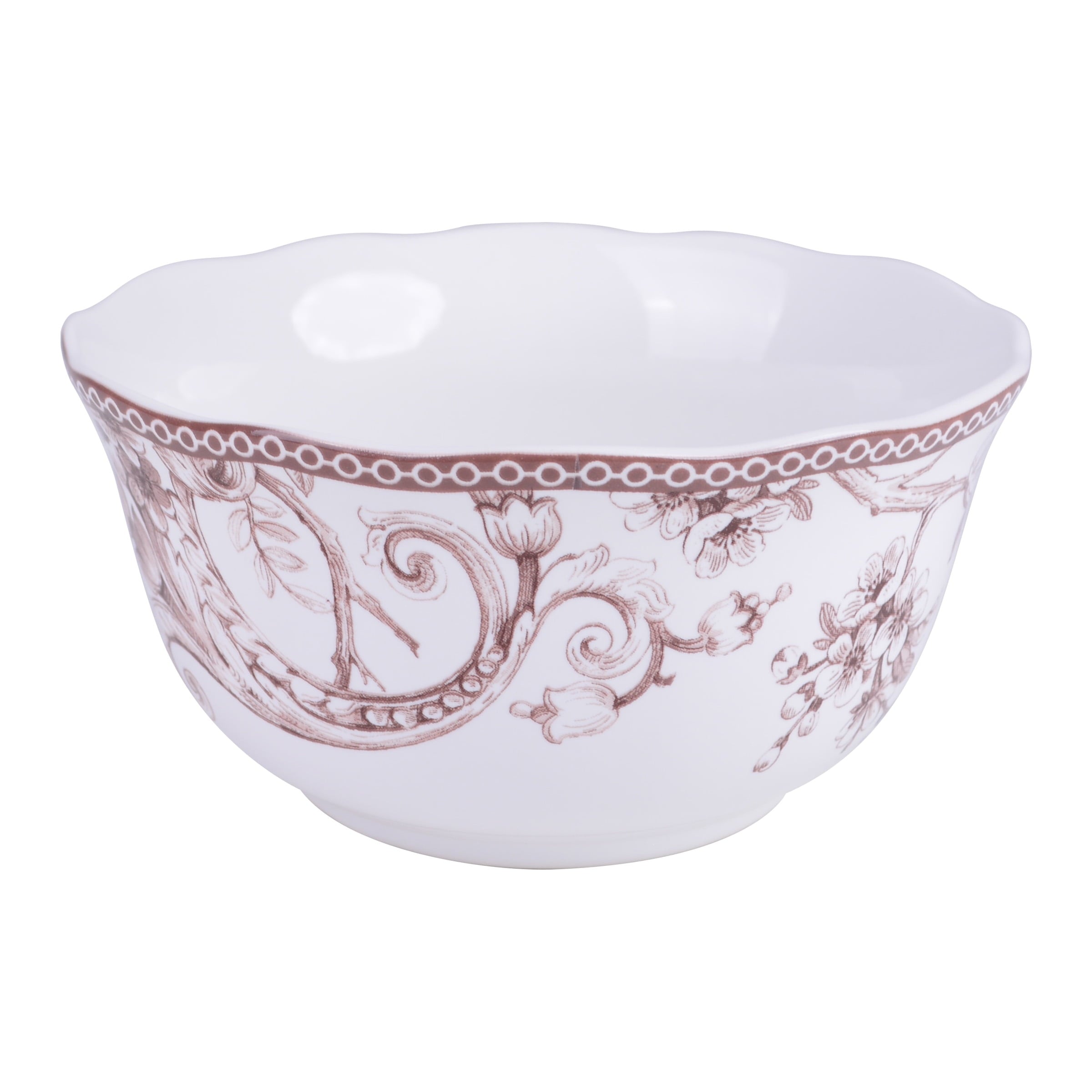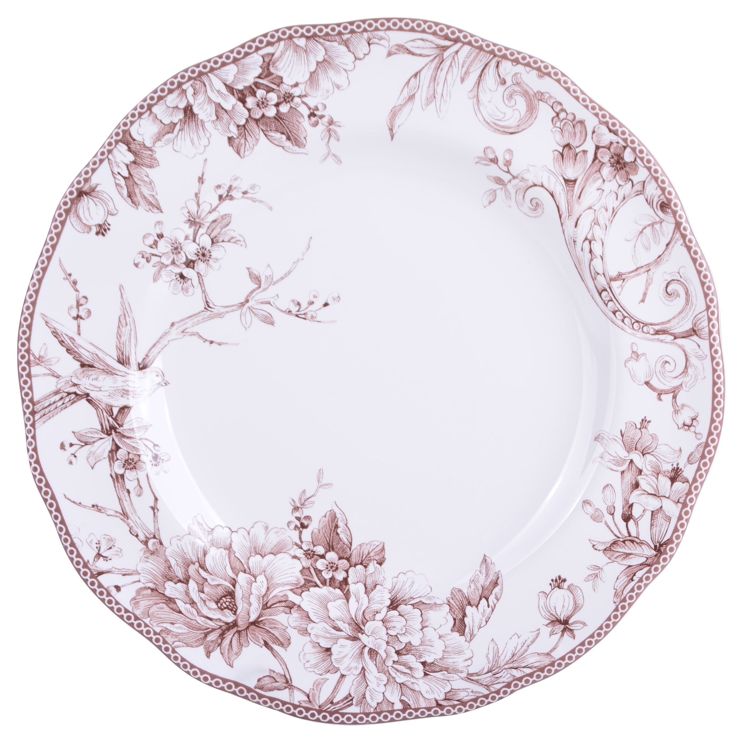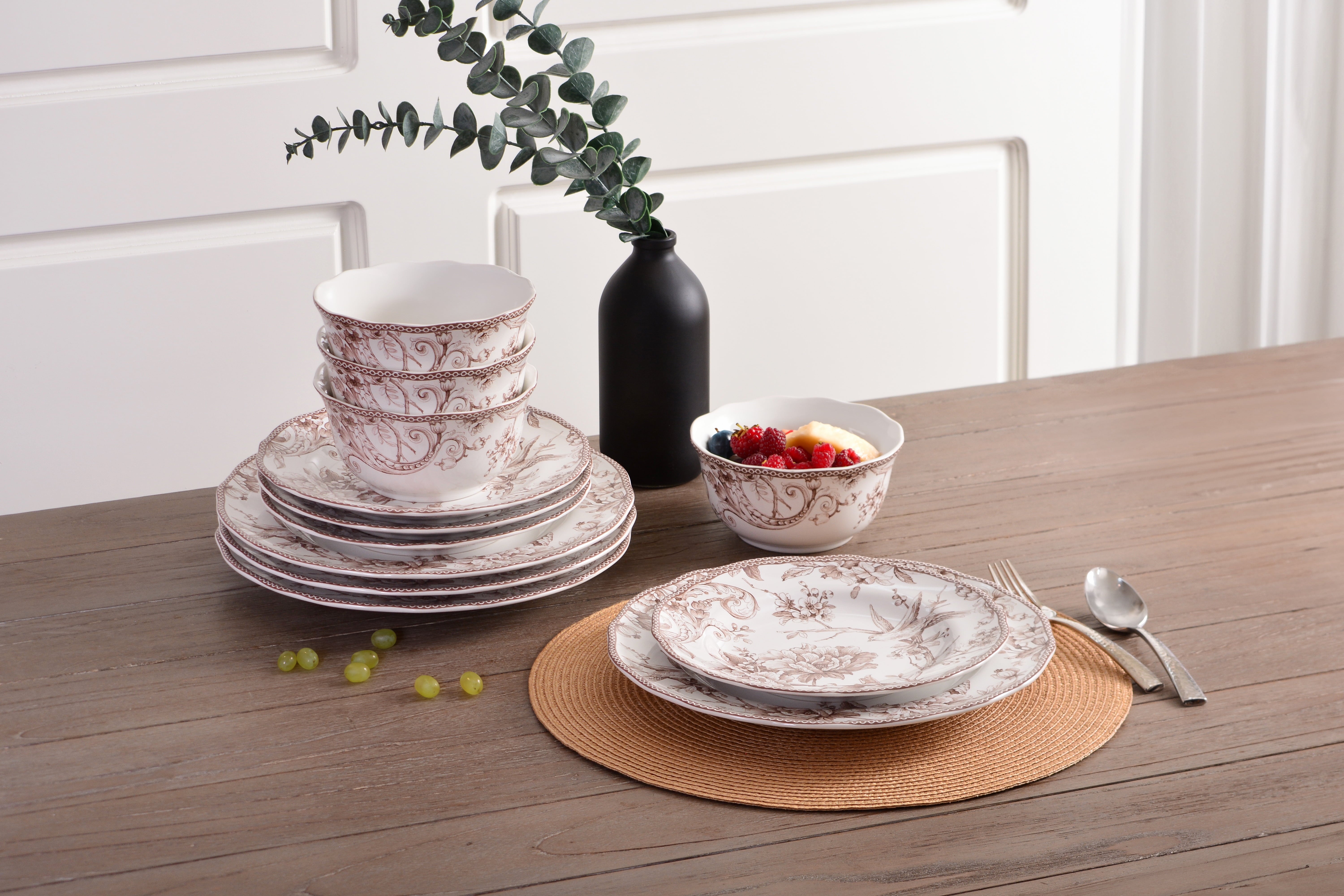 Elevate your dining experience with the Adelaide Brown on White Porcelain 12 Pc Dinnerware Set. Crafted from durable porcelain, this elegant collection features a romantic spring scene of birds singing among flowering branches, inspired by a 1770s Toile pattern. The timeless design and classic style of this porcelain dinnerware set make it a refined and practical choice for your home. Safe for the microwave and dishwasher, the set includes dinner plates, salad plates, and cereal bowls, serving a party of four. With a 1-year manufacturer warranty, this versatile and beautiful dinnerware set will add a touch of sophistication to your table for years to come.