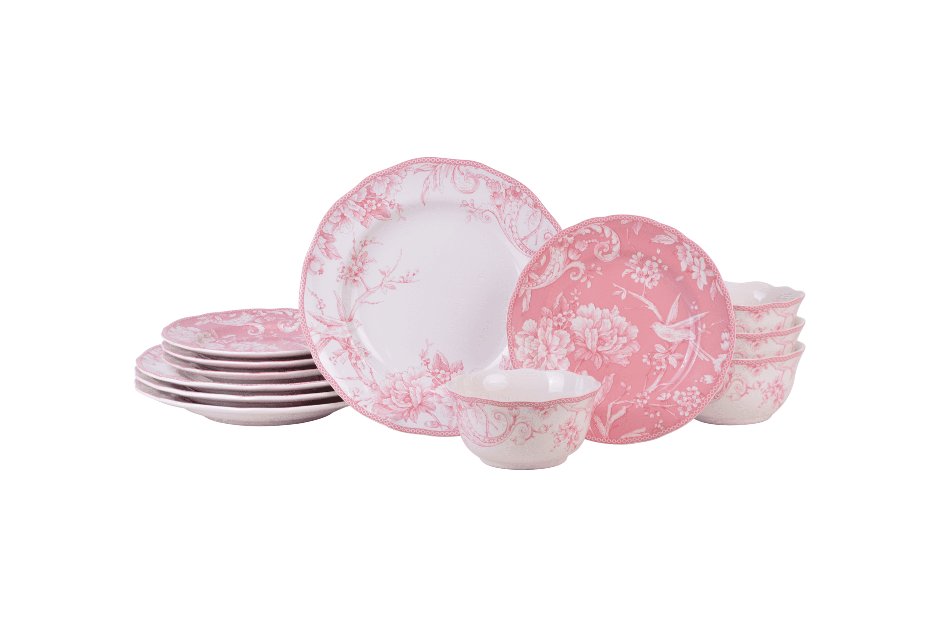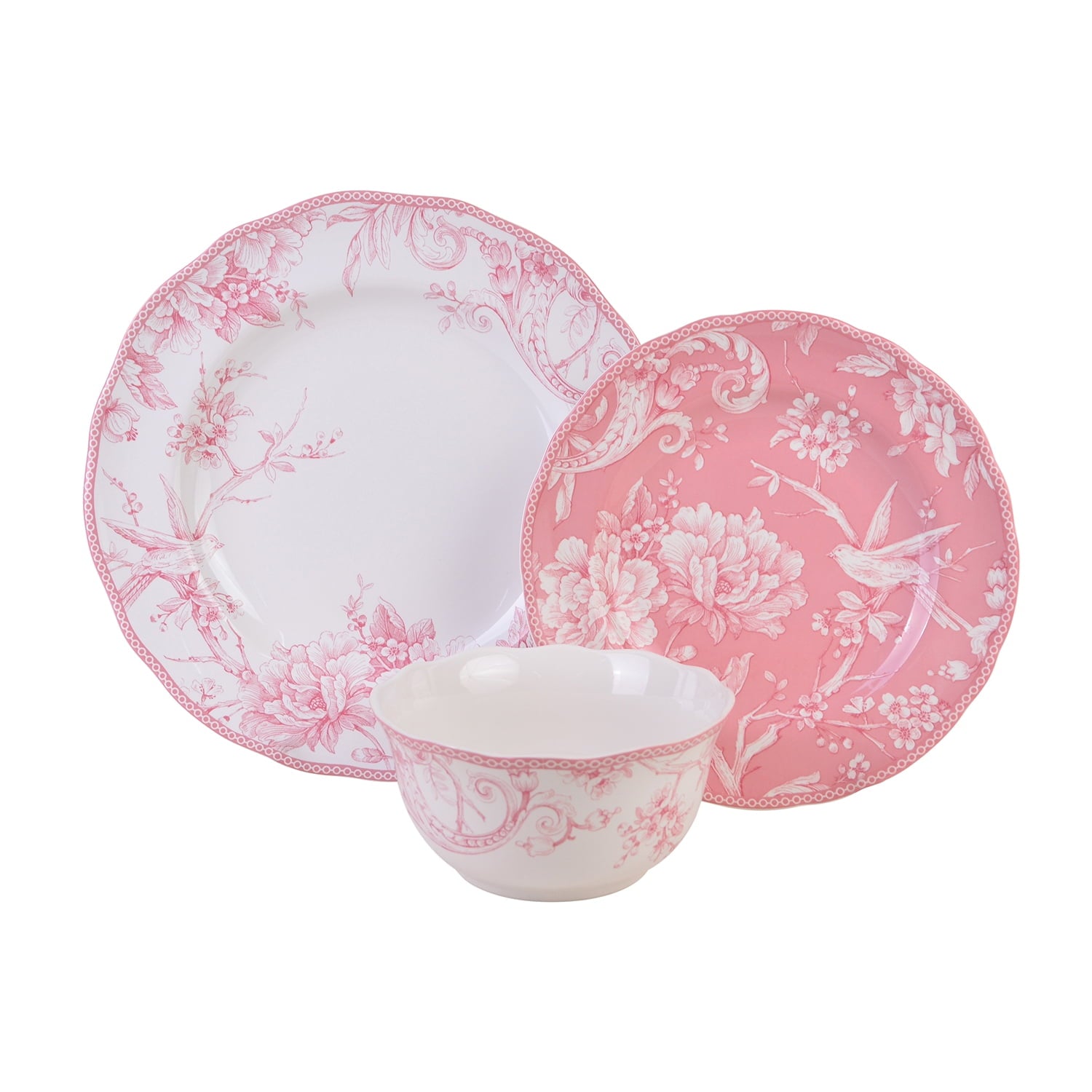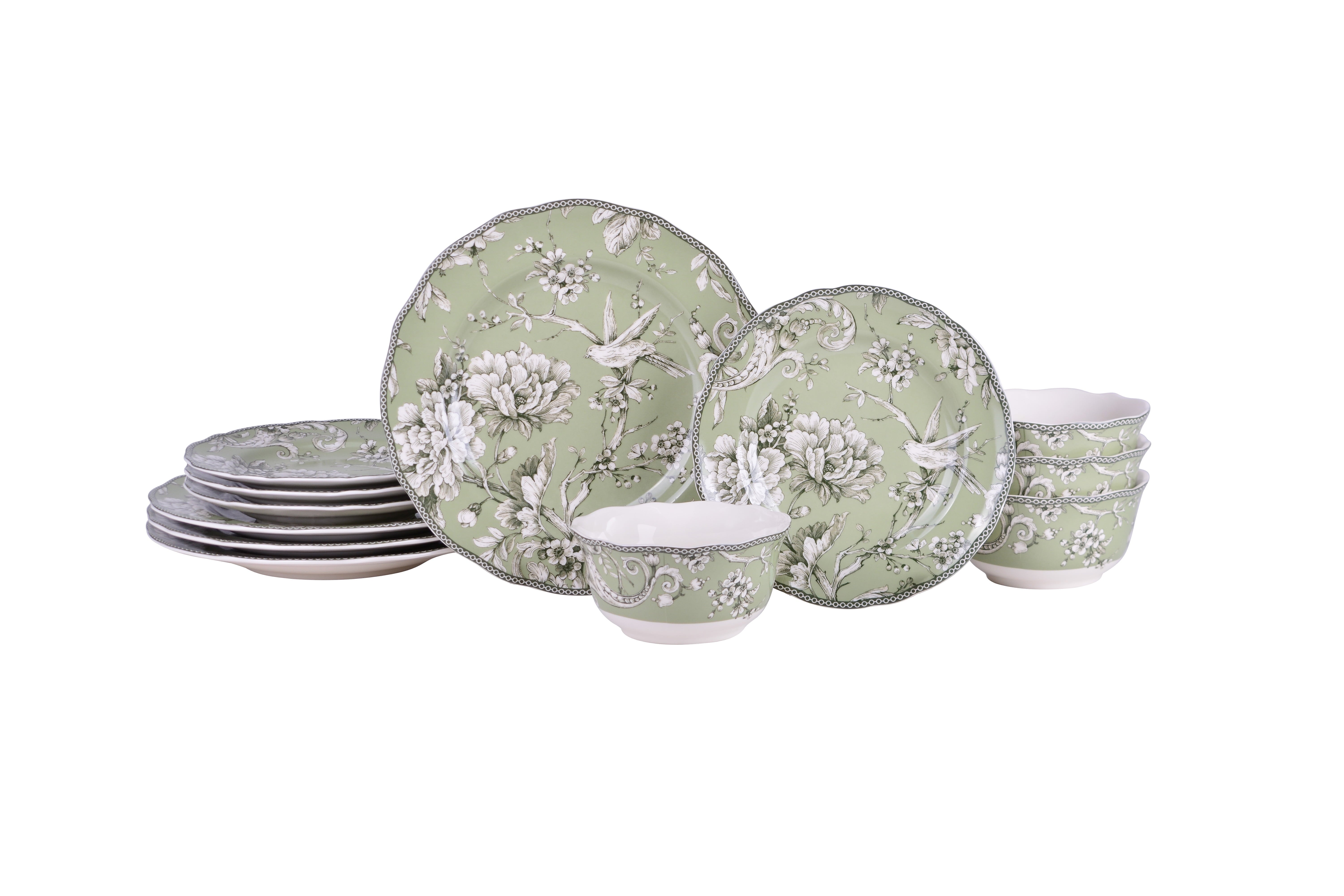 - Inspired by a 1770s Toile pattern, the set features a romantic spring scene of birds singing among flowering branches in an intricate woodland tableau.