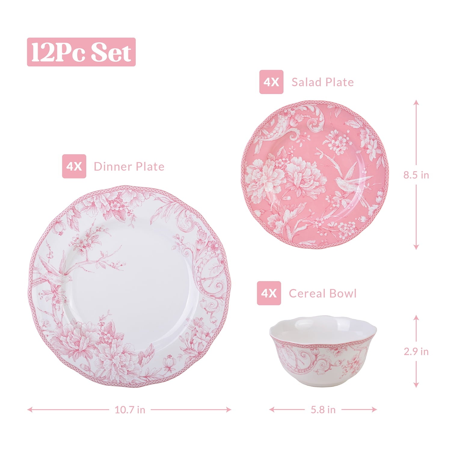 - The set includes 4 dinner plates, 4 salad plates, and 4 cereal bowls, perfect for serving a party of 4.