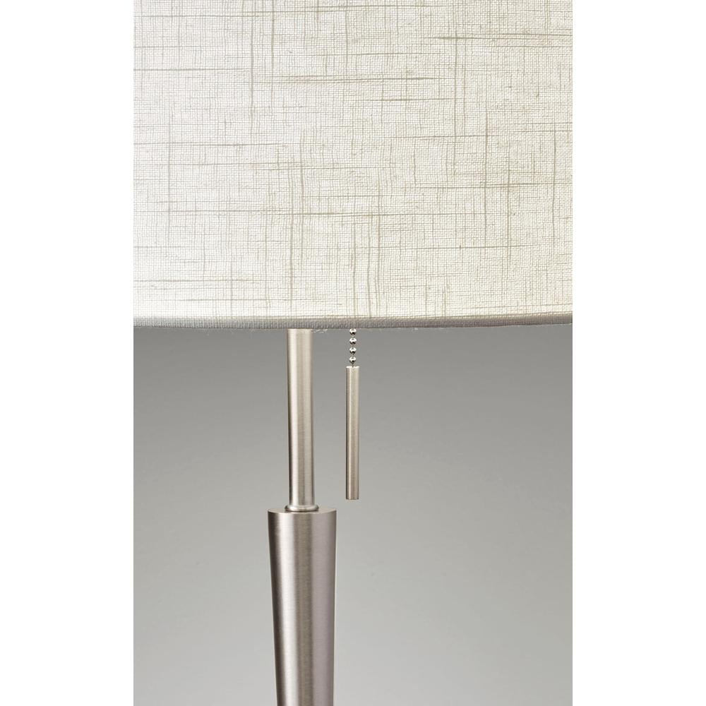 - Product Specifications: Brushed steel finish, textured white fabric shade, on/off pull chain switch, 65 in. height