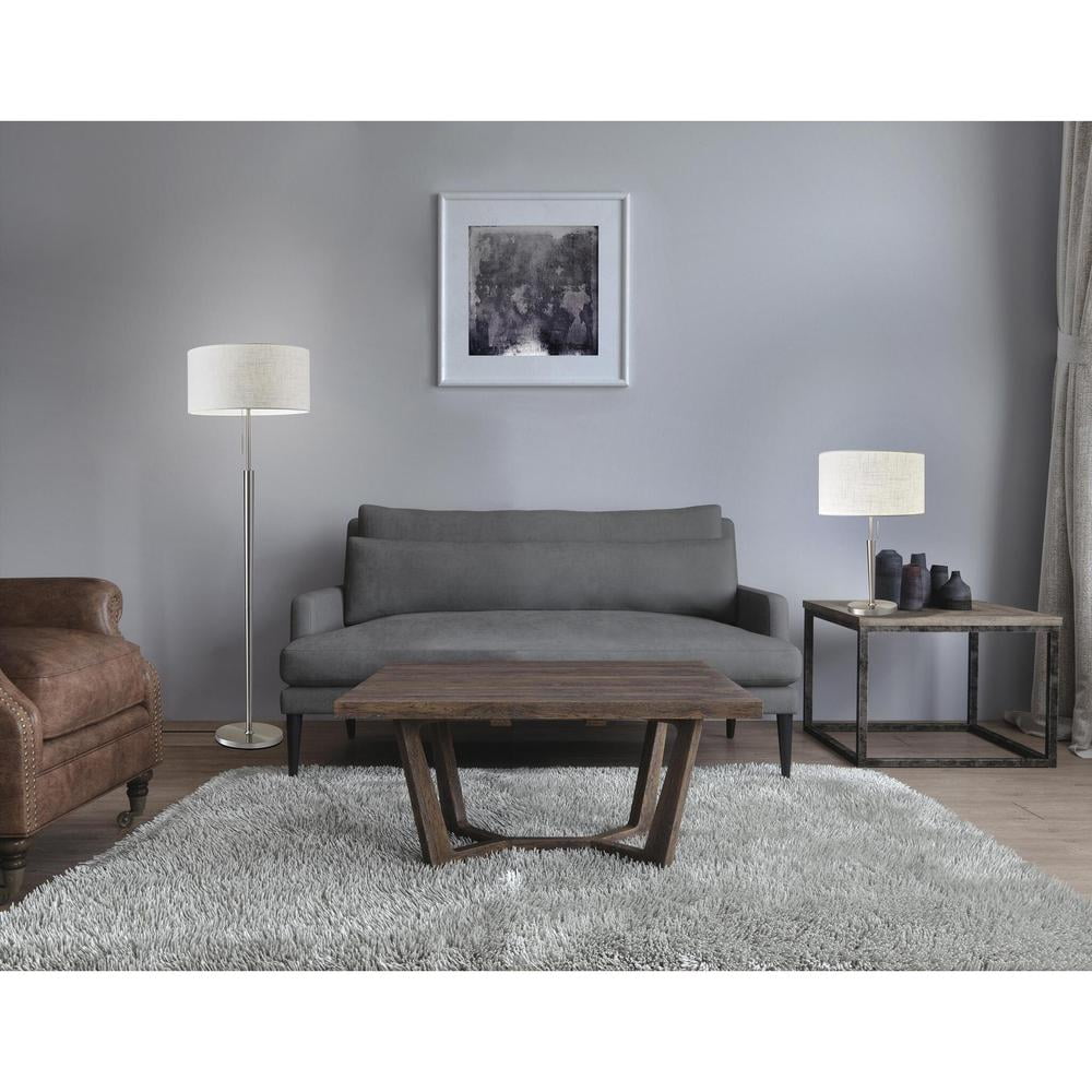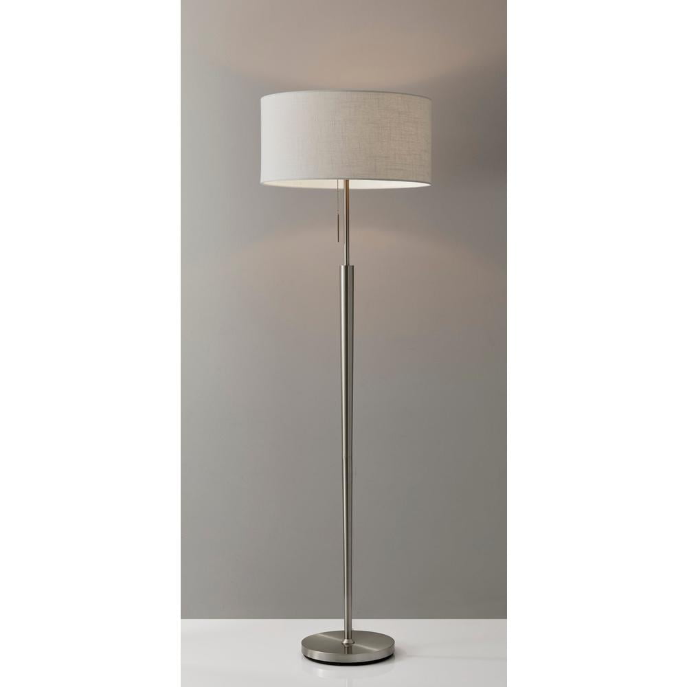 Simplicity meets modern in the elegant Hayworth floor lamp. A beautifully textured white linen drum shade is paired with a tapered brushed steel pole. This timeless style is perfect for a living room, bedroom, office or den. A pull chain switch easily turns the lamp on and off. This lamp has a clear cord and is smart outlet compatible. Bulb is not included in the packaging.