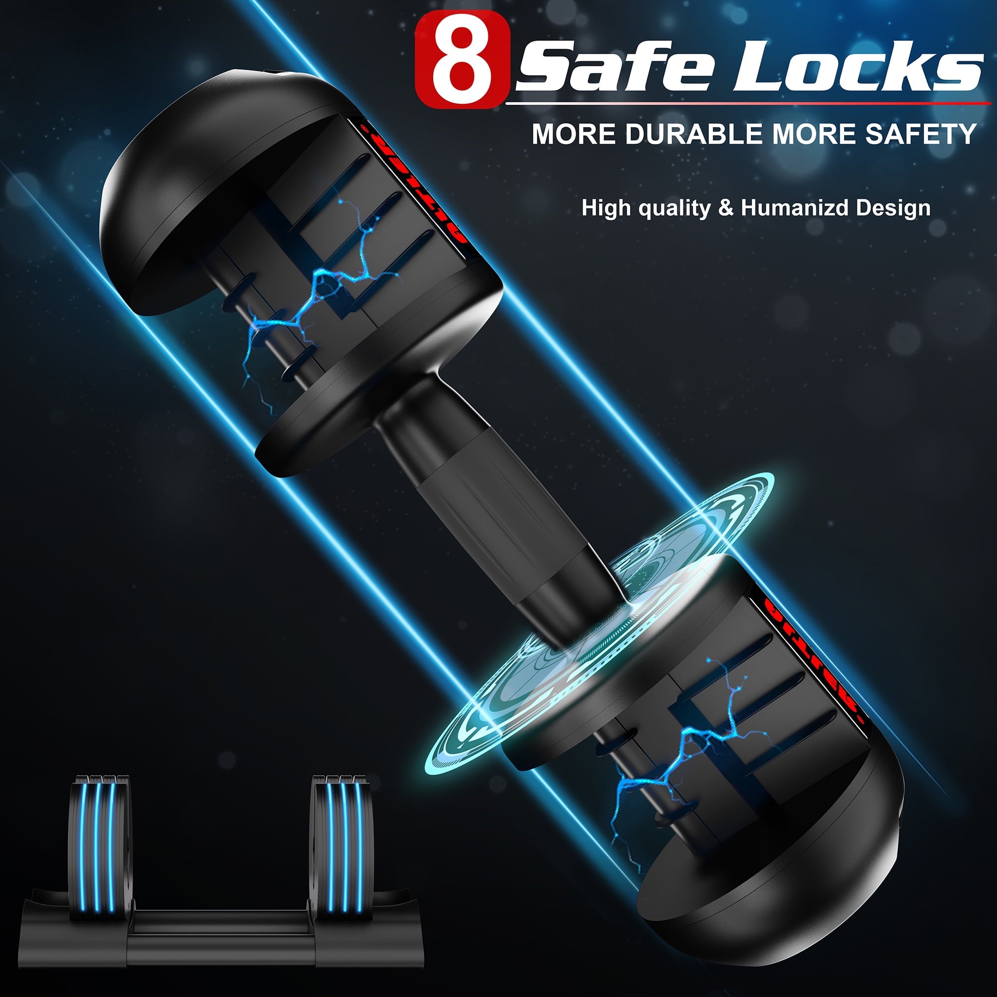 • Safe Locking System- We are applying a strong structural and 100% safety ensured lock system both on the counterweight and on the tray, which ensure the dumbell set are fastened stably and tightly to ensure your safety. No more weight plate fallen off during exercise