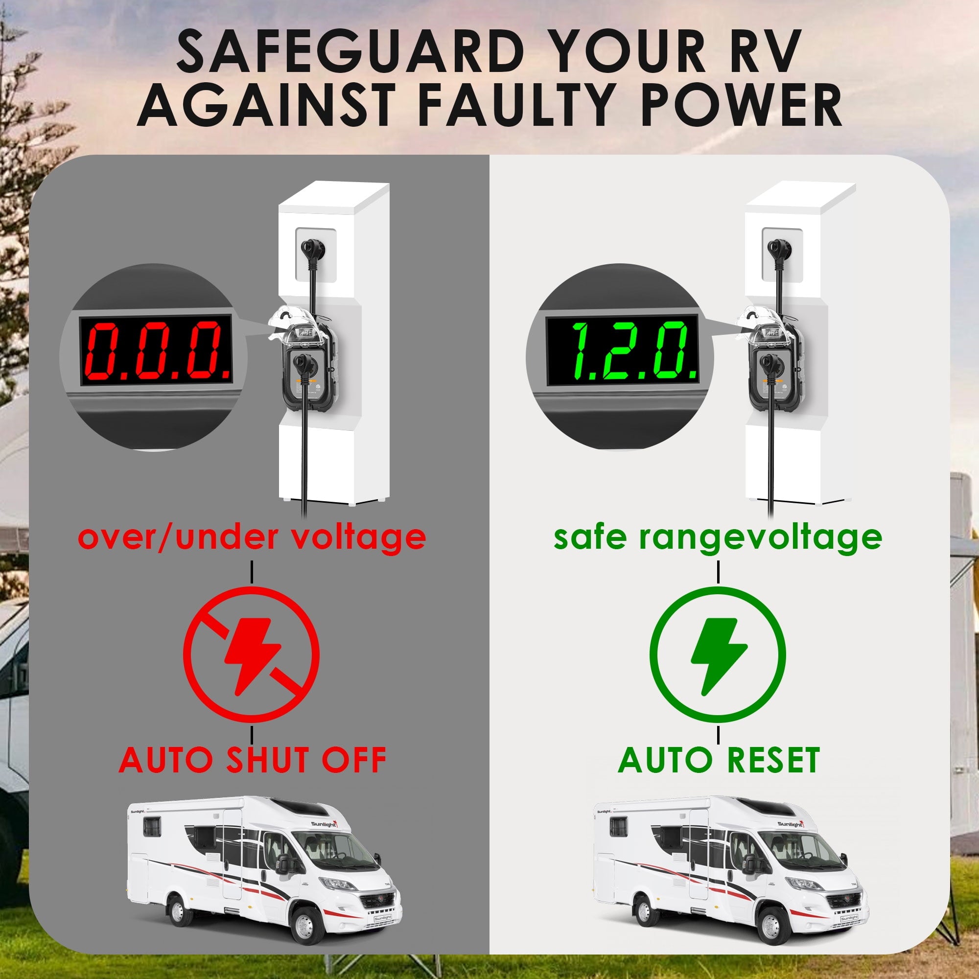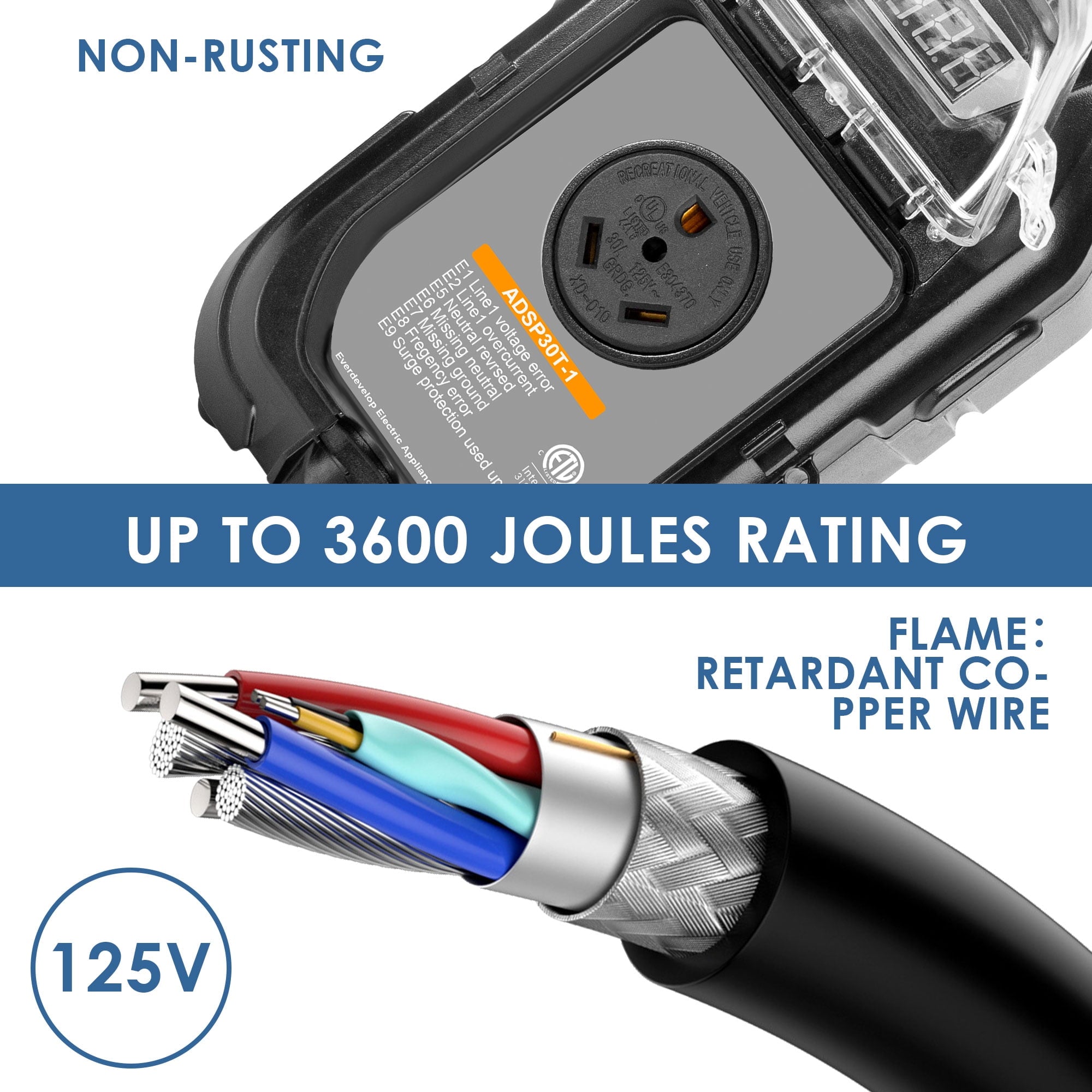 - With a robust 3600J rating, 30 Amp surge protector for RV offers highly effective defense against power surges. Over-voltage and low-voltage power-off protection, over-temperature power-off protection function providing reliable protection for your RV while also preventing damage to itself.