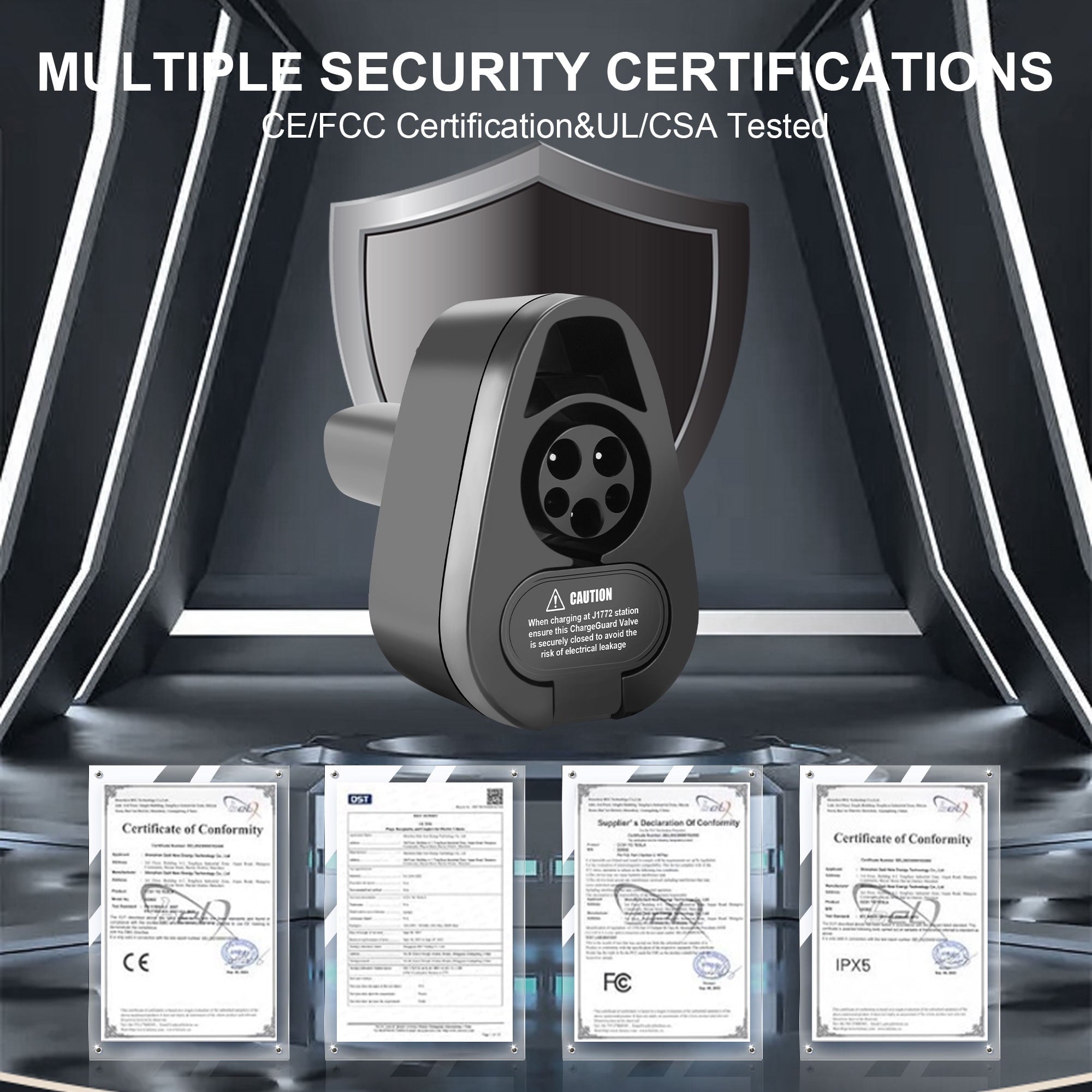 - 🥇Innovative ChargeGuard valve design,locking charging port when the adapter is used with the J1772 charger,preventing other current influences and avoiding potential safety hazards,ensuring safe charging at all times.The security guarantee with FCC/CE/IPX5 security certification.