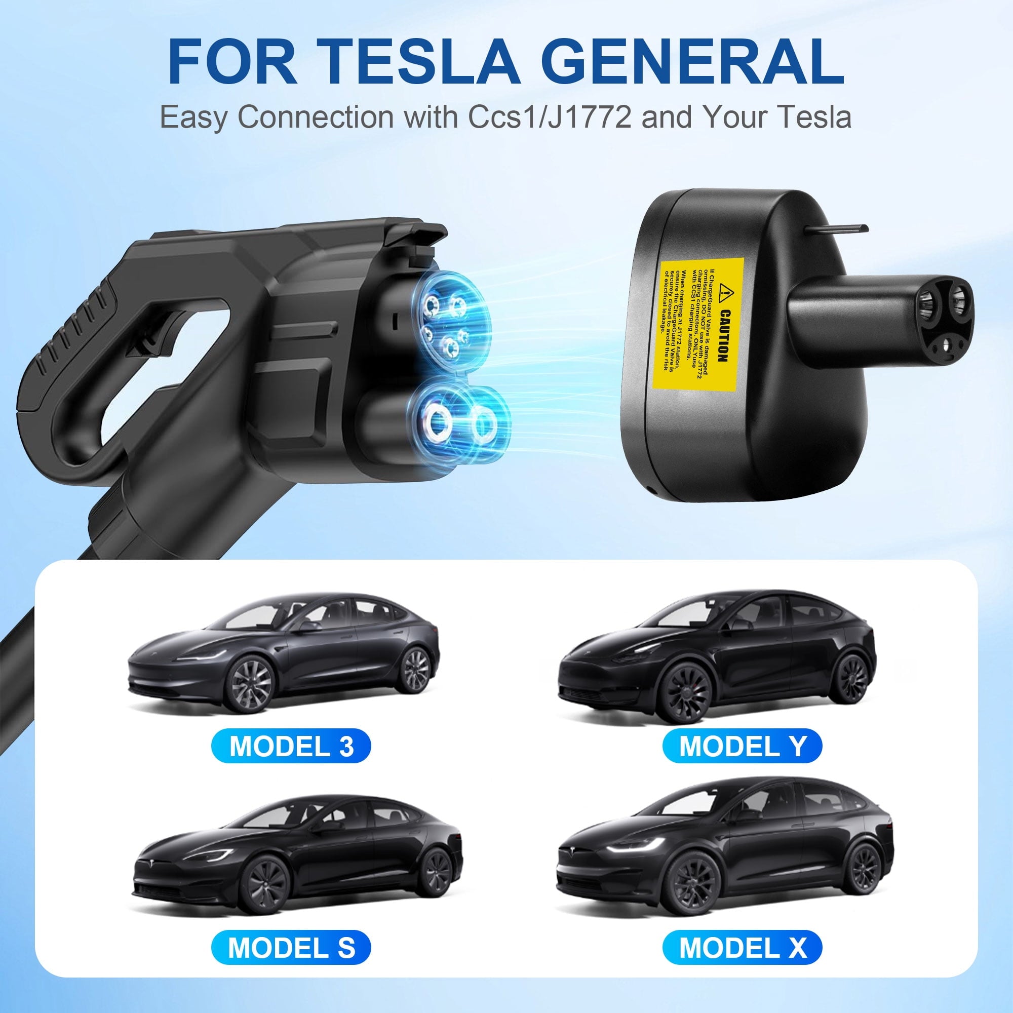 - The ADSAFE 2 in 1 adapter connects CCS1/J1772 chargers to all TESLA Y/3/X/S models. It allows Tesla to connect both CCS DC fast charging and J1772 AC charging at Level 1/2/3 charging stations, giving you the freedom to charge your Electric Vehicle whenever and wherever your charger is not available.
