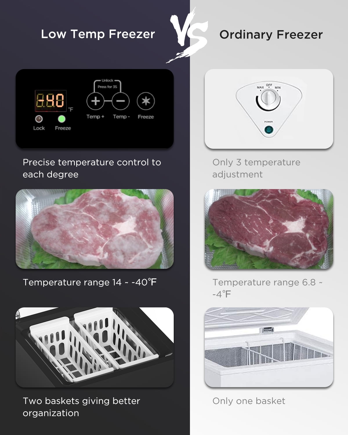• Ultra-Low Temperature Down to -40°F        Reach -40°F (-40°C), ideal for preserving biological samples, pharmaceuticals, and food items sensitive to temperature fluctuations.Built with energy-saving technology, ensuring efficient operation without compromising on performance, helping you save on electricity costs.