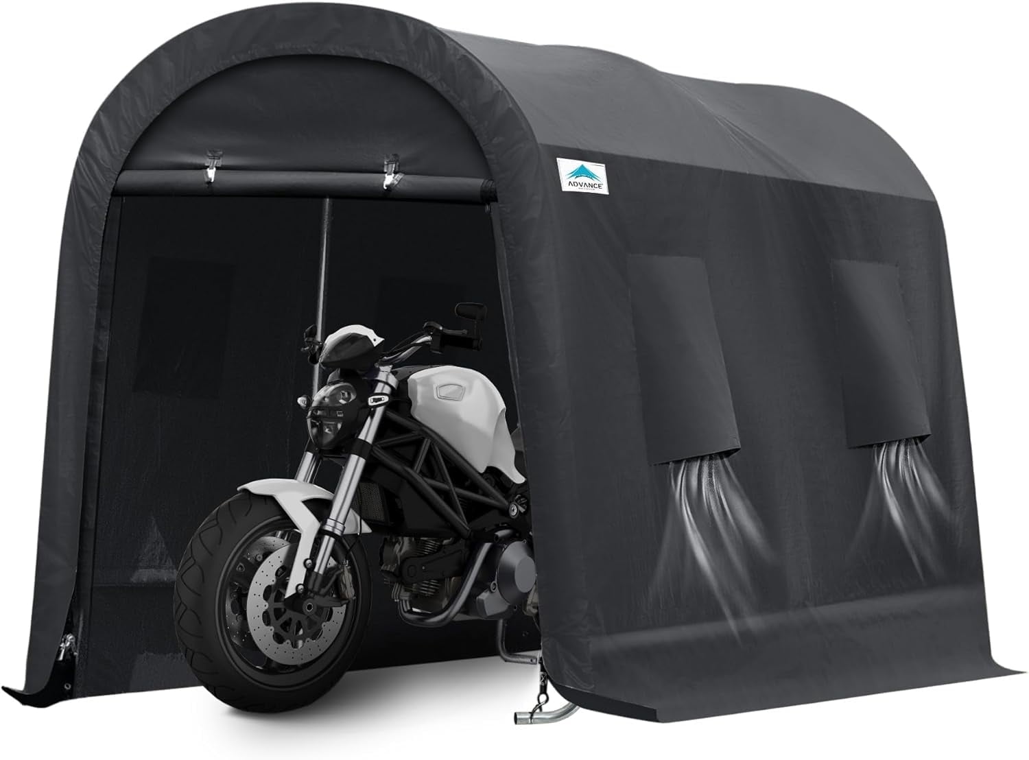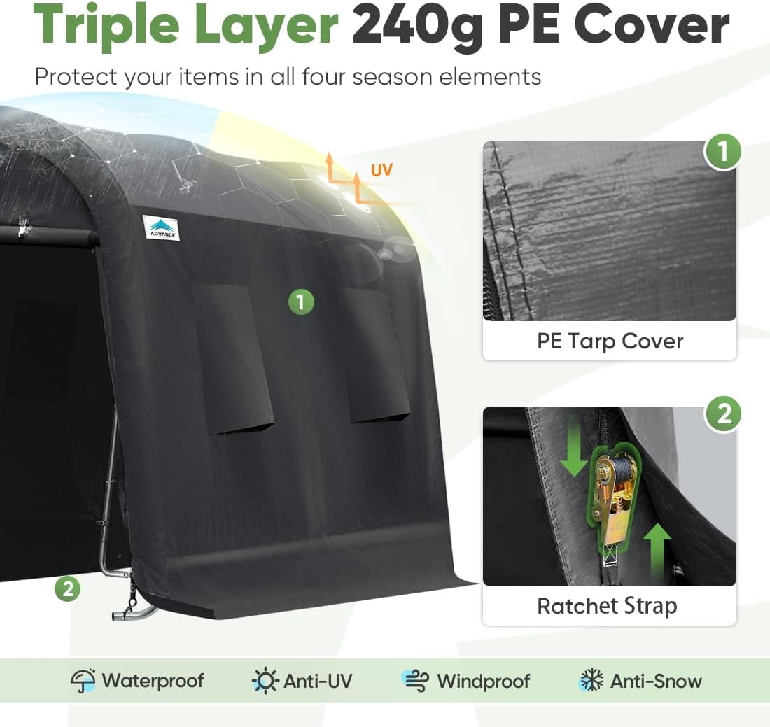 ADVANCE OUTDOOR Upgrade 10 x 15 ft portable storage shelter is a best choice for your motorcycle and outdoor equipment as a garage. This outdoor storage tents is designed for use in every season and can protect your equipment from sunlight, rain, snow, wind, dust, tree sap and more. Our portable shed could provide you a better shelter than other’s low cheap quality ones, because it is made of better 1-1/2 inch galvanized thicken steel poles and 240g Triple Layer PE Cover, which makes the whole tent much sturdier and more durable. Designed for easy set up and portability, the ADVANCE OUTDOOR storage shelter can be a motorcycle shed, storage tent for ATV, bike storage shed, garden and lawn equipment, tools, backyard items, children toys, firewood, ride on lawn mower etc.