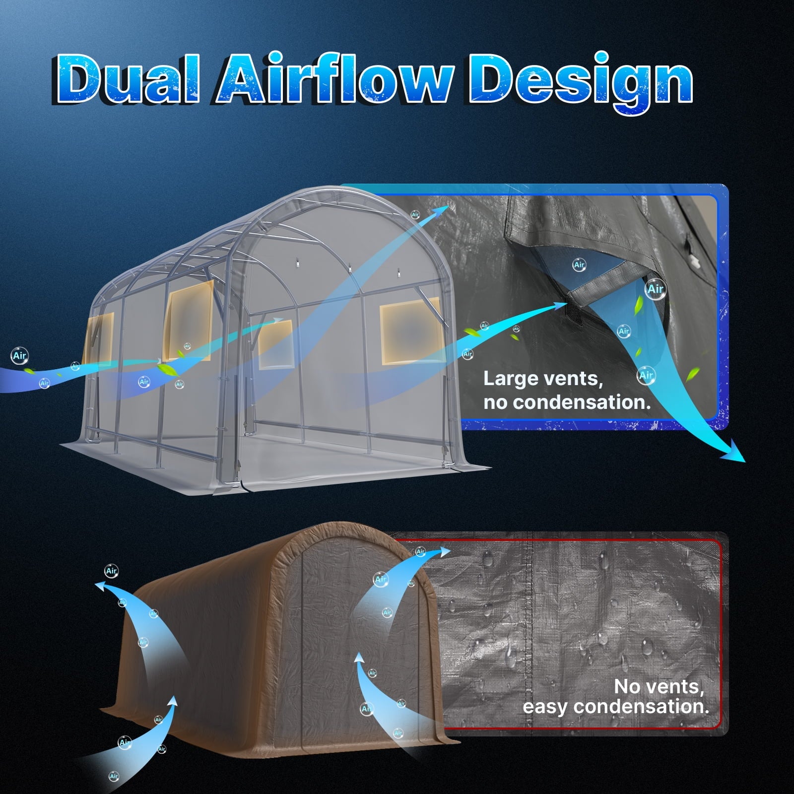 - ✅【Unique Vents Design】► Equipped with double layer vents on each side panel. The vents help with air flowing, prevent moisture, and avoid condensation caused by temperature difference or raining.