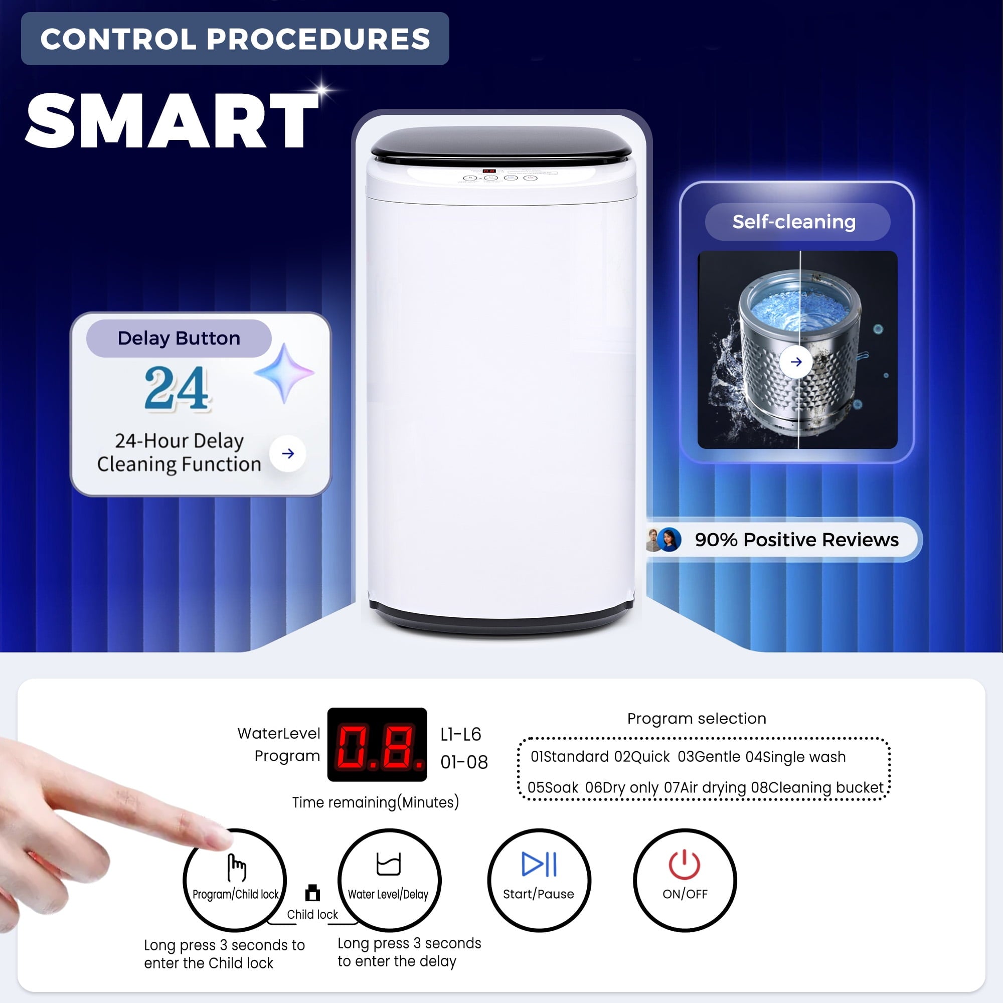 - Self-Clean & Child Lock Safety – Hygienic tub clean cycle plus child lock for added protection.