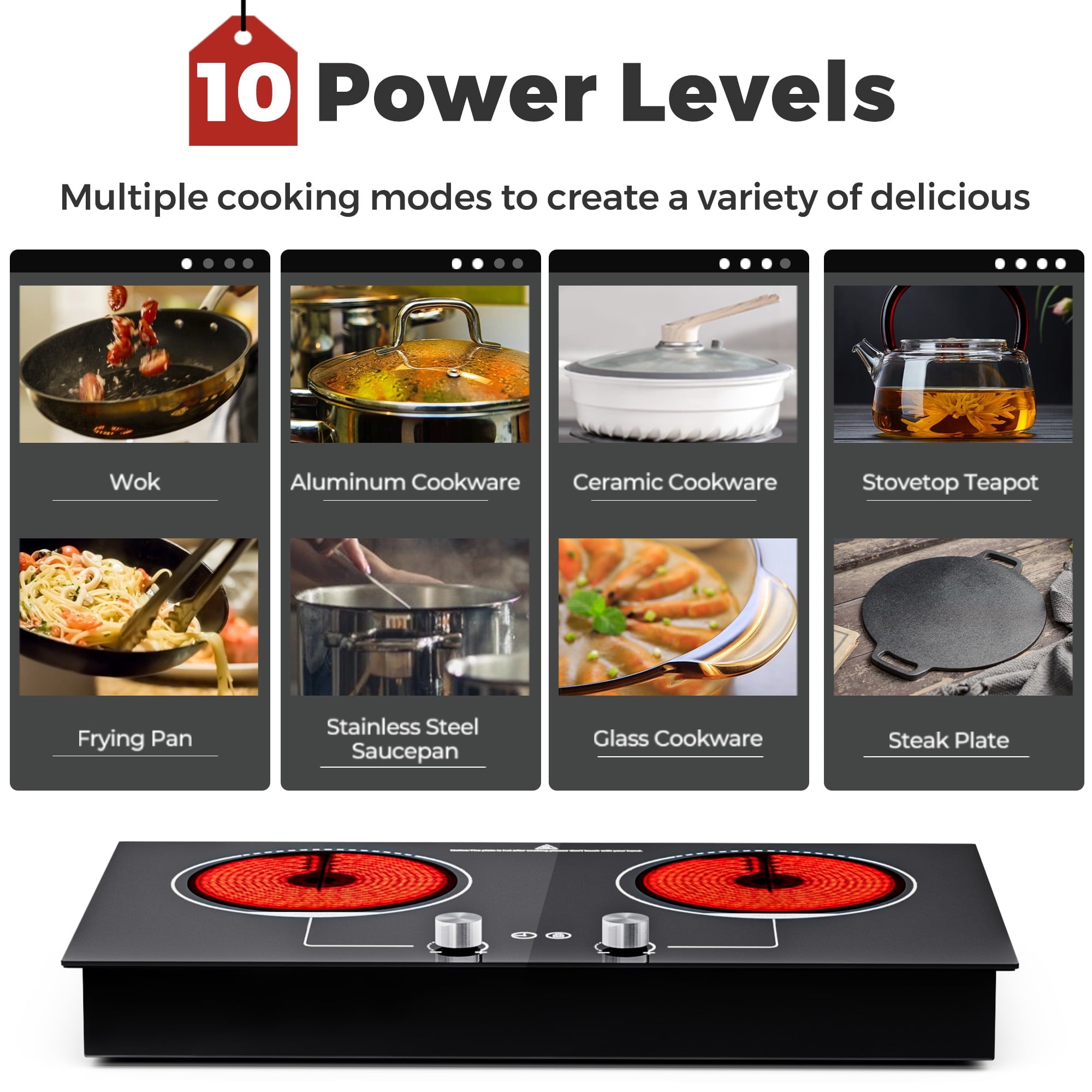 - 【10 Power Levels Electric Cooktop Head】The electric stove has 2 burners 10 power levels, whether it is braised, fried, stewed, or steamed, boiled, fried, roasted, the precise temperature changes can be controlled by knobs, 2 burner electric cooktop making cooking easy.