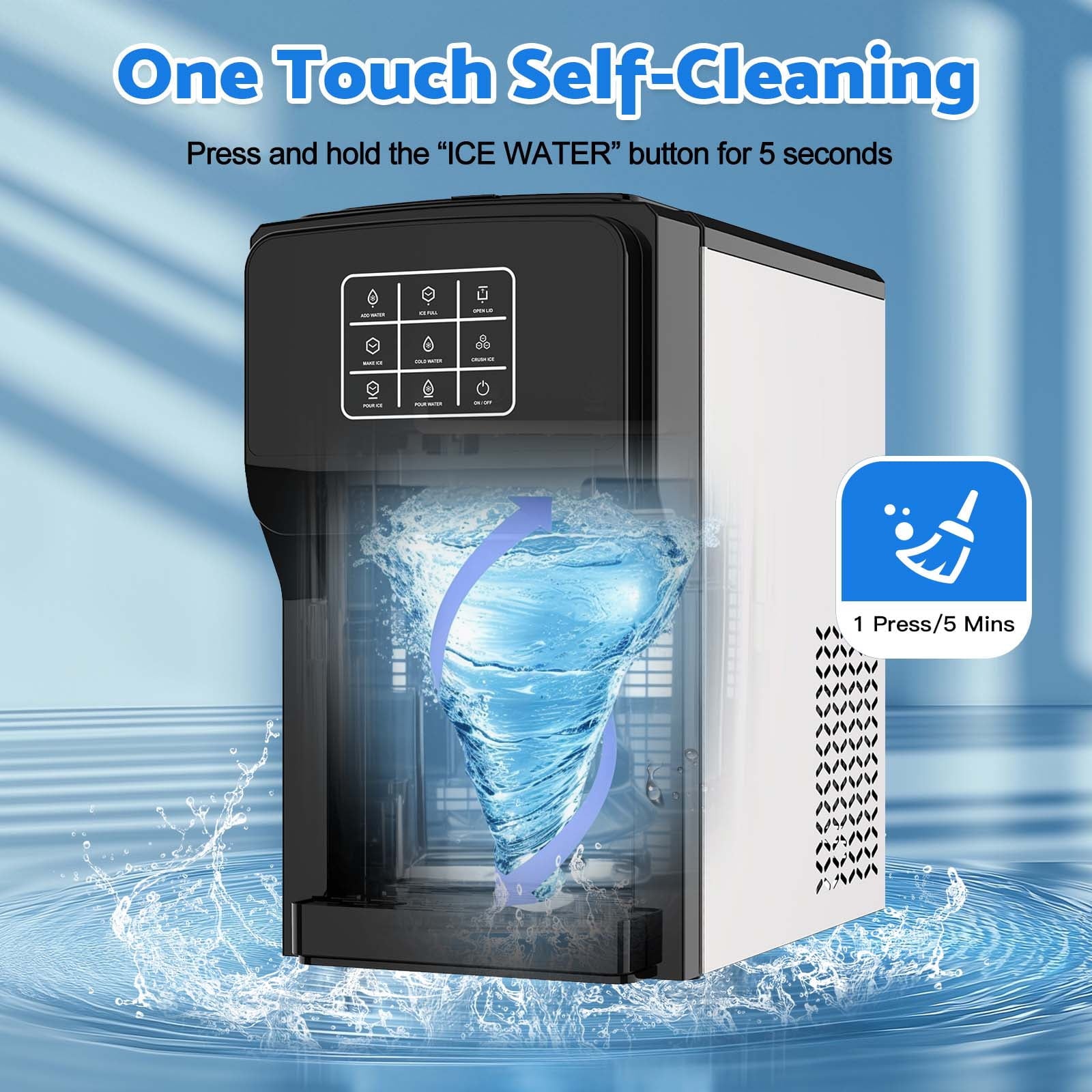 - One-touch self-cleaning mode helps maintain hygiene. Simply press and hold the “Ice Water” button for 5 seconds to activate a 5-minute cleaning cycle.