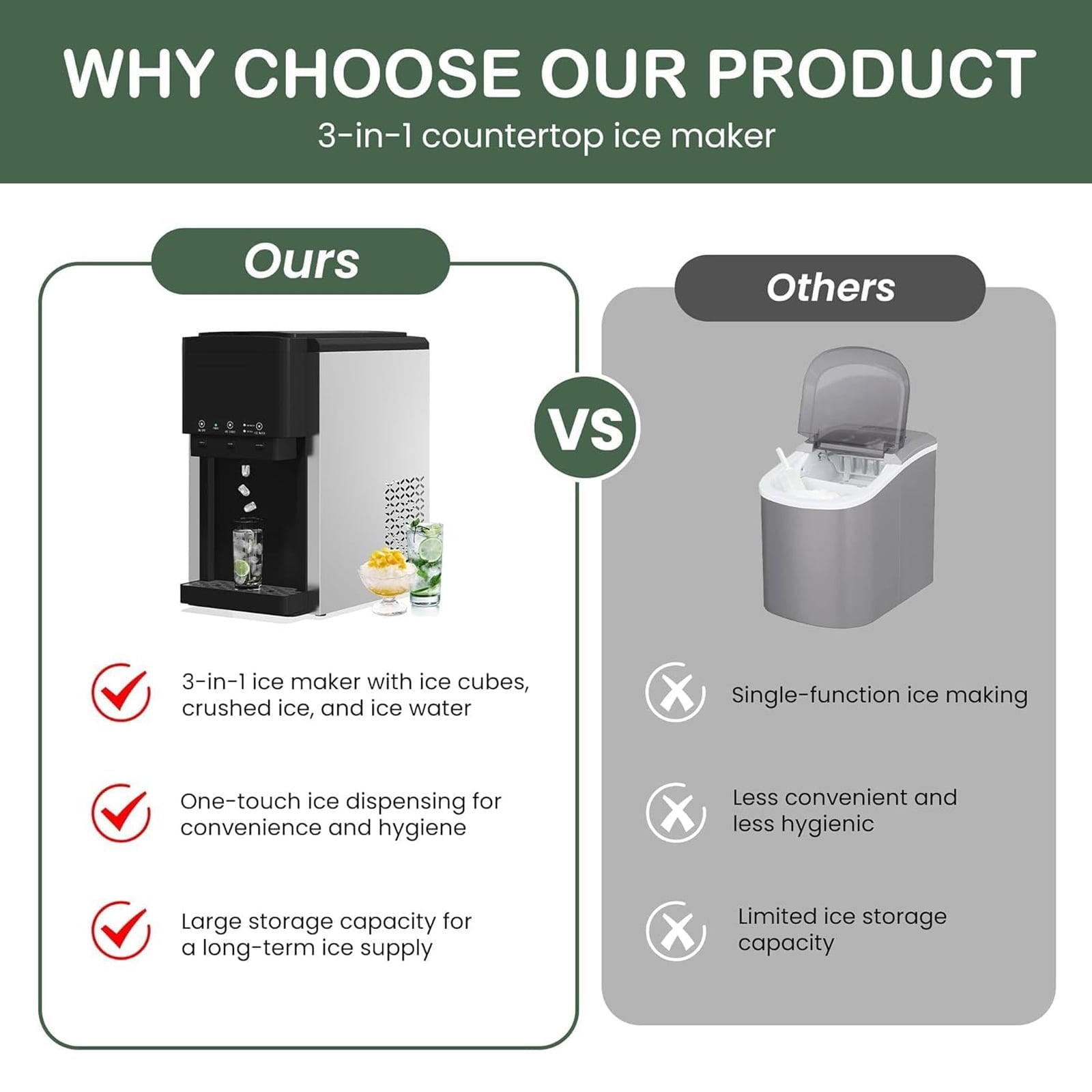 Stay refreshed with the Advwin 3-in-1 Countertop Water Dispenser & Ice Maker! This compact unit delivers bullet ice, crushed ice, and chilled water on demand, producing 44Lbs of ice per day (12 cubes/6min). Features include a 6L water tank, 4Lbs ice storage, and easy operation—ideal for homes, RVs, and gatherings. Save space without sacrificing convenience!