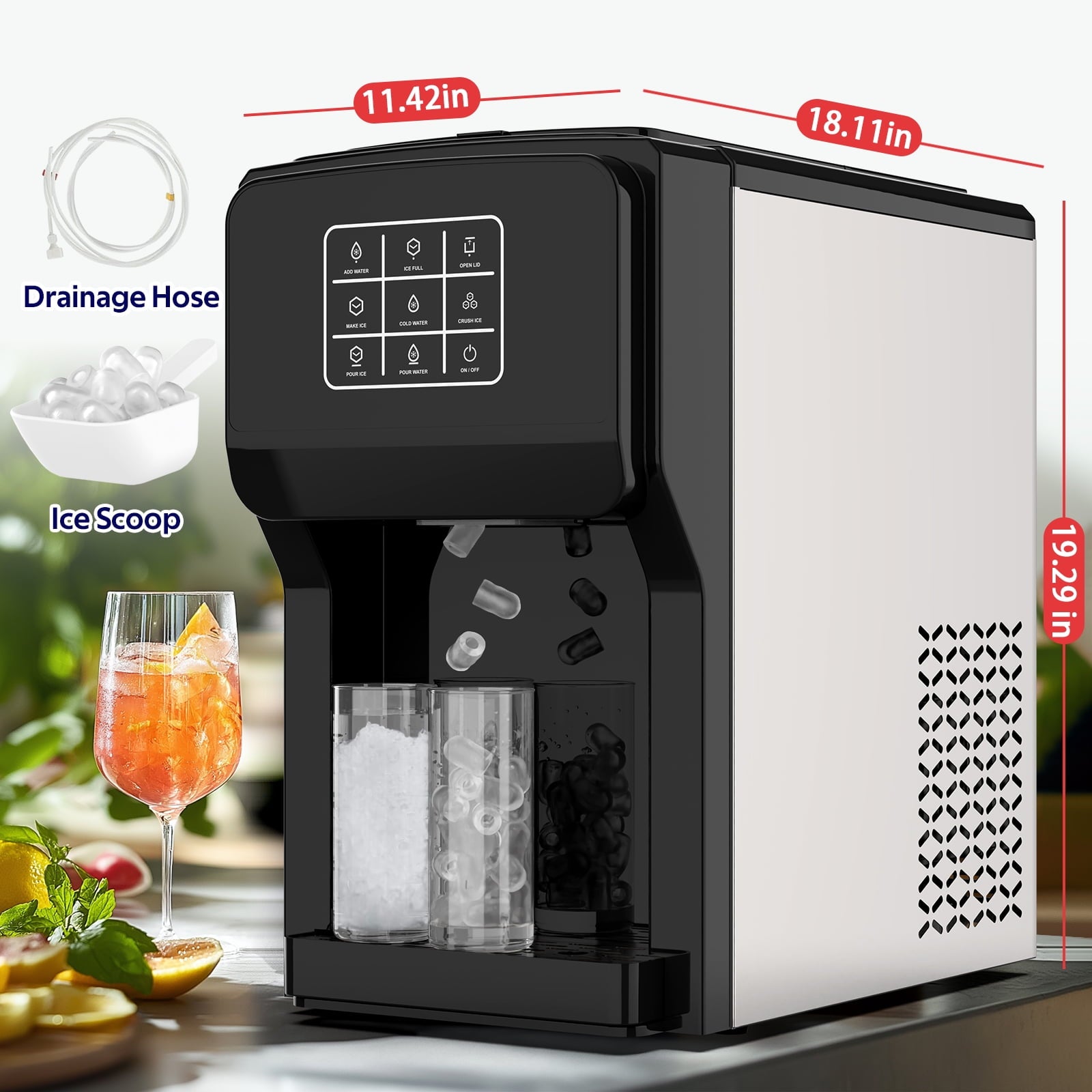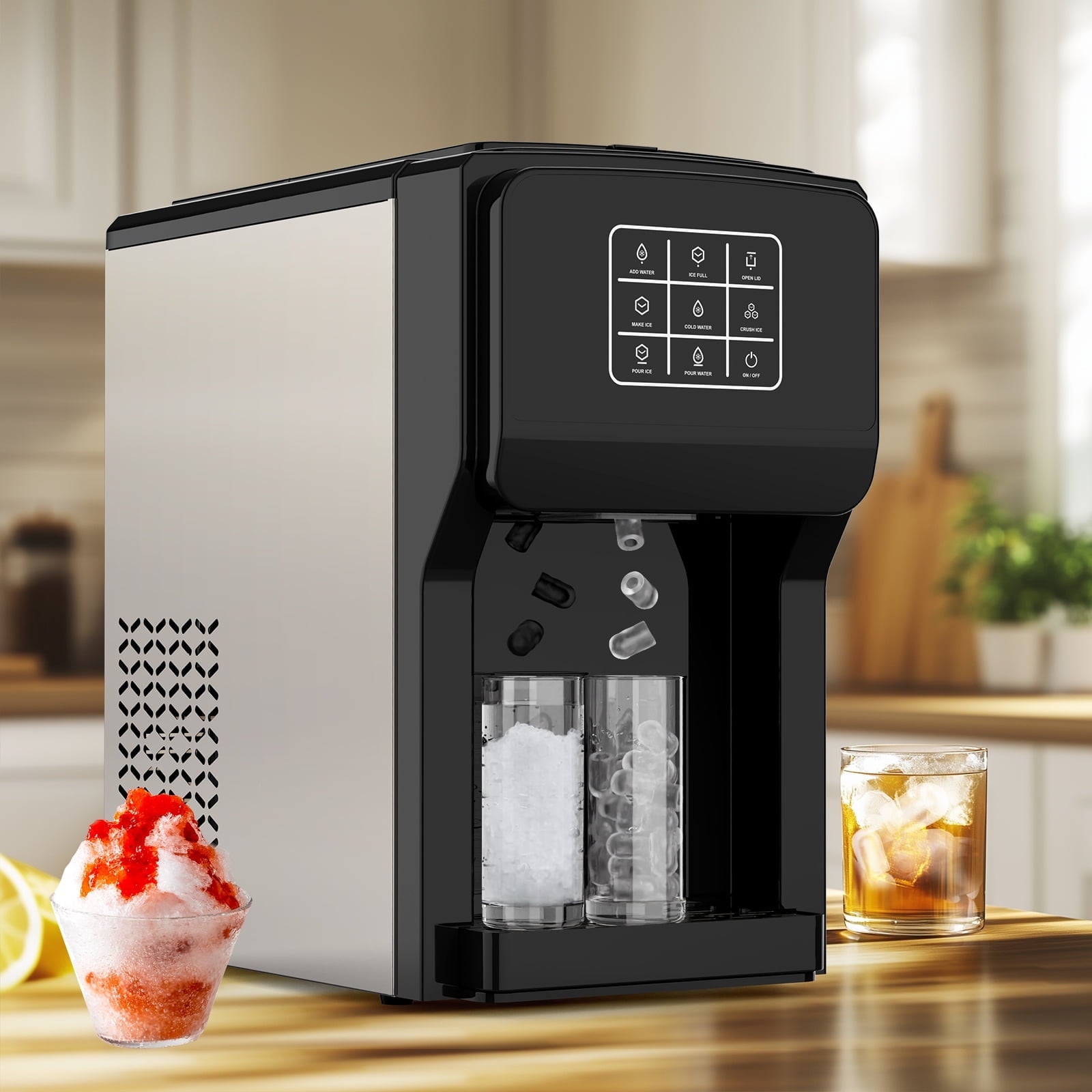 - Produces bullet ice, crushed ice, and dispenses cold water at 39.2°F in one compact appliance—ideal for home, office, or RV use.