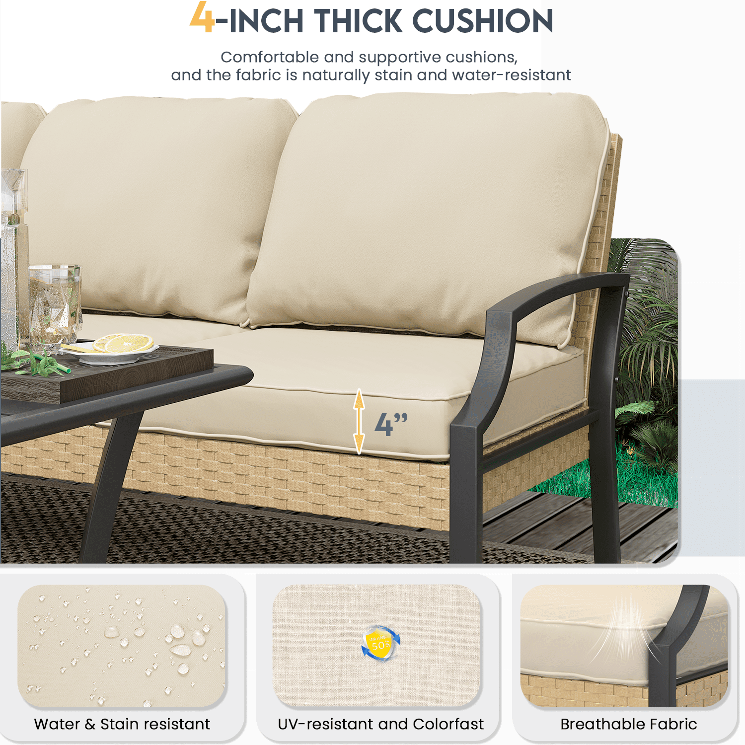 - 【Boho-Chic Versatility】Neutral-toned cushions paired with textured wicker create a coastal-modern aesthetic. Coordinates flawlessly with boho, farmhouse, or contemporary decor. Backed by 1-year warranty against defects – your hassle-free solution for durable outdoor living furniture sets!