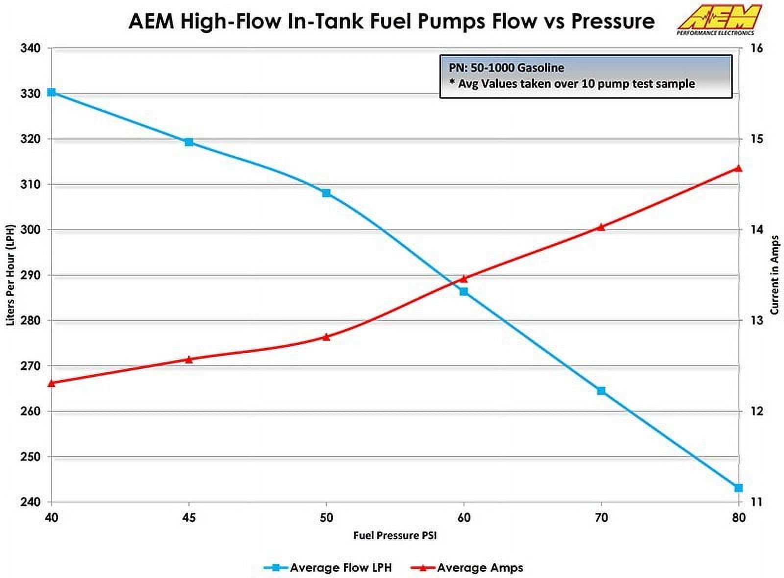 The AEM® 340LPH High Flow In-Tank Fuel Pump (PN 50-1000) flows 340 lph (84 gph) at 40 PSI and is capable of supporting over 1,000 HP at 43 PSI.* Please see the flow curves and current draw vs. fuel pressure graphs on the specs tab for more information.