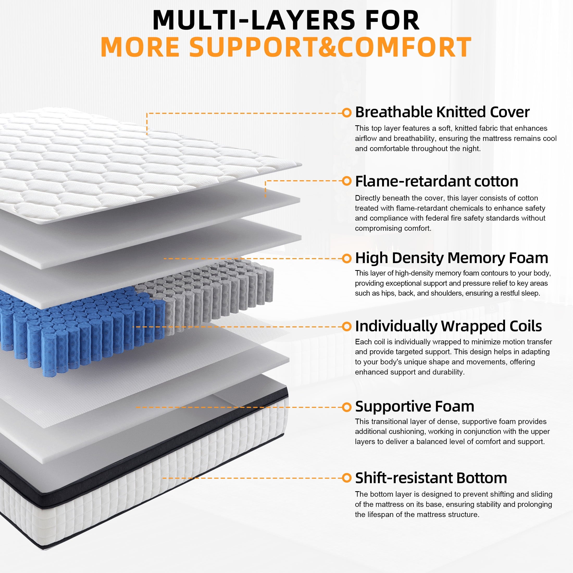 • CertiPUR US Certified: Safe and non-toxic, our mattress is made with CertiPUR US certified foam, ensuring durability, comfort, and safety. Perfect for families, it provides a healthier sleep environment free from harmful chemicals.