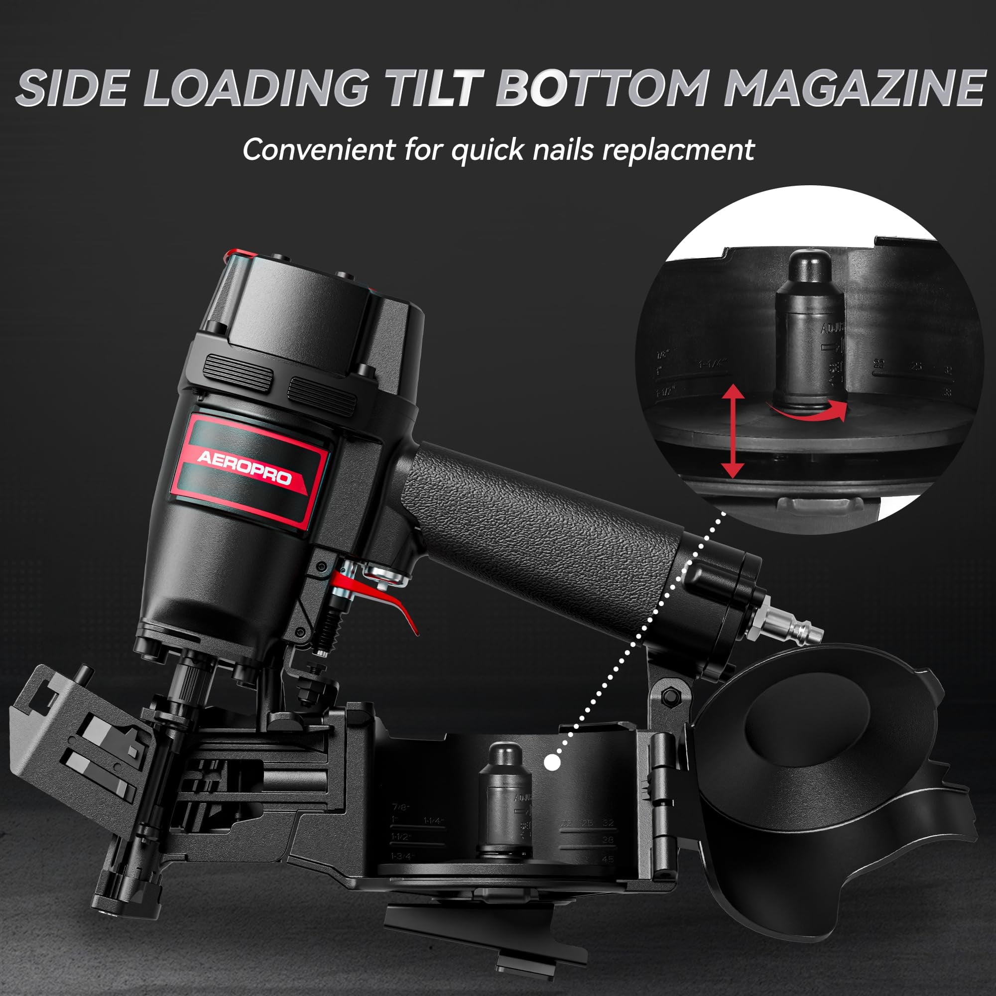 • Crafted with a sleek, all-metal body, this durable roofing nailer is built to withstand the rigors of professional roofing tasks, ensuring a long lifespan and low air consumption without compromising on performance.