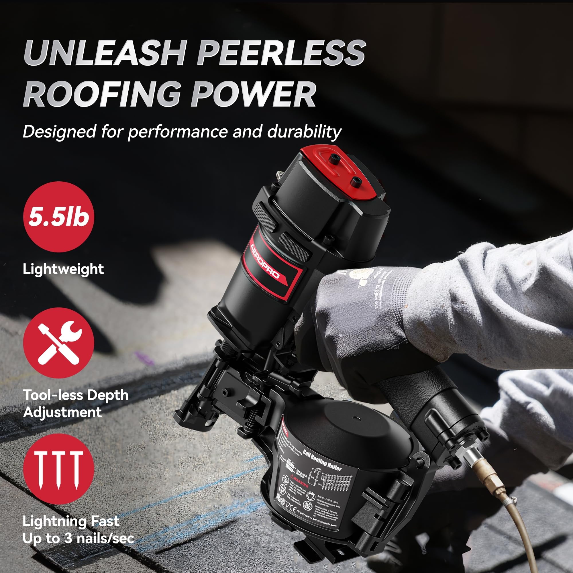 • Ergonomically designed with a rubber grip, this lightweight roofing nailer weighing just 5.5 lbs ensures maximum comfort and control, even when maneuvering over complex angles and prolonged projects.