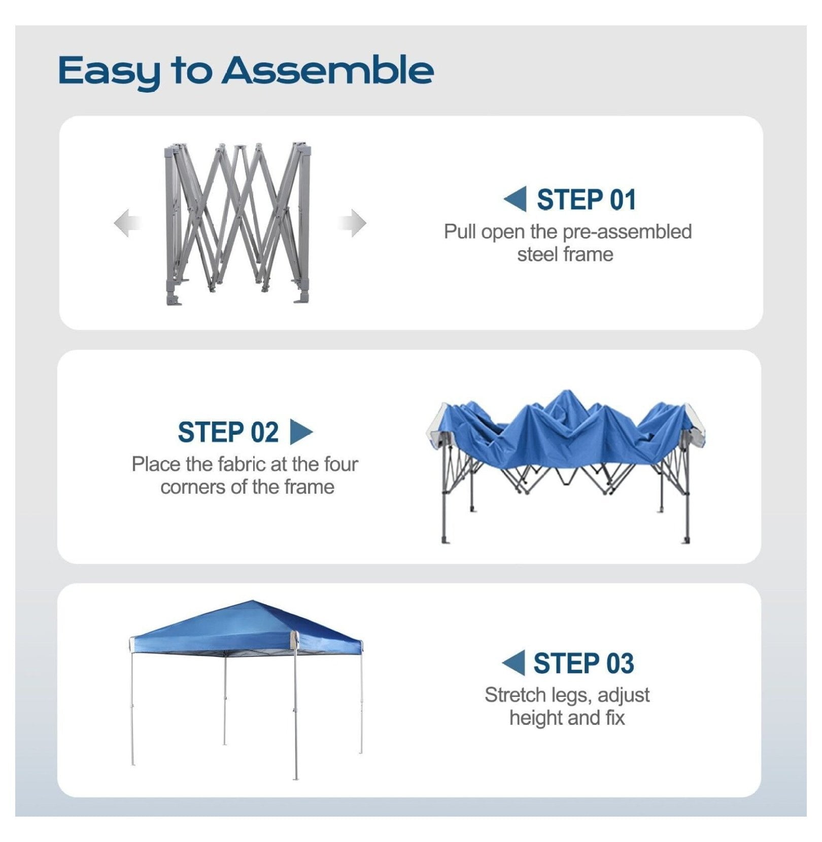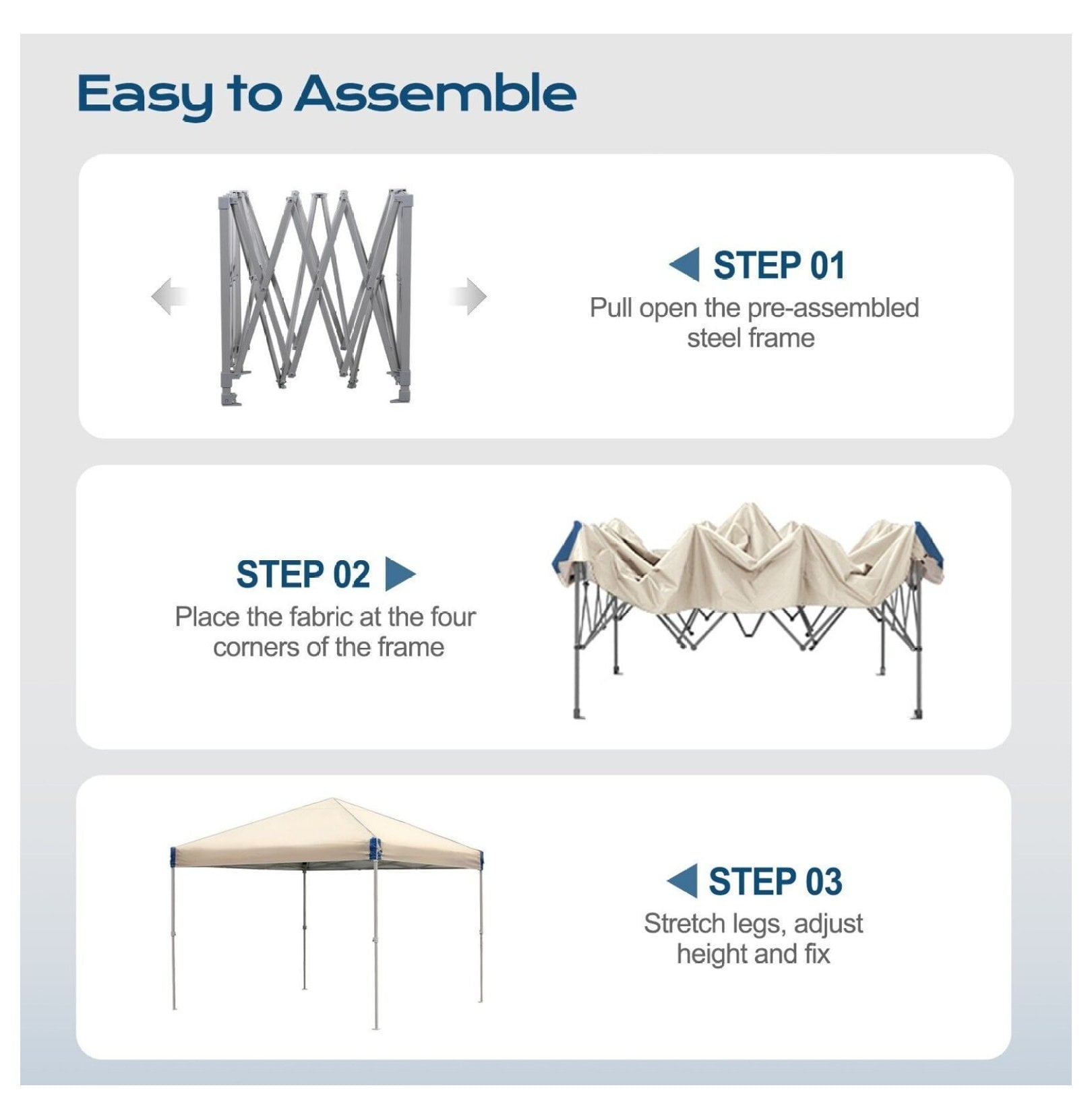 - Easy Assembly: Setting up your canopy is a breeze! Two people can have it ready in just a few minutes. The entire canopy locks into position with a single push, and the fully assembled frame easily unfolds. Simply place the fabric on the frame, stretch the legs, and you’re done.